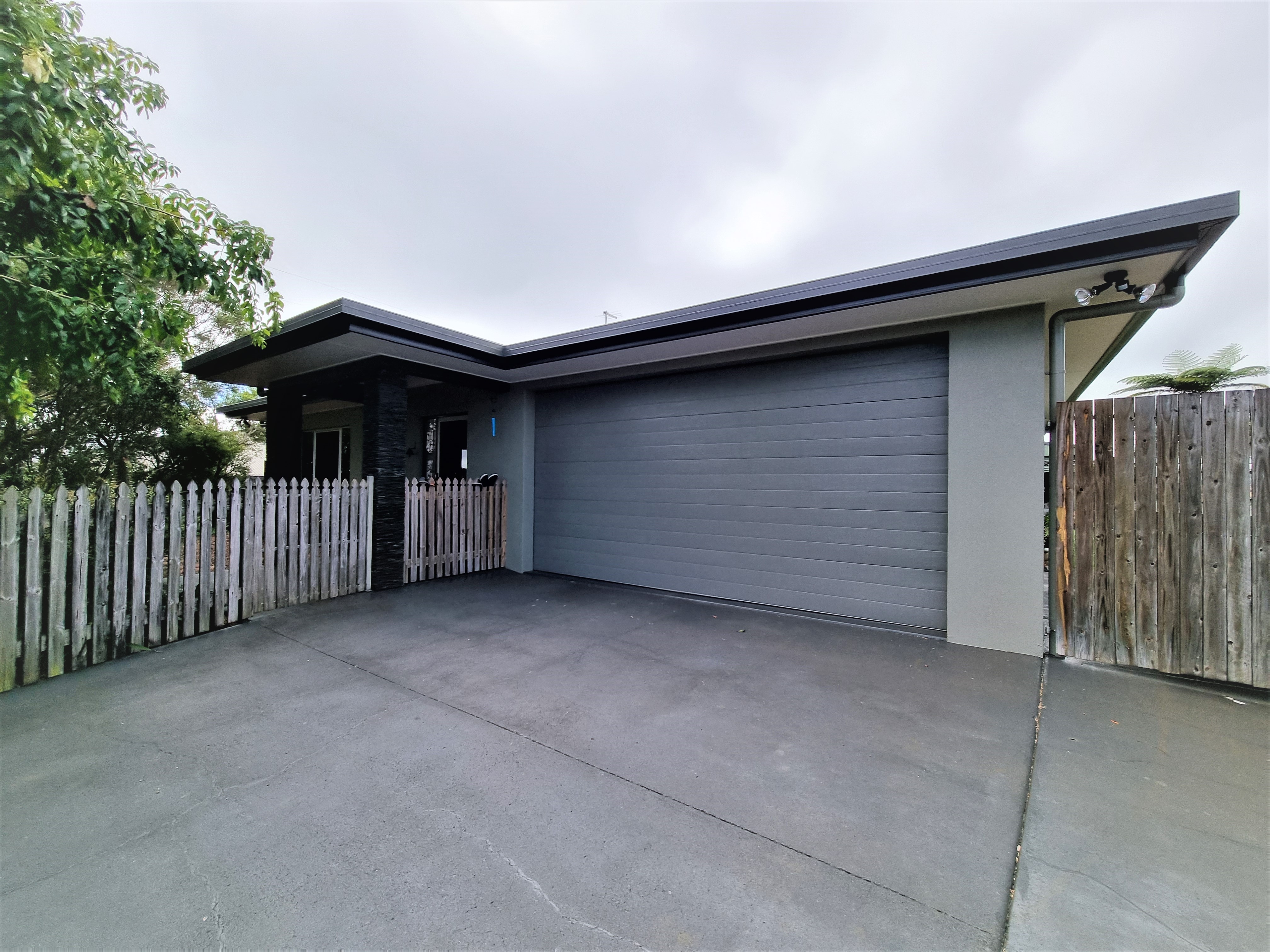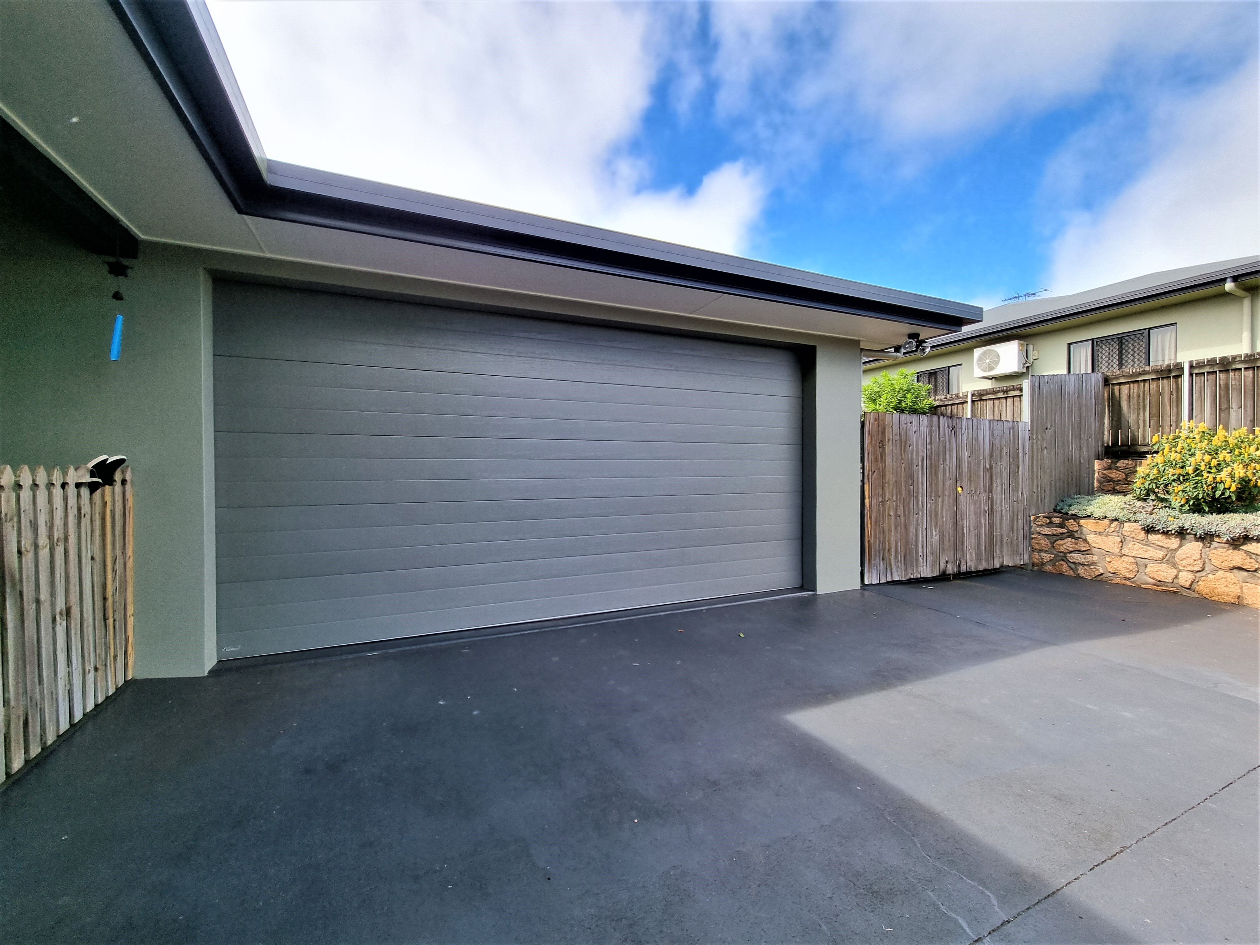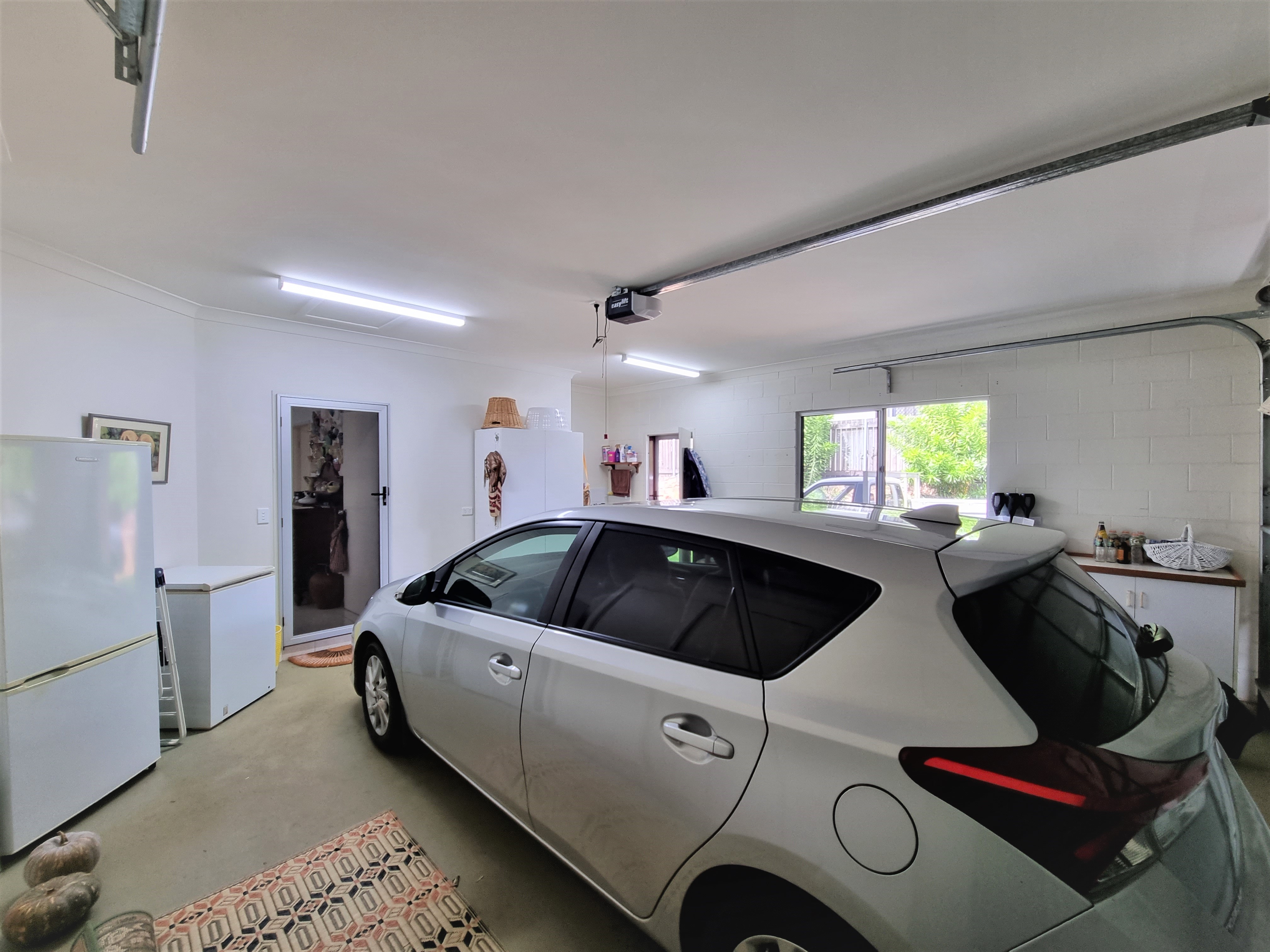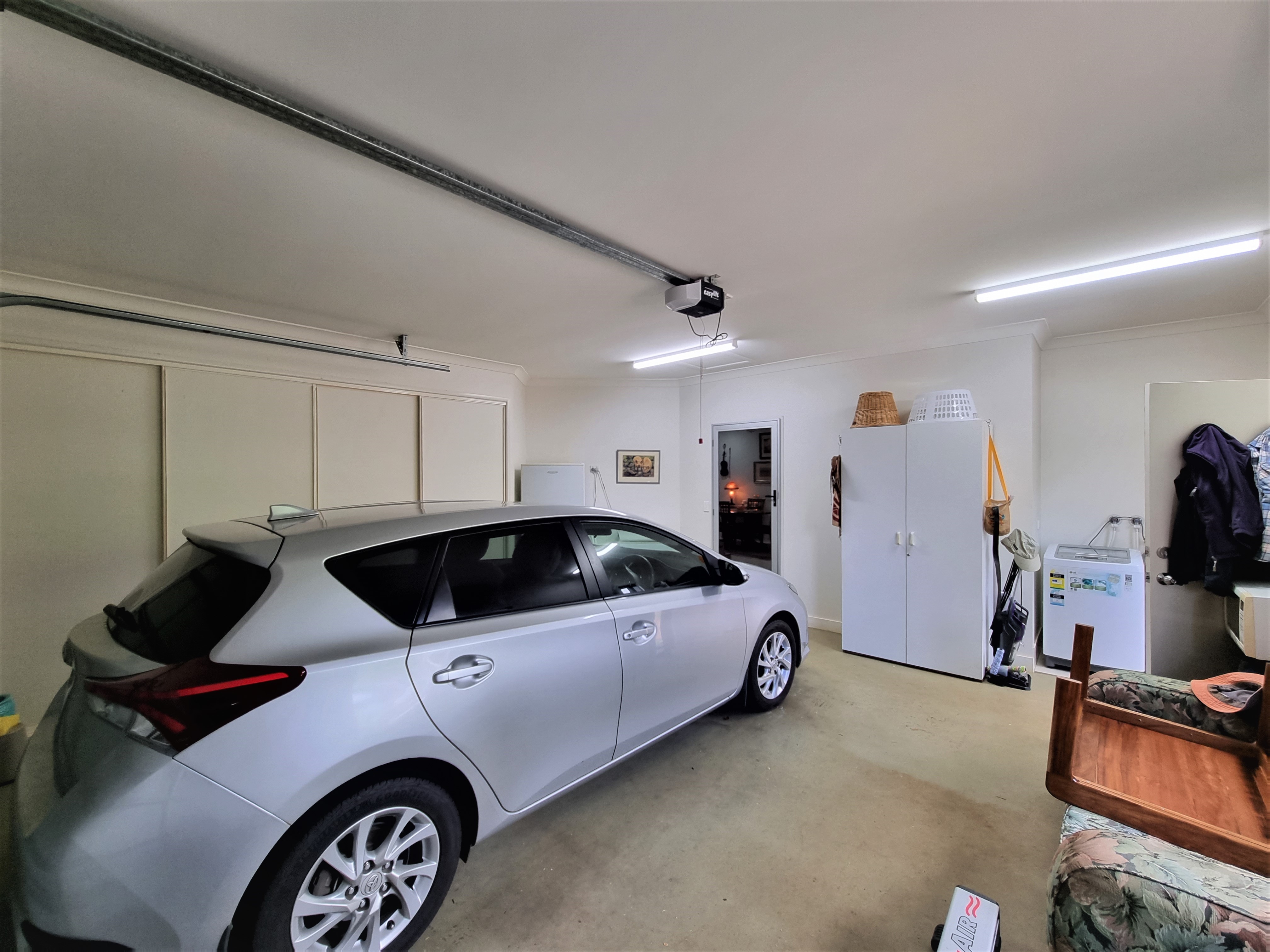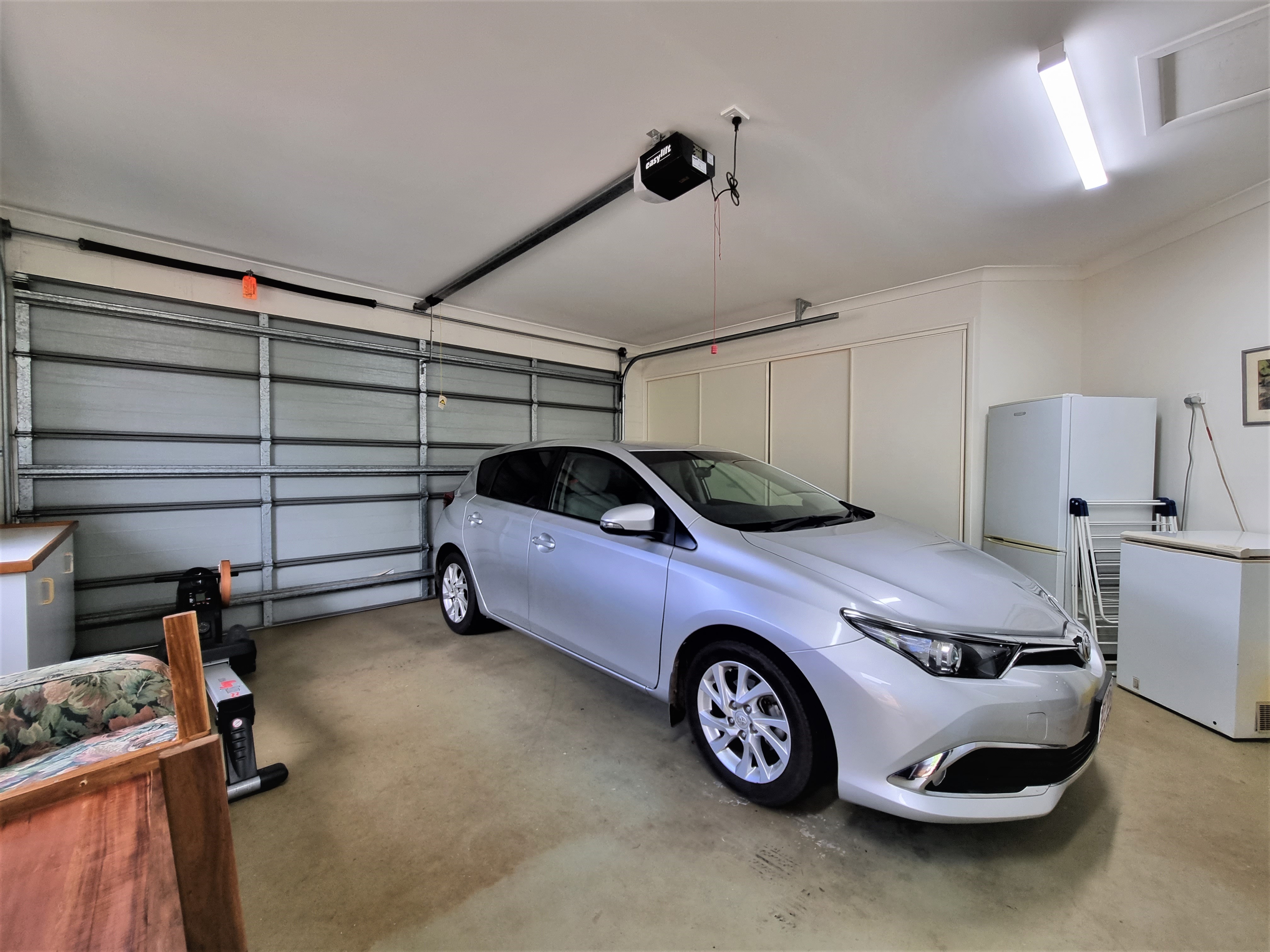 The concrete drive leads to a double garage with a remote roller door and large linen cupboard for extra storage.