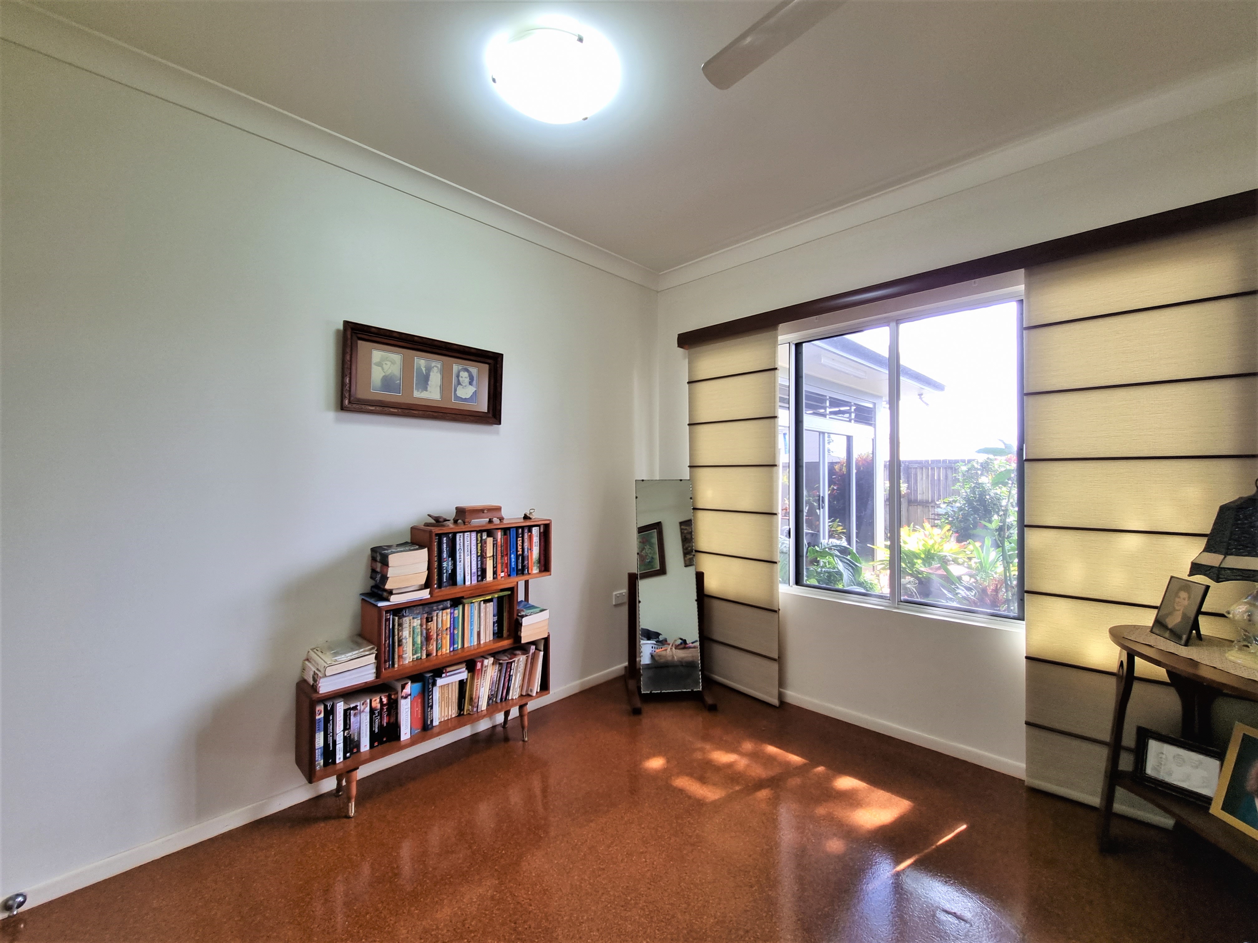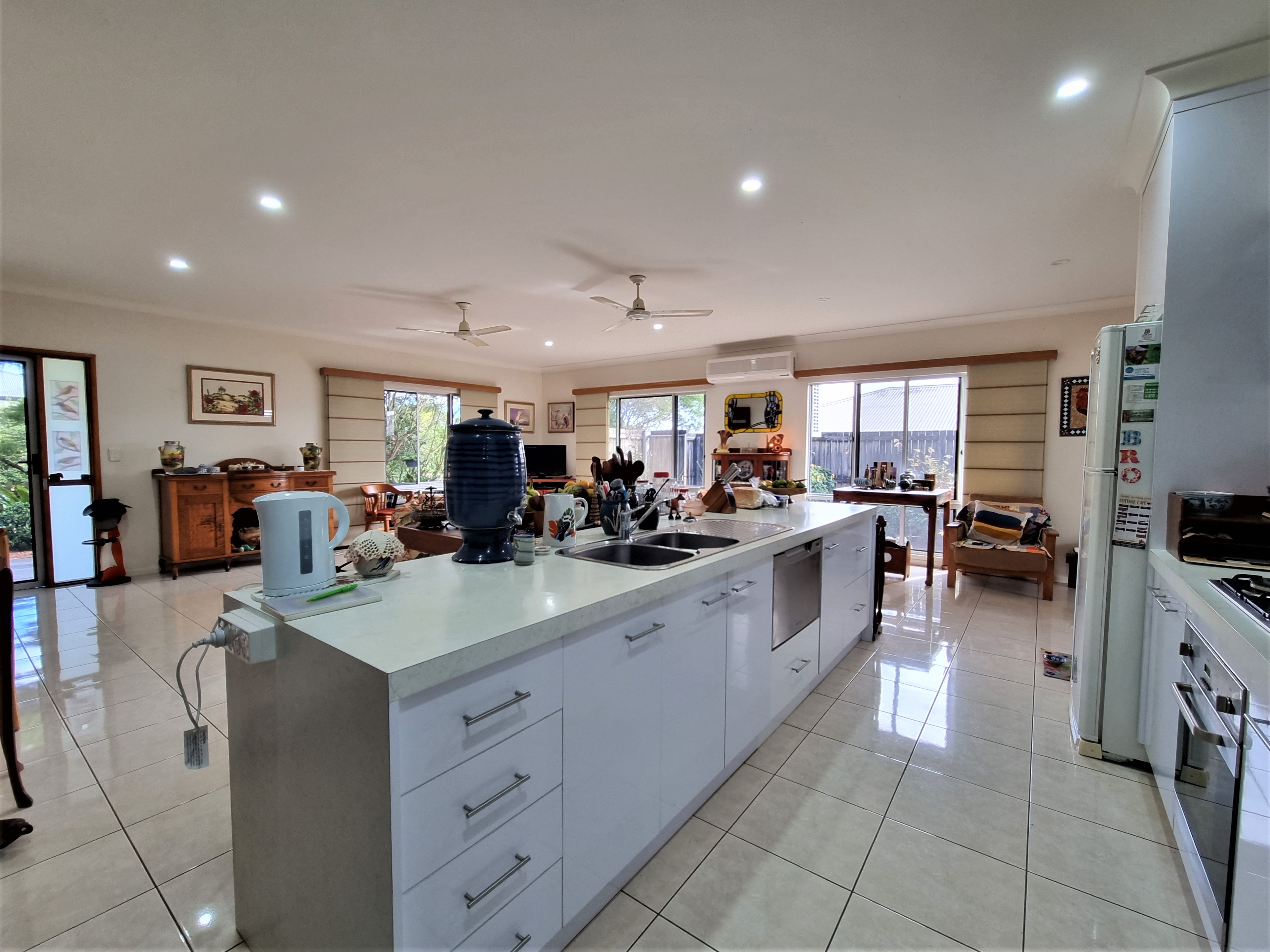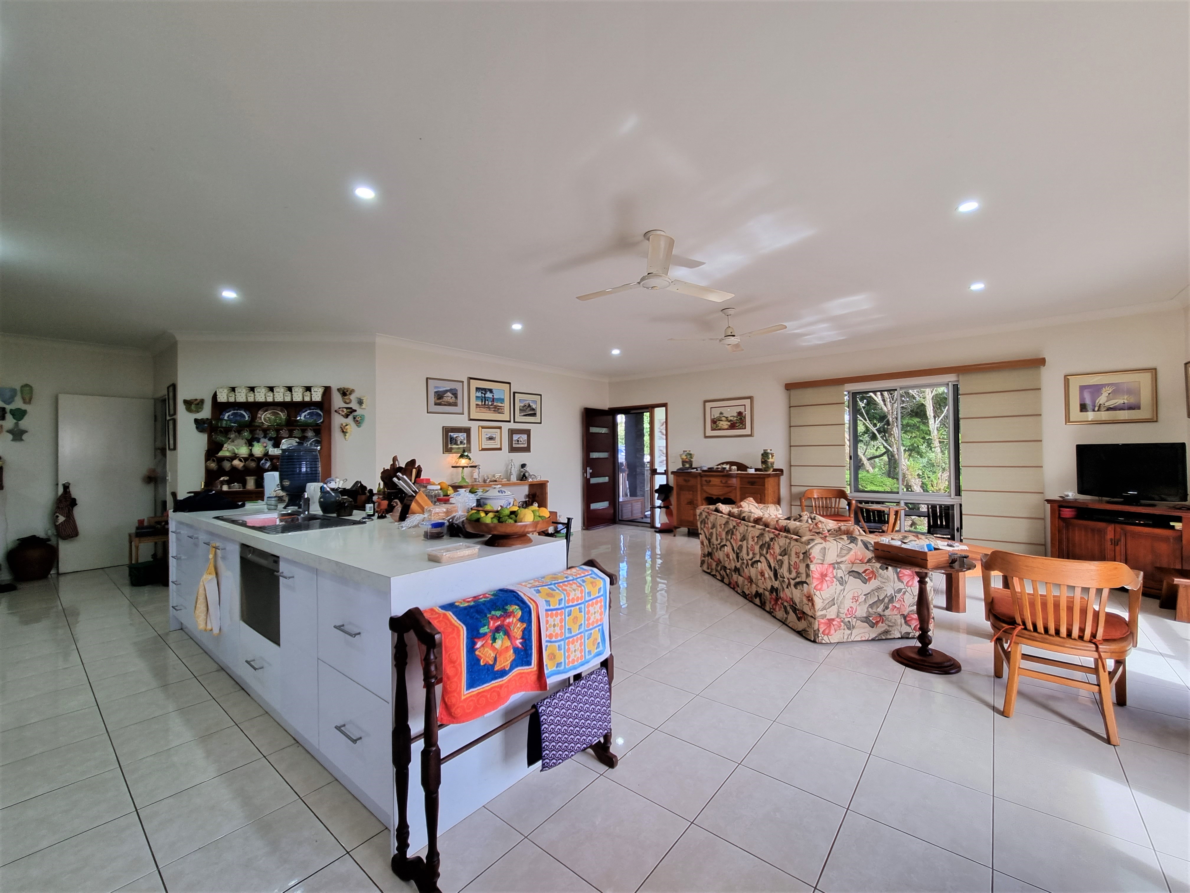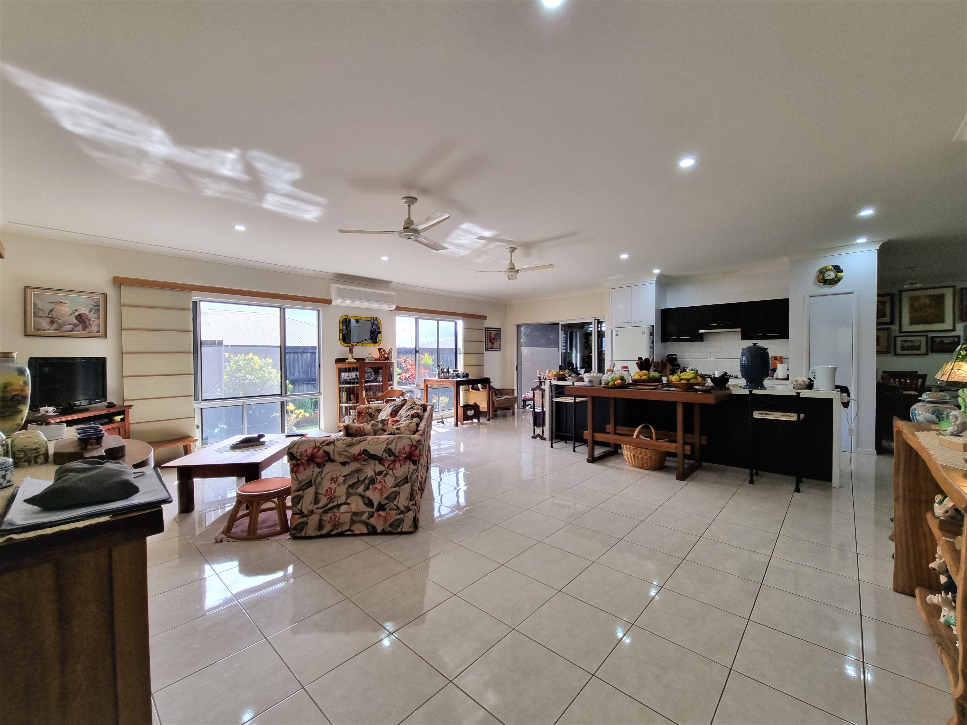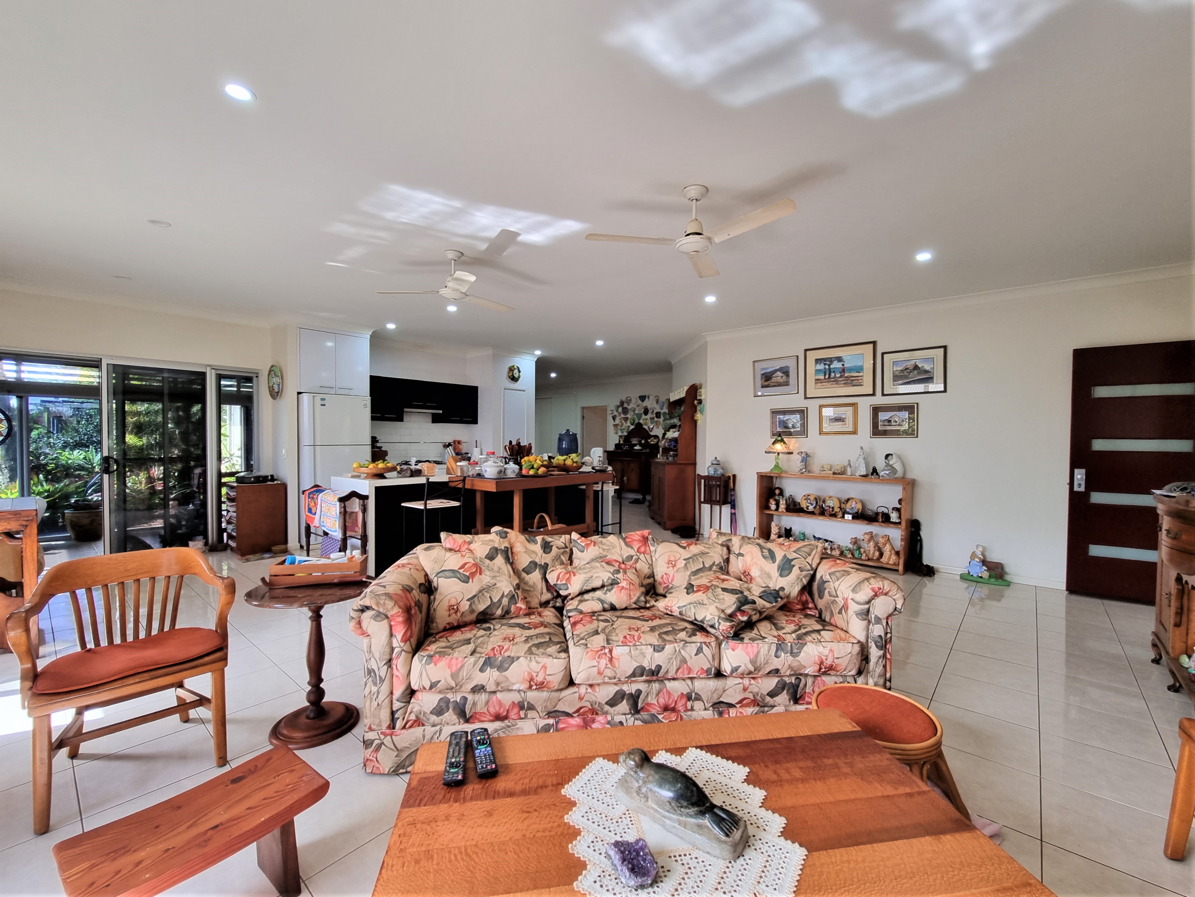 To the left, overlooking the established front garden, the front door opens into the expansive open plan living space with down lights, fan, tiled flooring and an air conditioner.