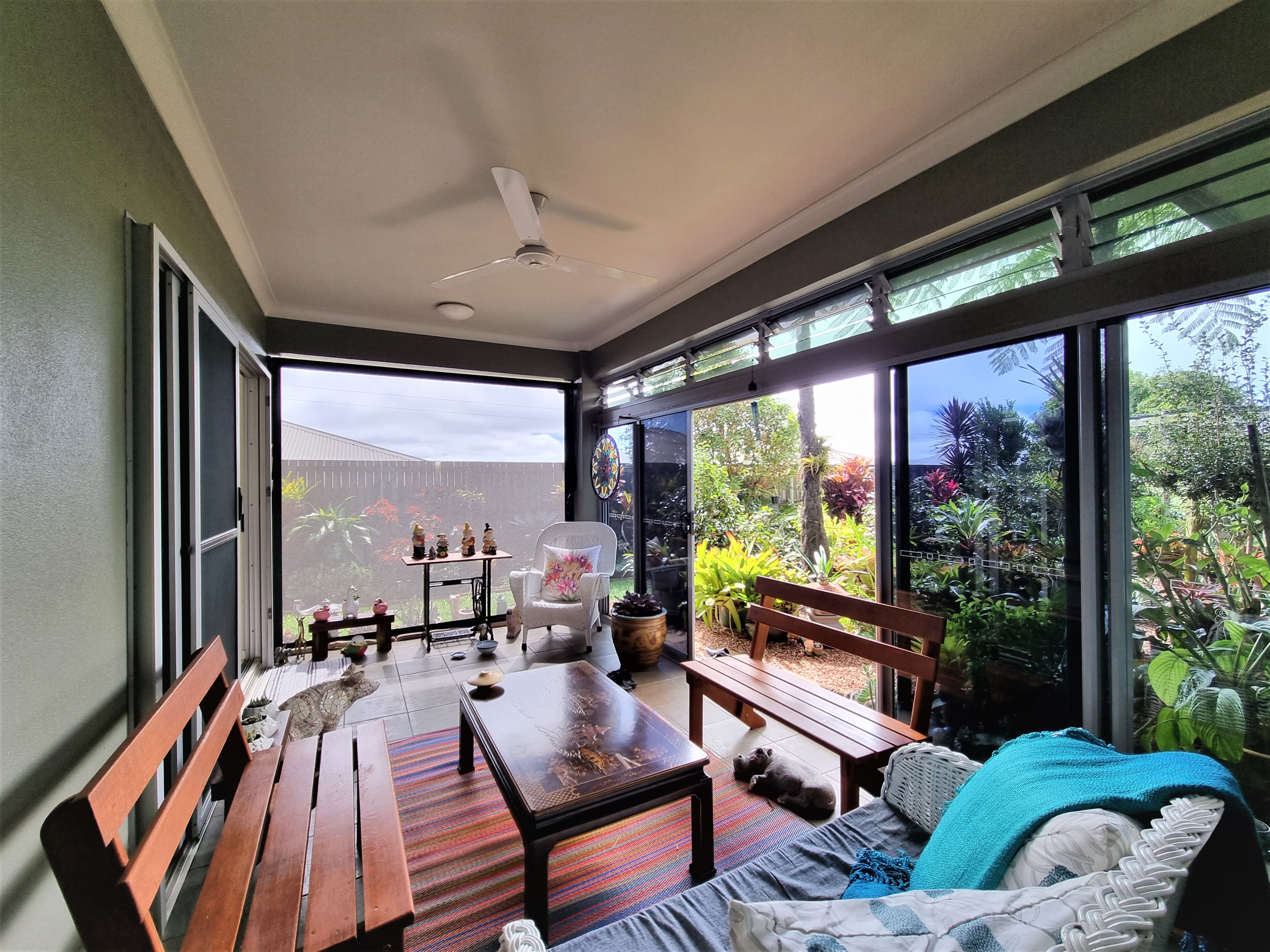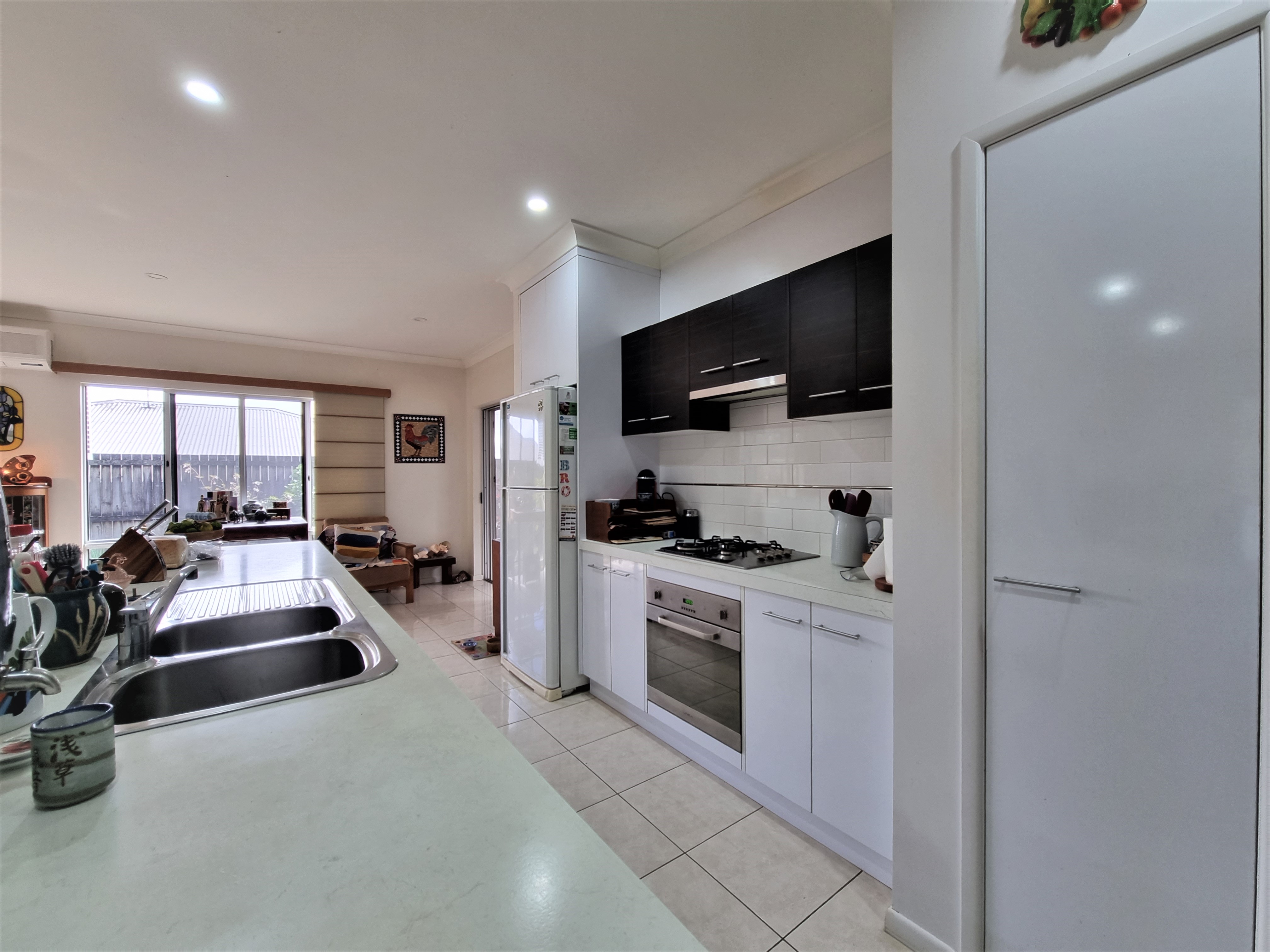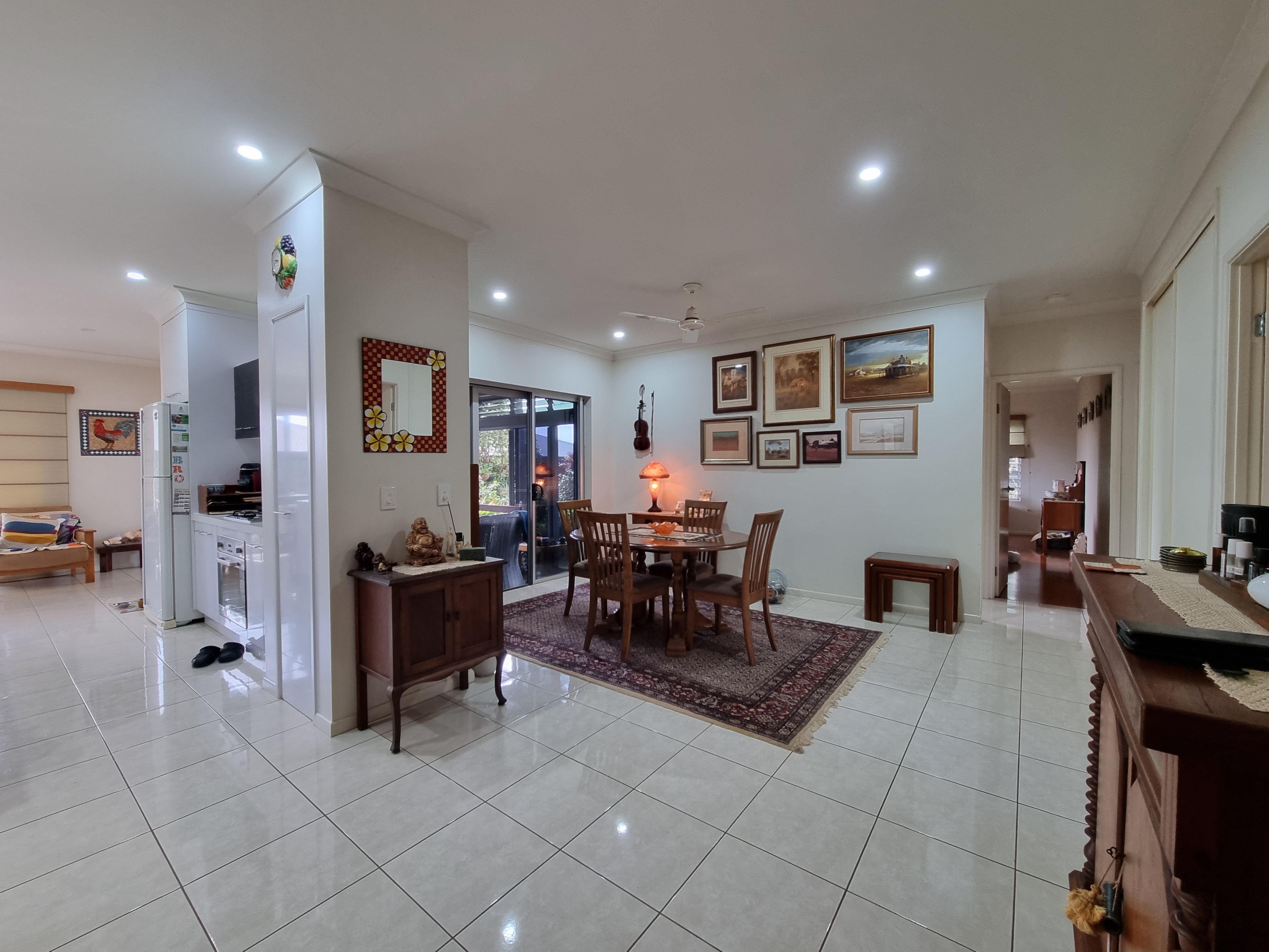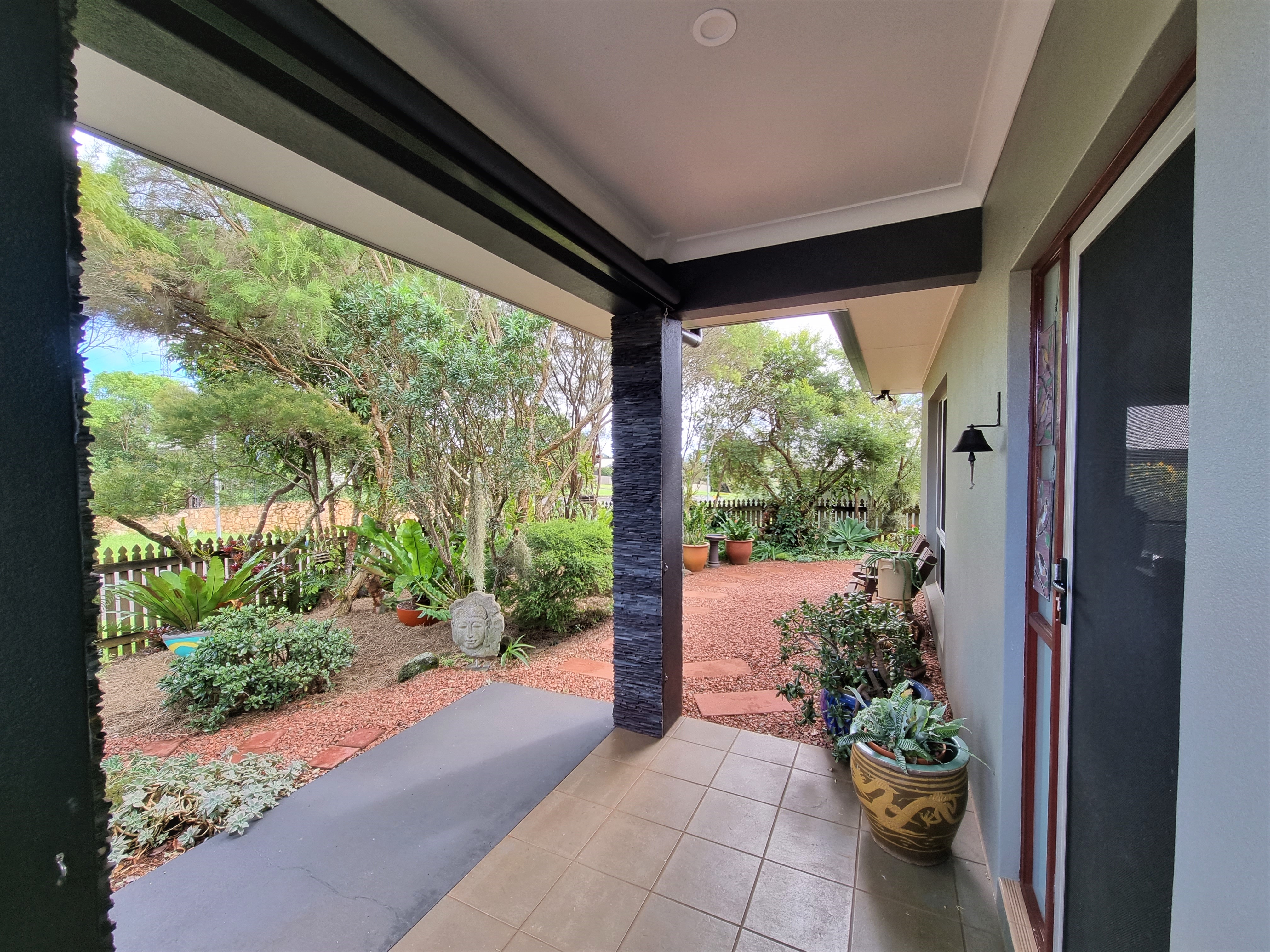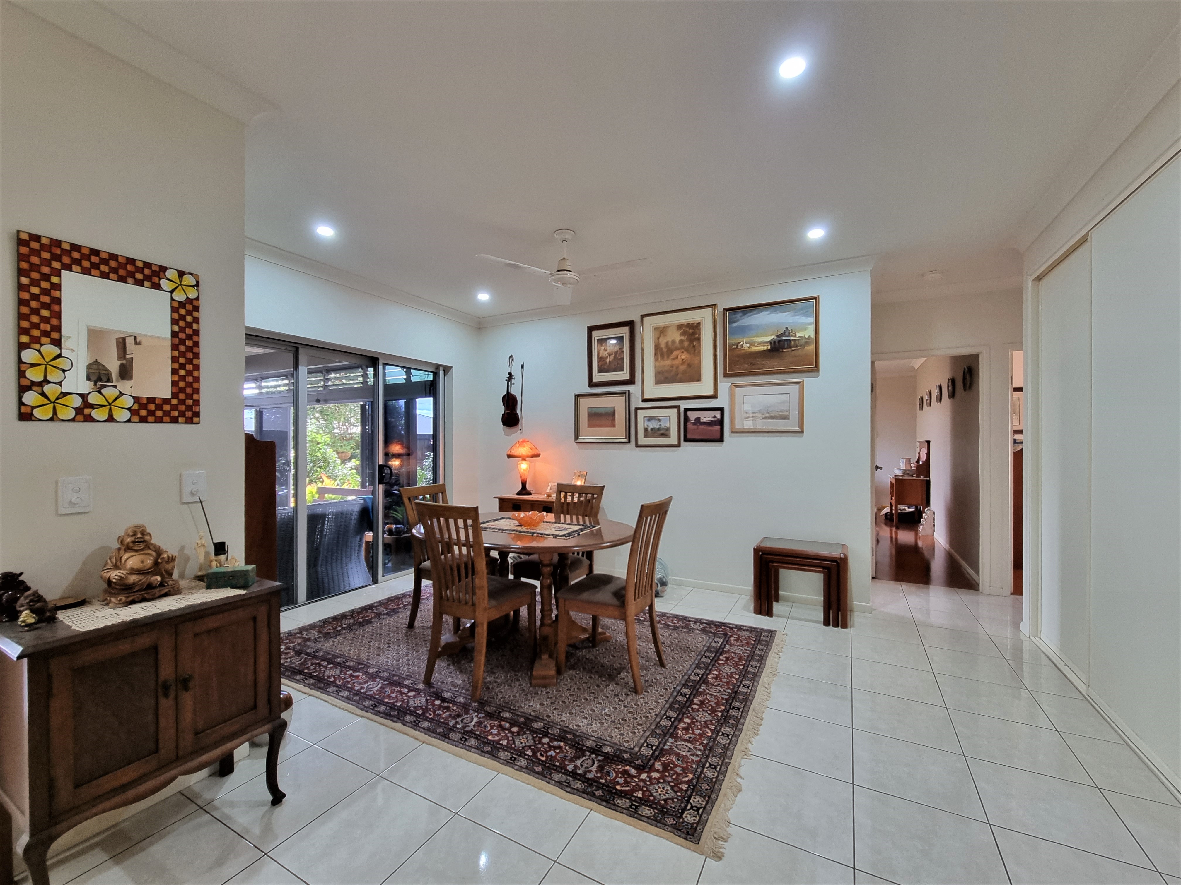 To the left, overlooking the established front garden, the front door opens into the expansive open plan living space with down lights, fan, tiled flooring and an air conditioner.
