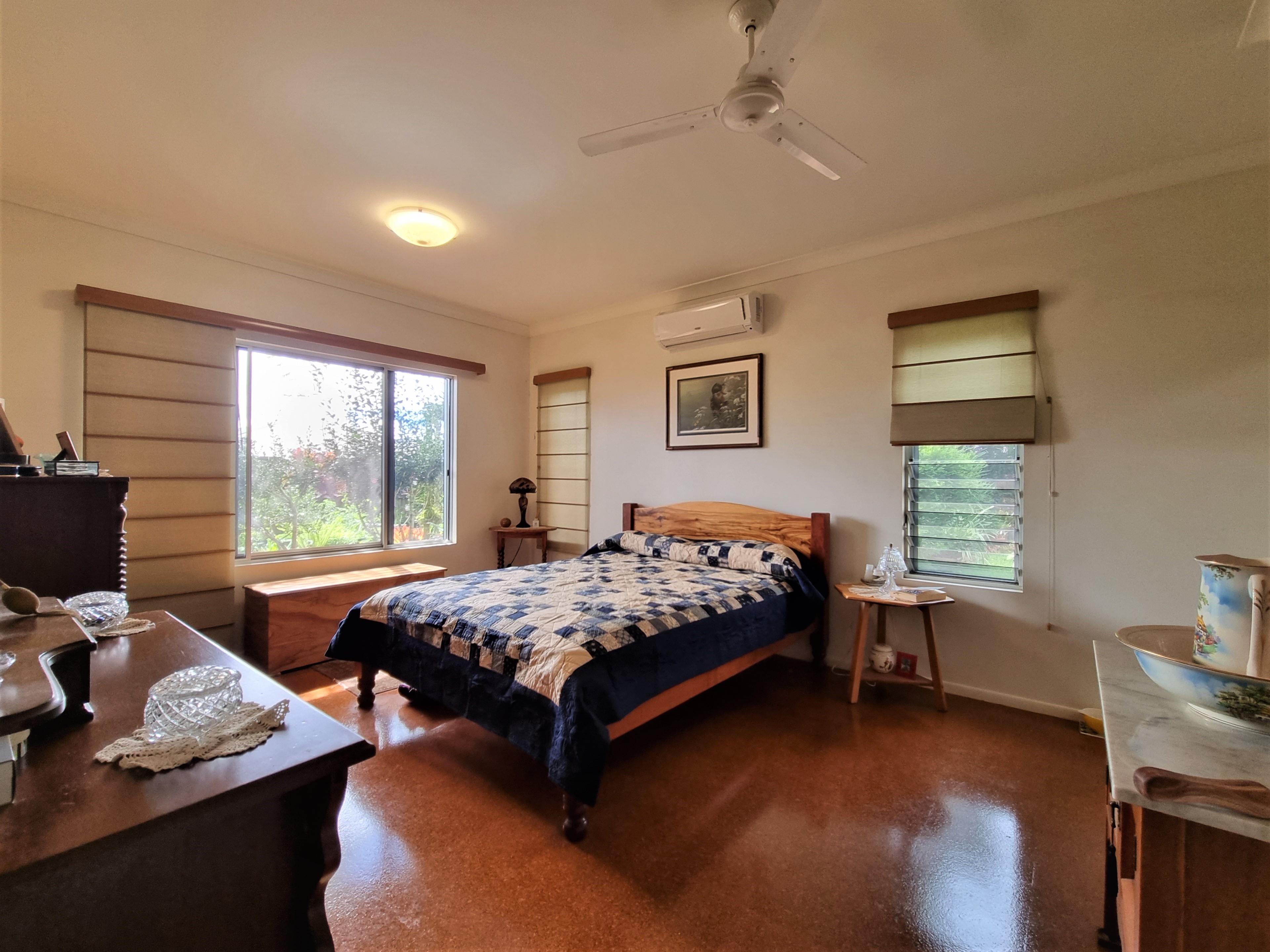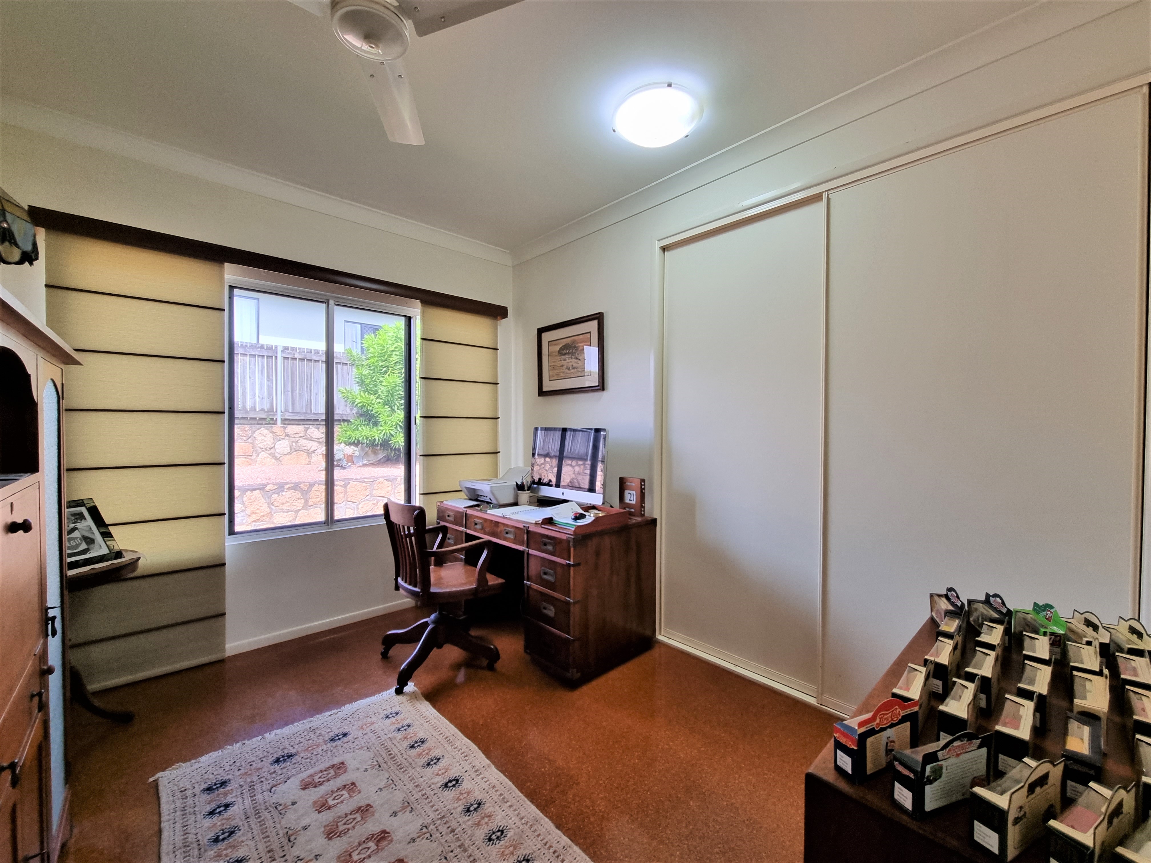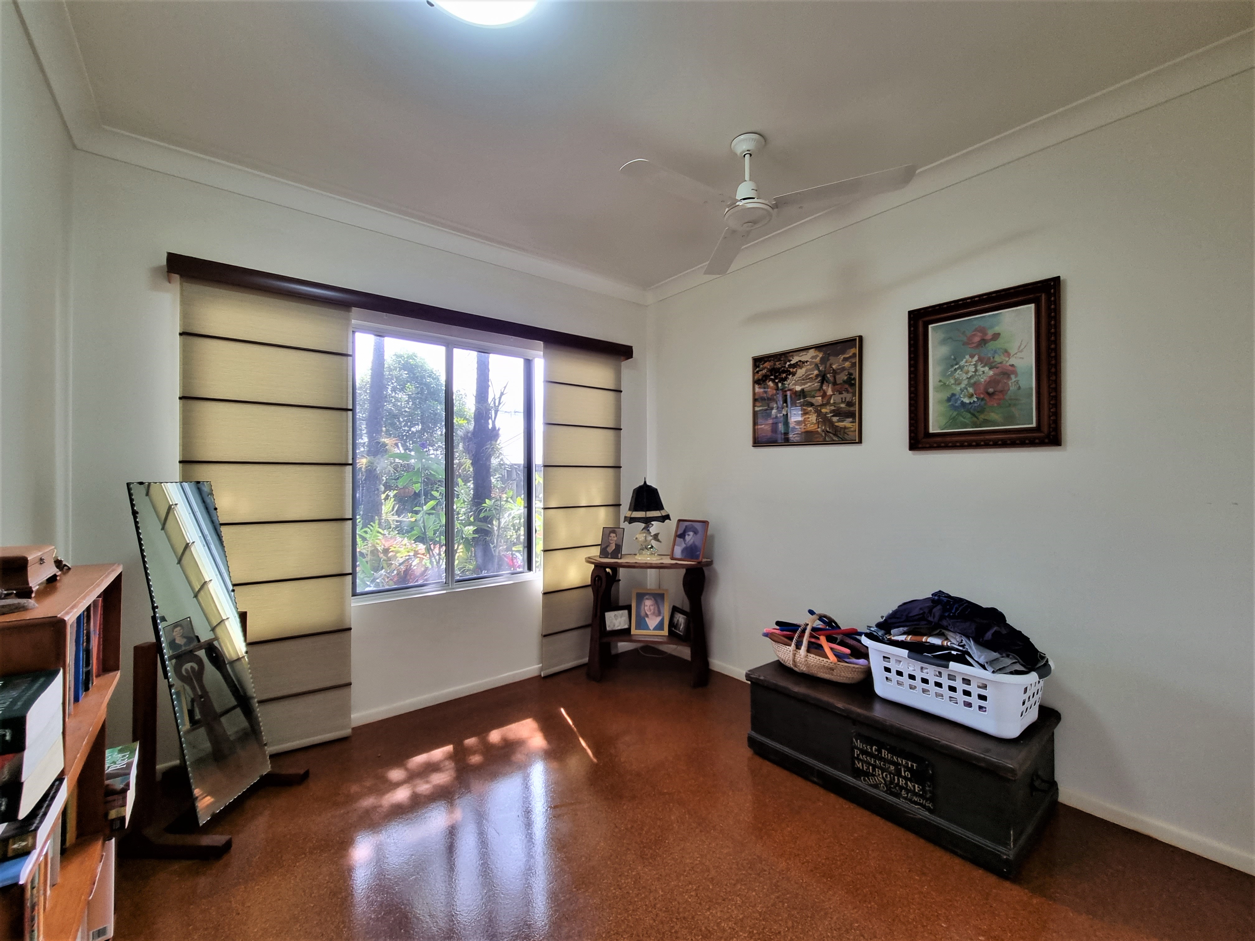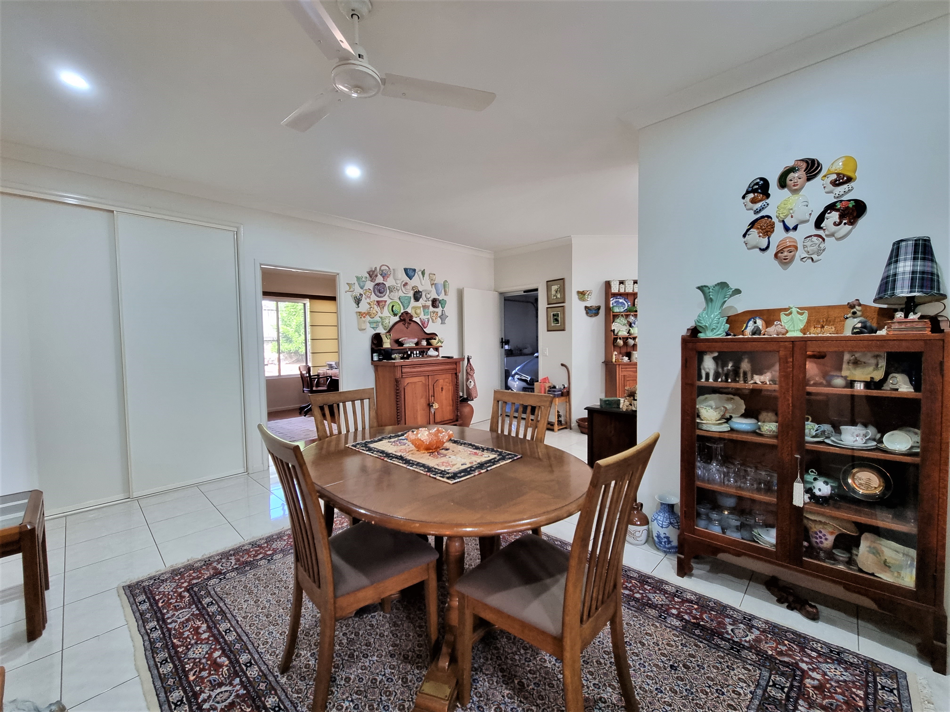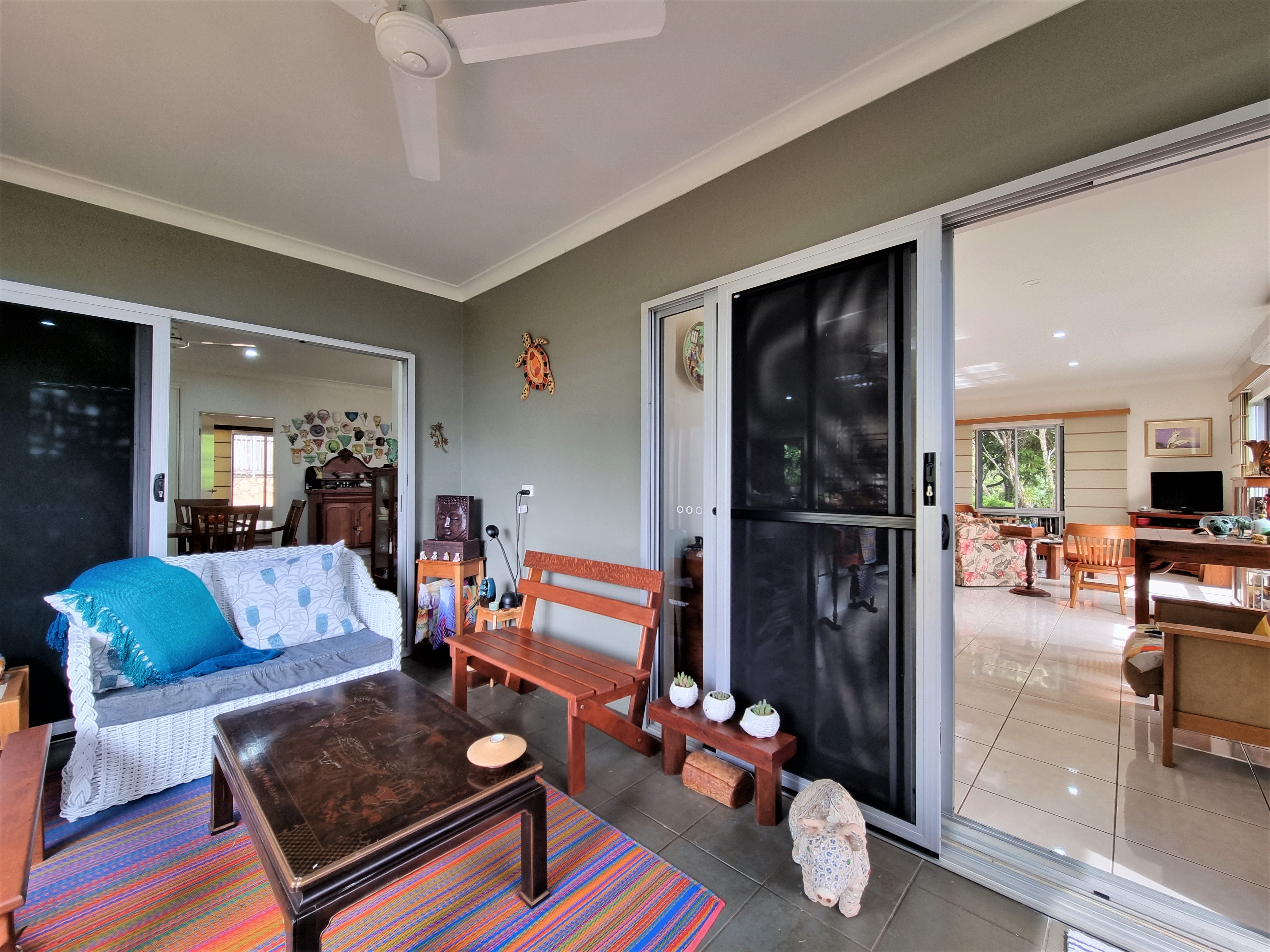 To the left, overlooking the established front garden, the front door opens into the expansive open plan living space with down lights, fan, tiled flooring and an air conditioner.