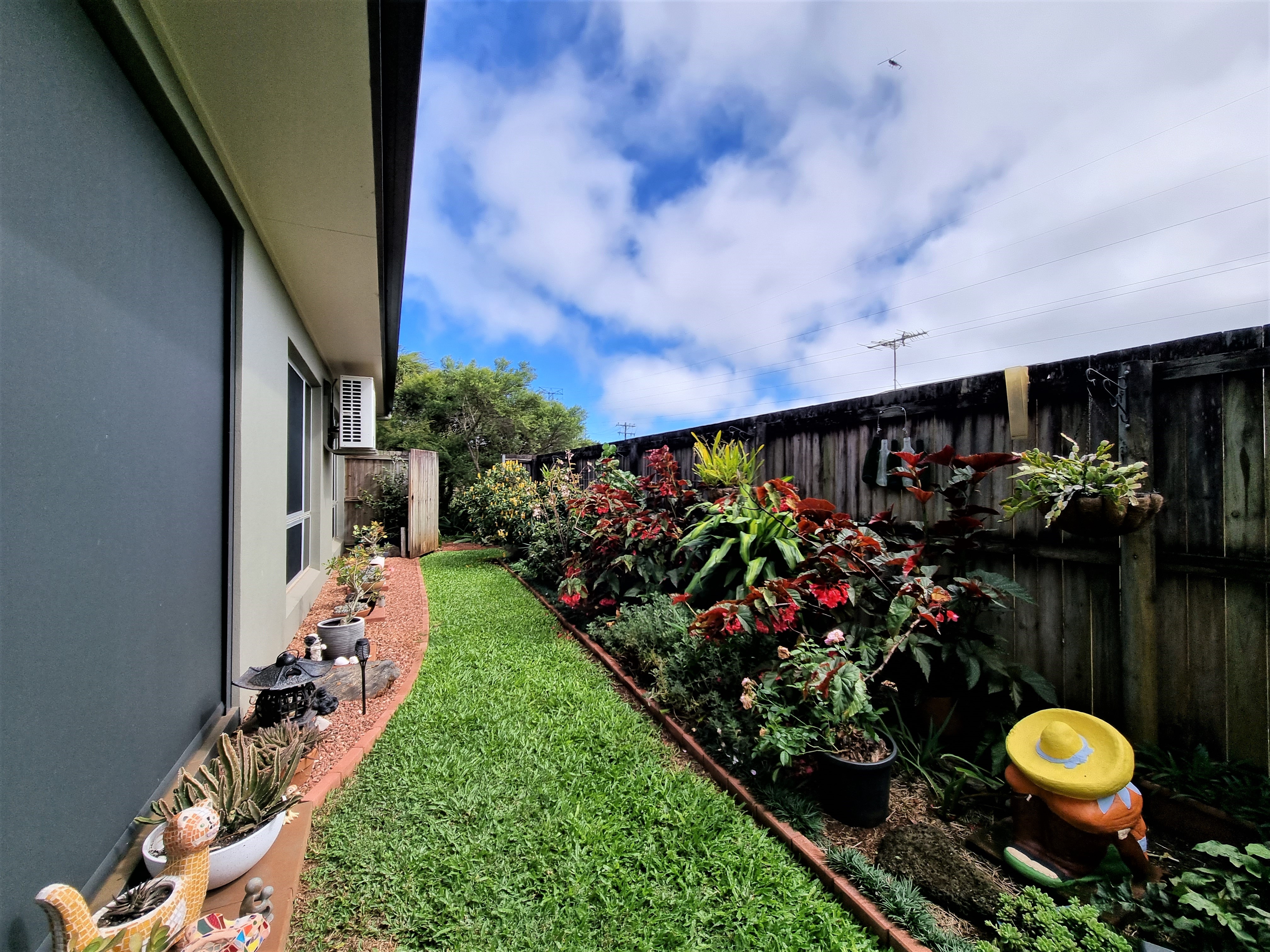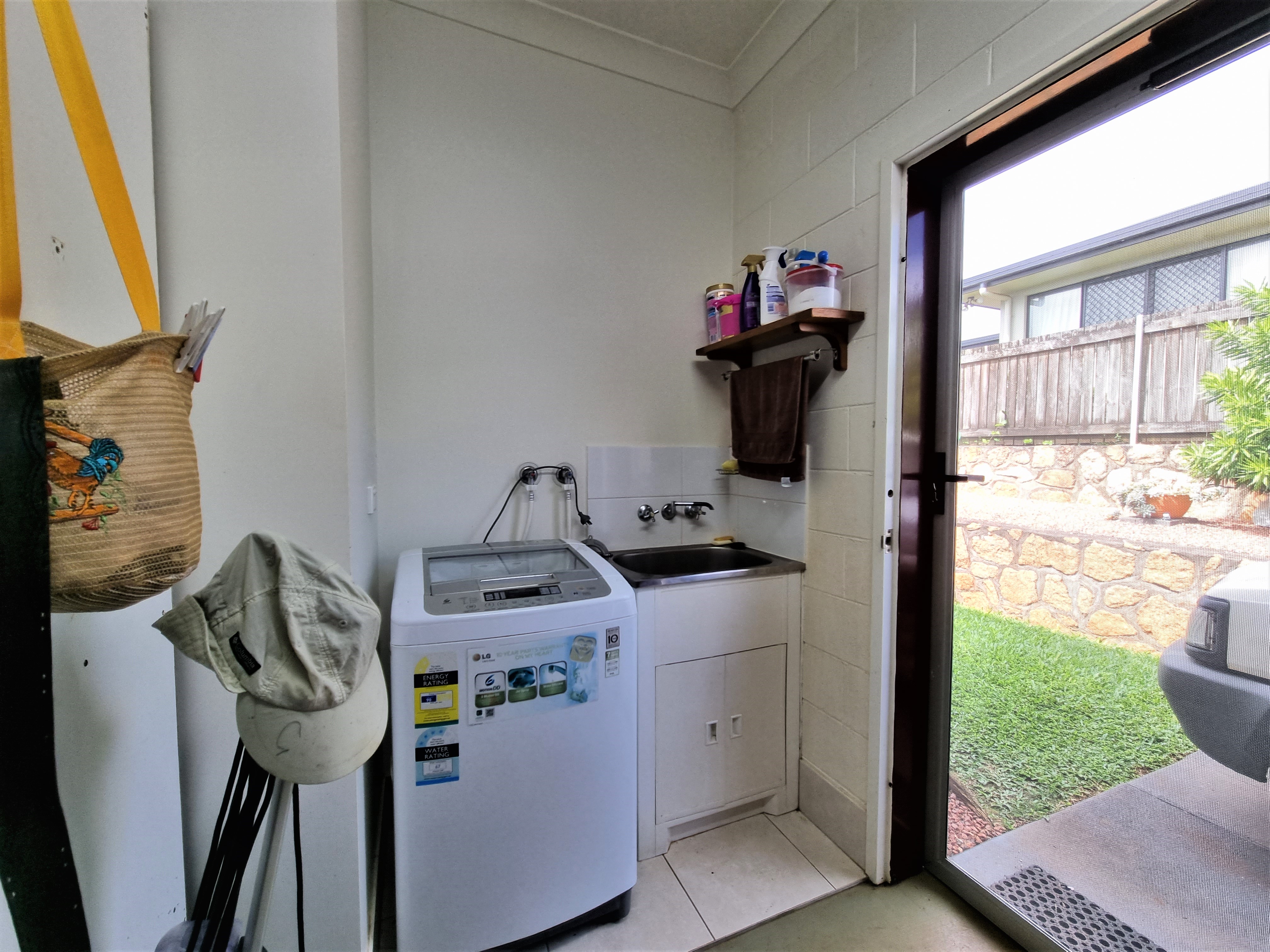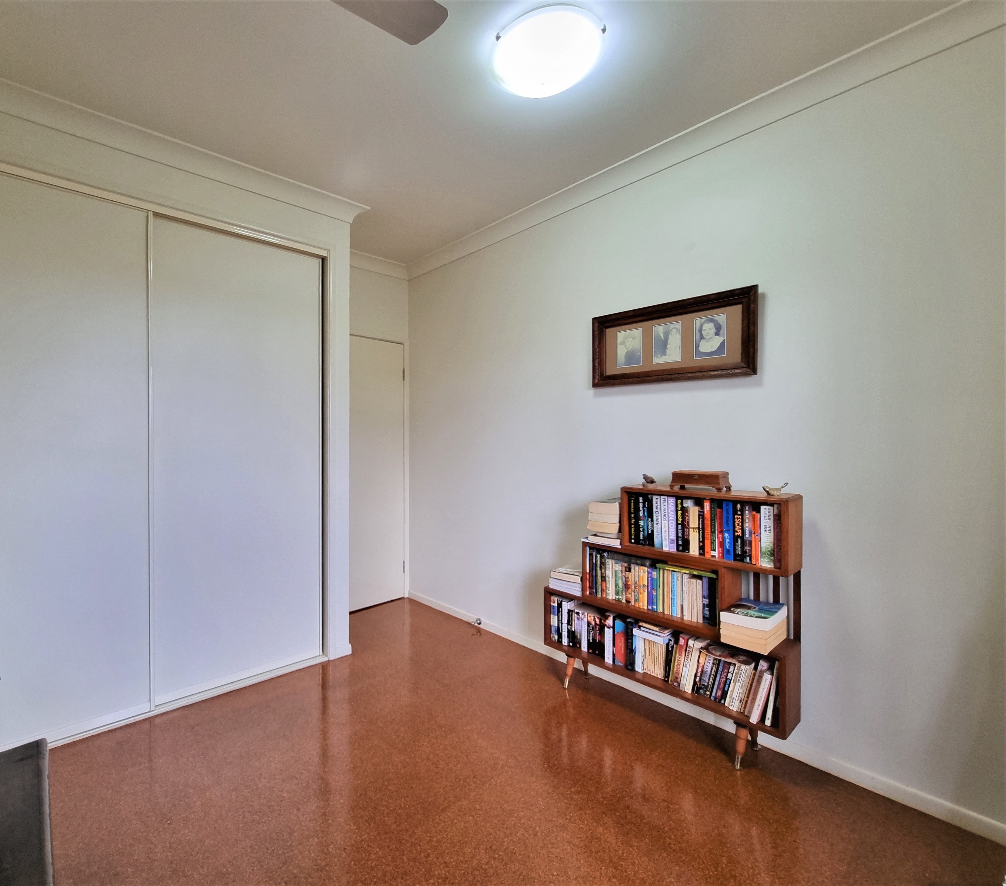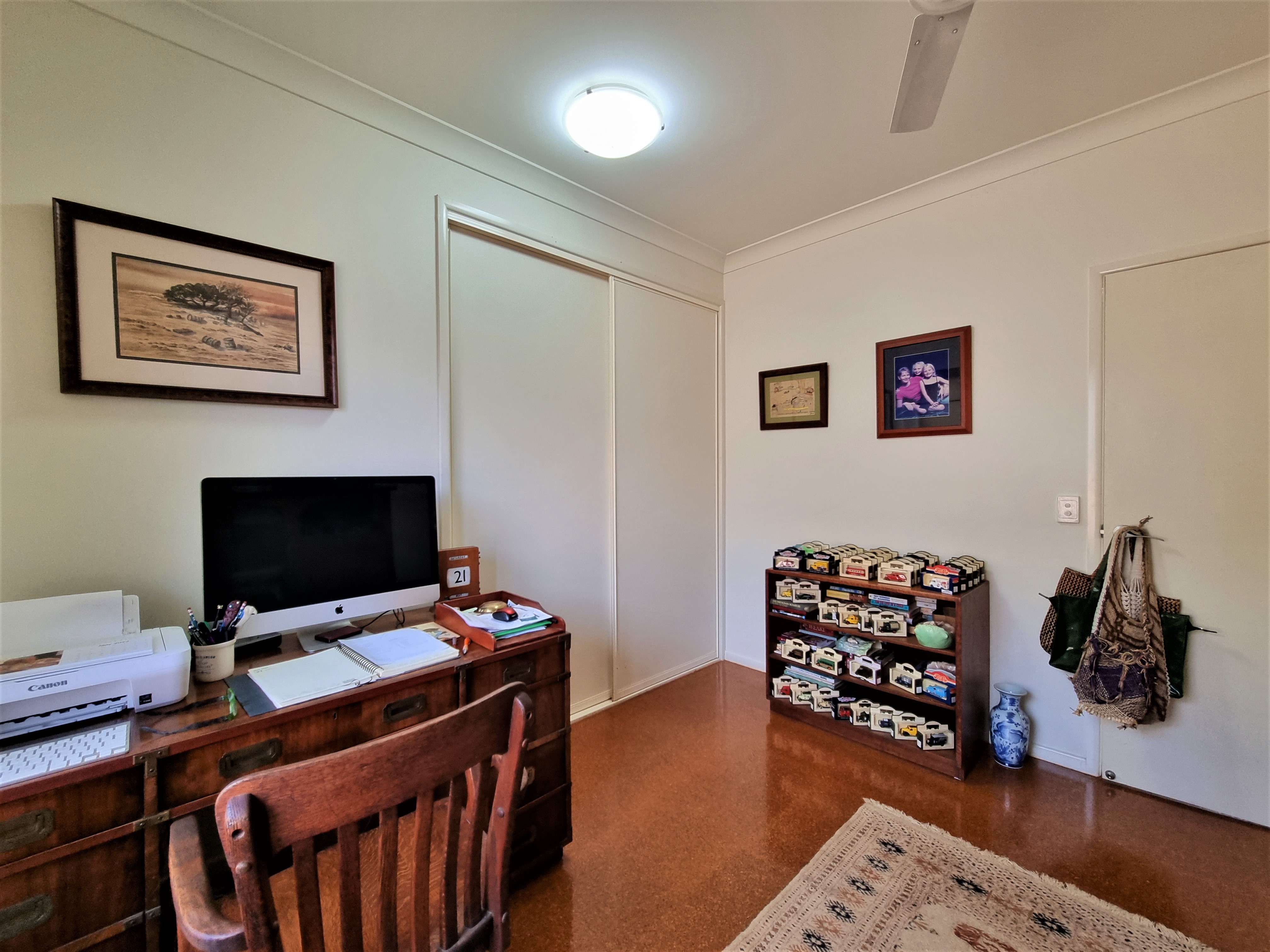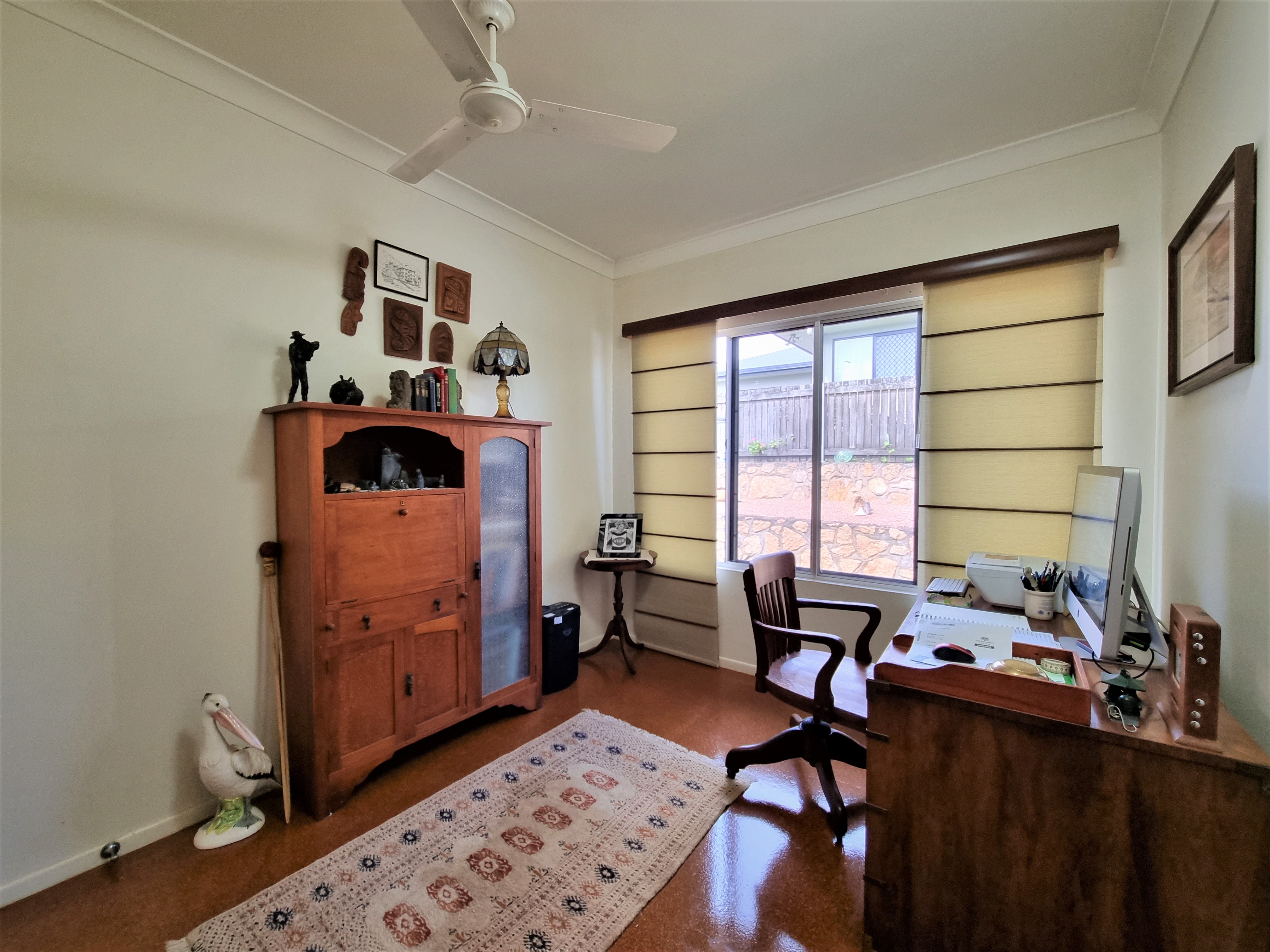 To the left, overlooking the established front garden, the front door opens into the expansive open plan living space with down lights, fan, tiled flooring and an air conditioner.