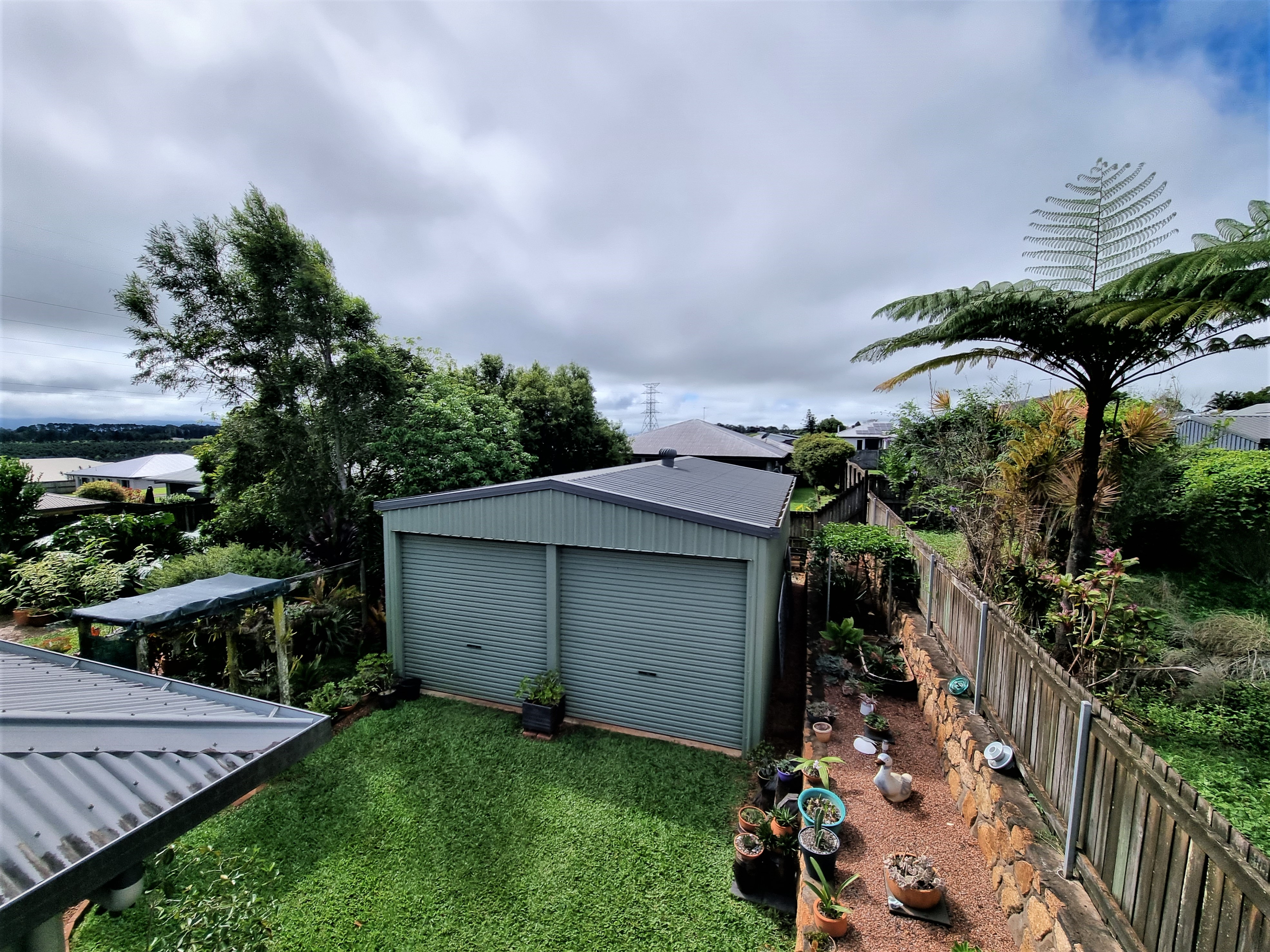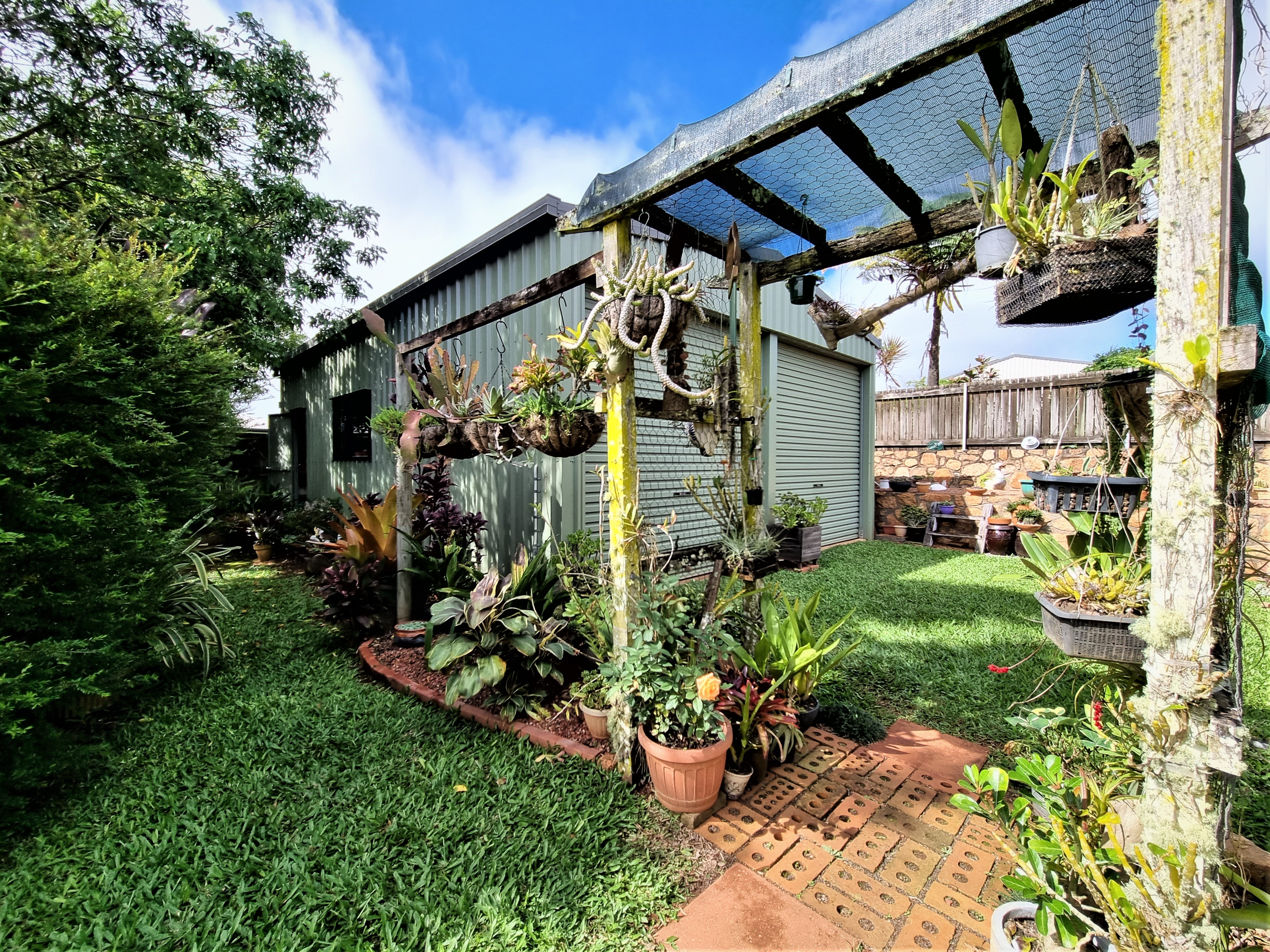 A short walk through the enchanted garden reveals a 2 bay, 54m² steel shed with power, vehicle acess from the front, and 2.6m high roller doors.