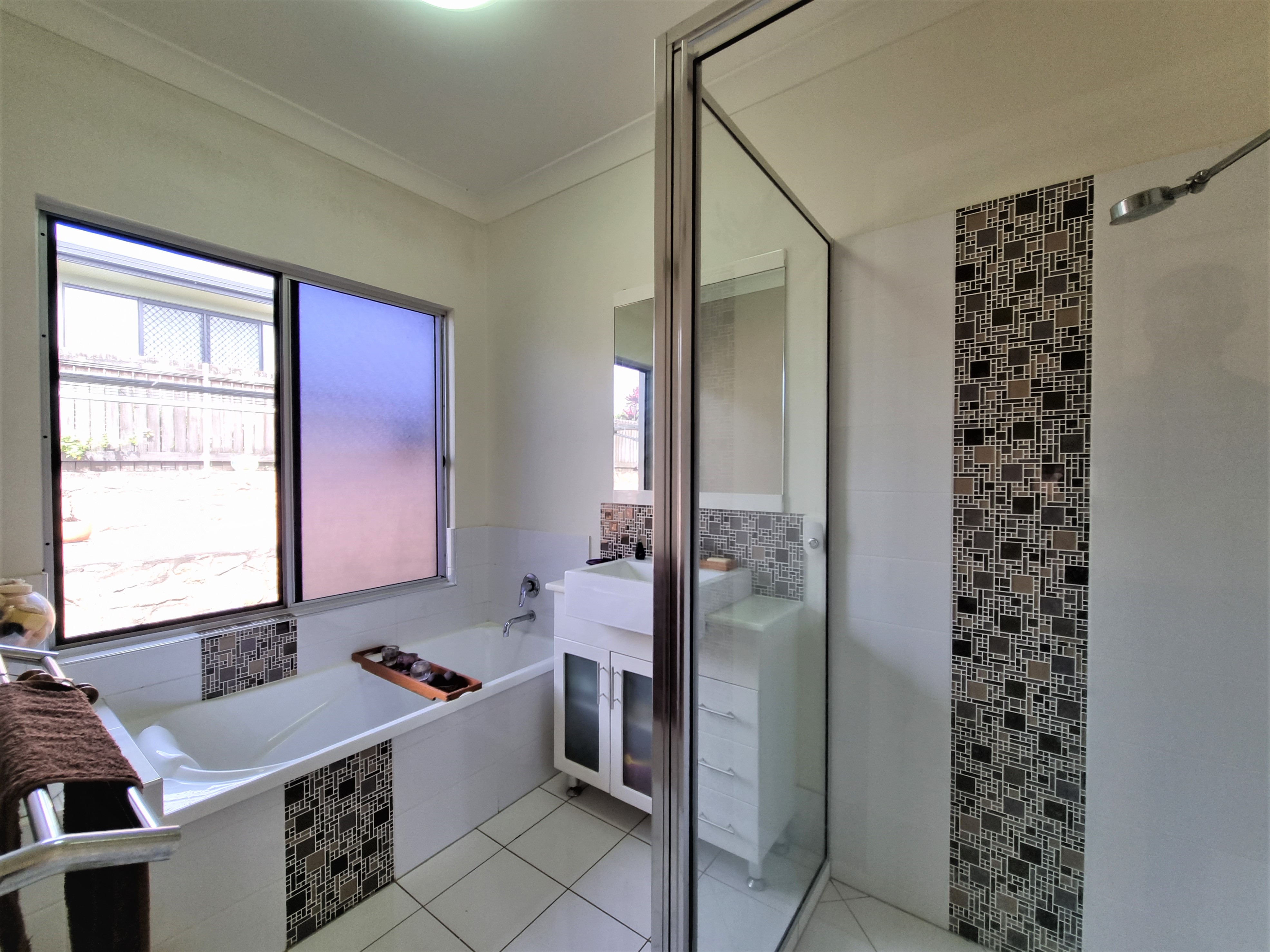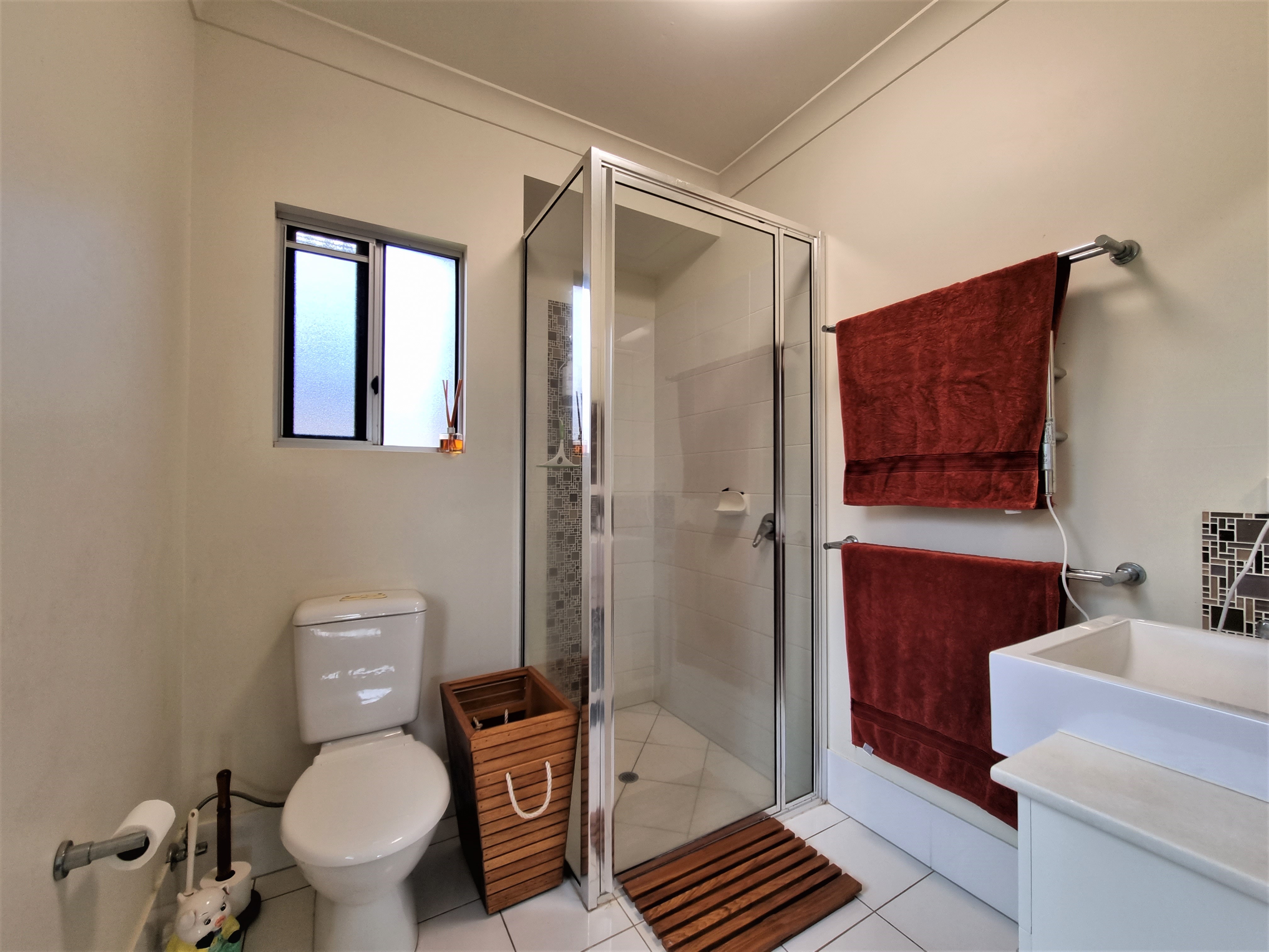 The main toilet is seperate from the attractive bathroom featuring a bath, shower, vanity and extractor fan.