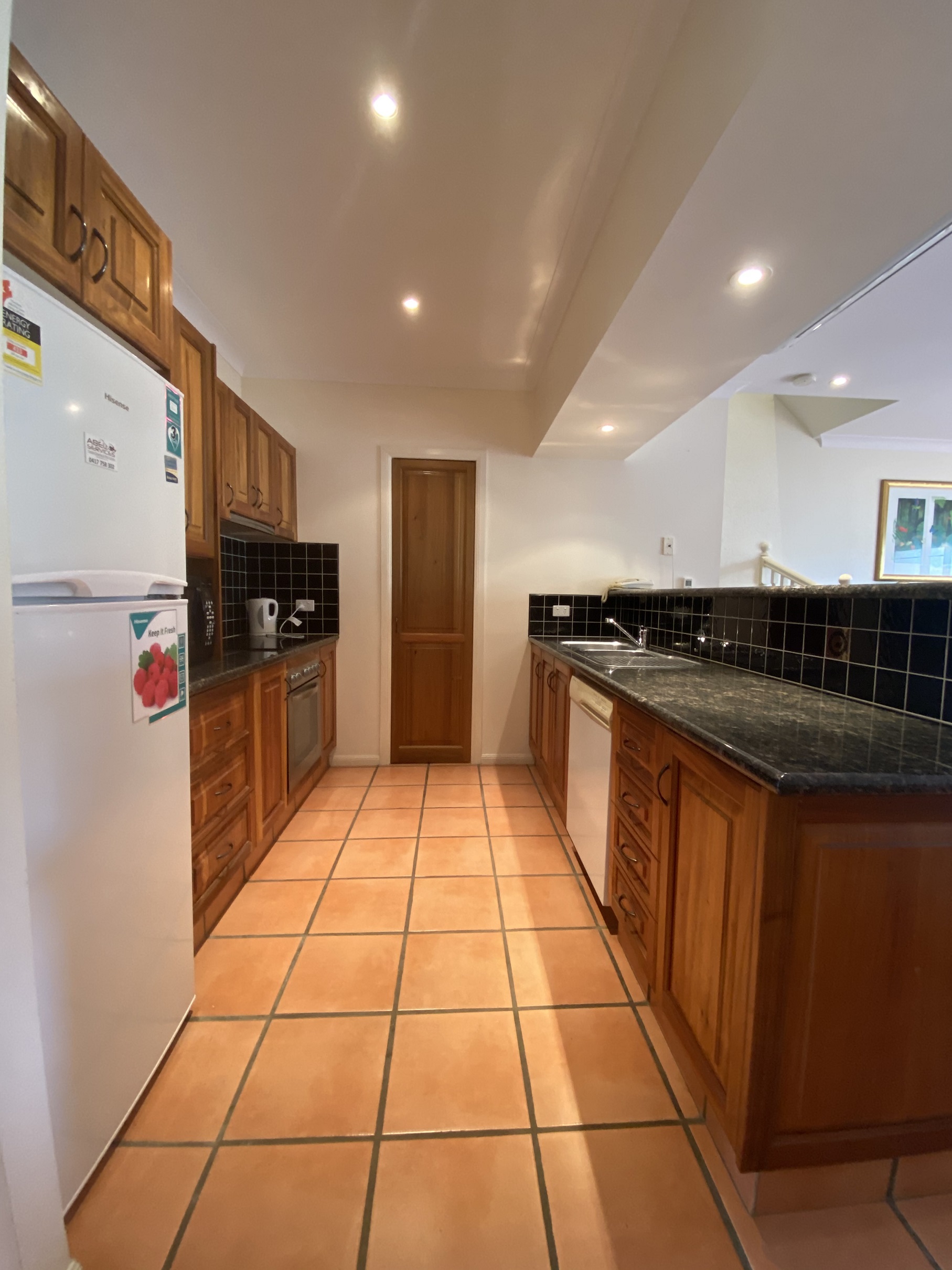 Two-story 3 Bedroom Fully furnished apartment + ensuite, Open plan kitchen living dining area with water views, quality appliances & stone benches, Main bedroom with balcony, and second entertainment patio on ground level, Fully Air-conditioned throughout, Private Lockable 1 car Garage, Complex with shared pool, Events Room & Restaurant & No Pets Approved.