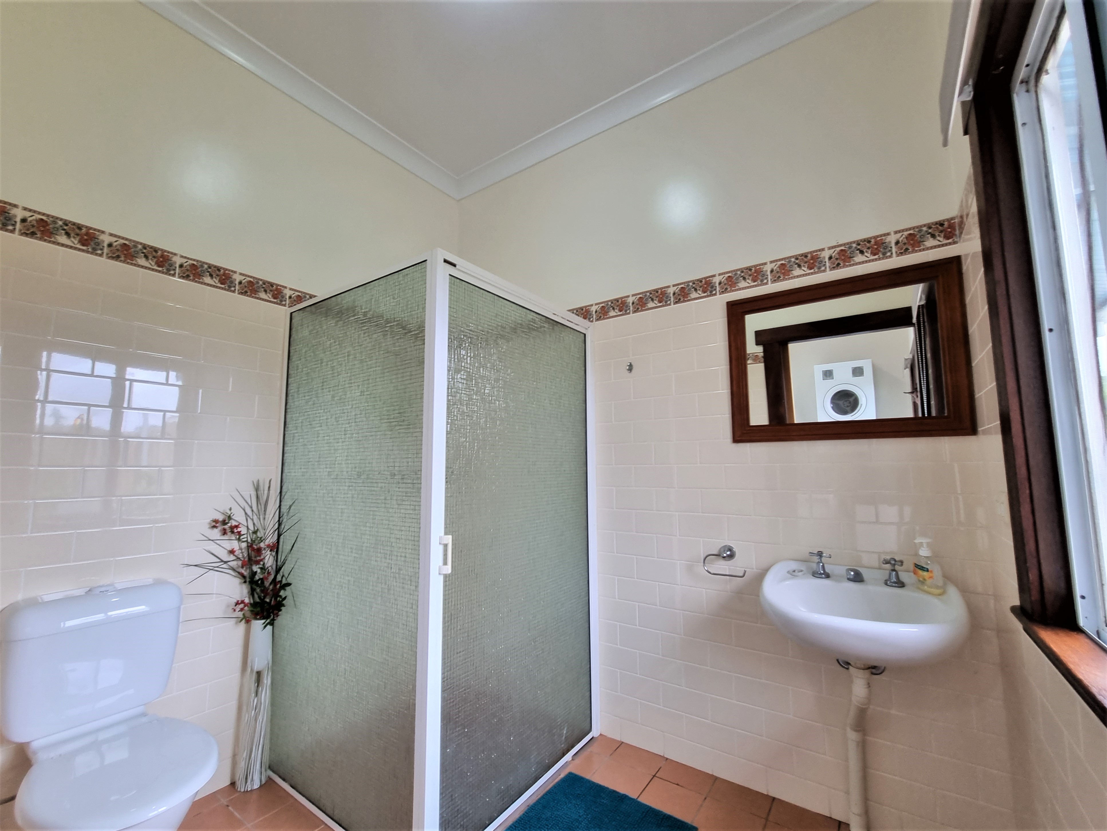Across from the laundry, the tiled bathroom includes a toilet, shower and hand basin.