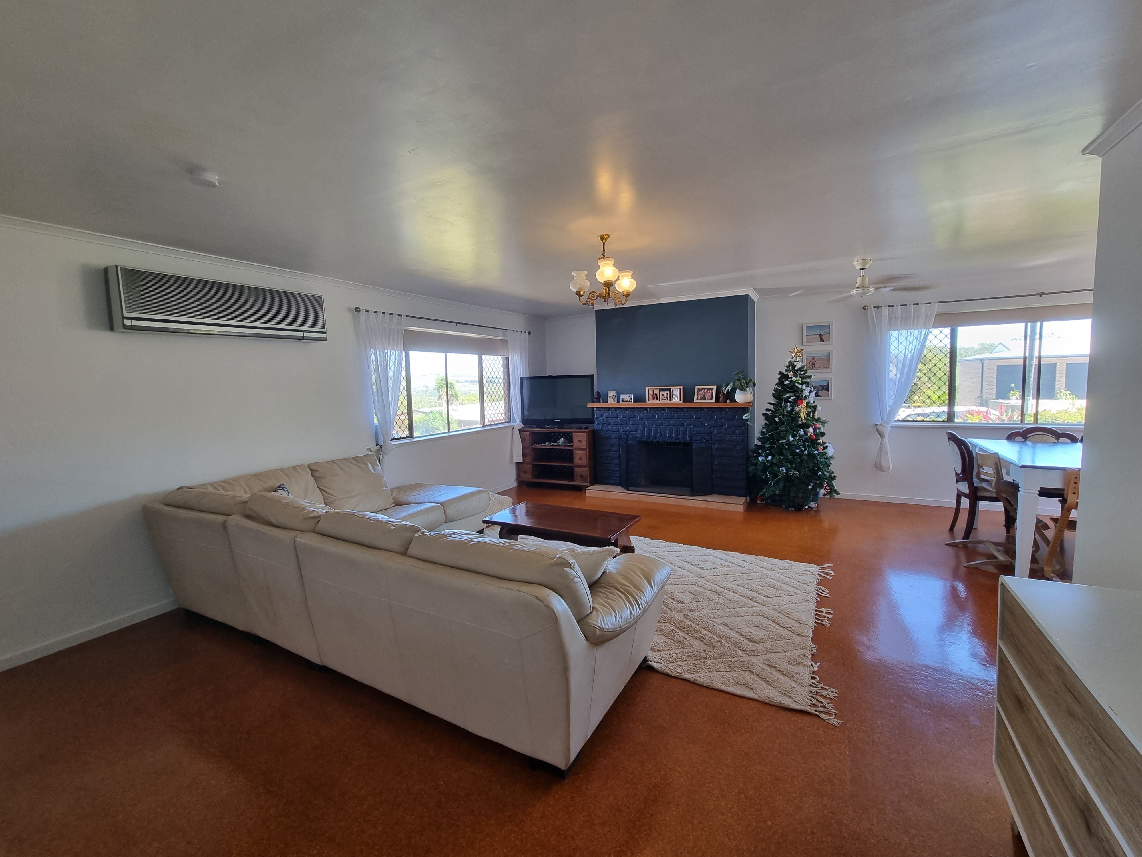 Large open loungeroom has the property's only air conditioner as well as a wood fire.