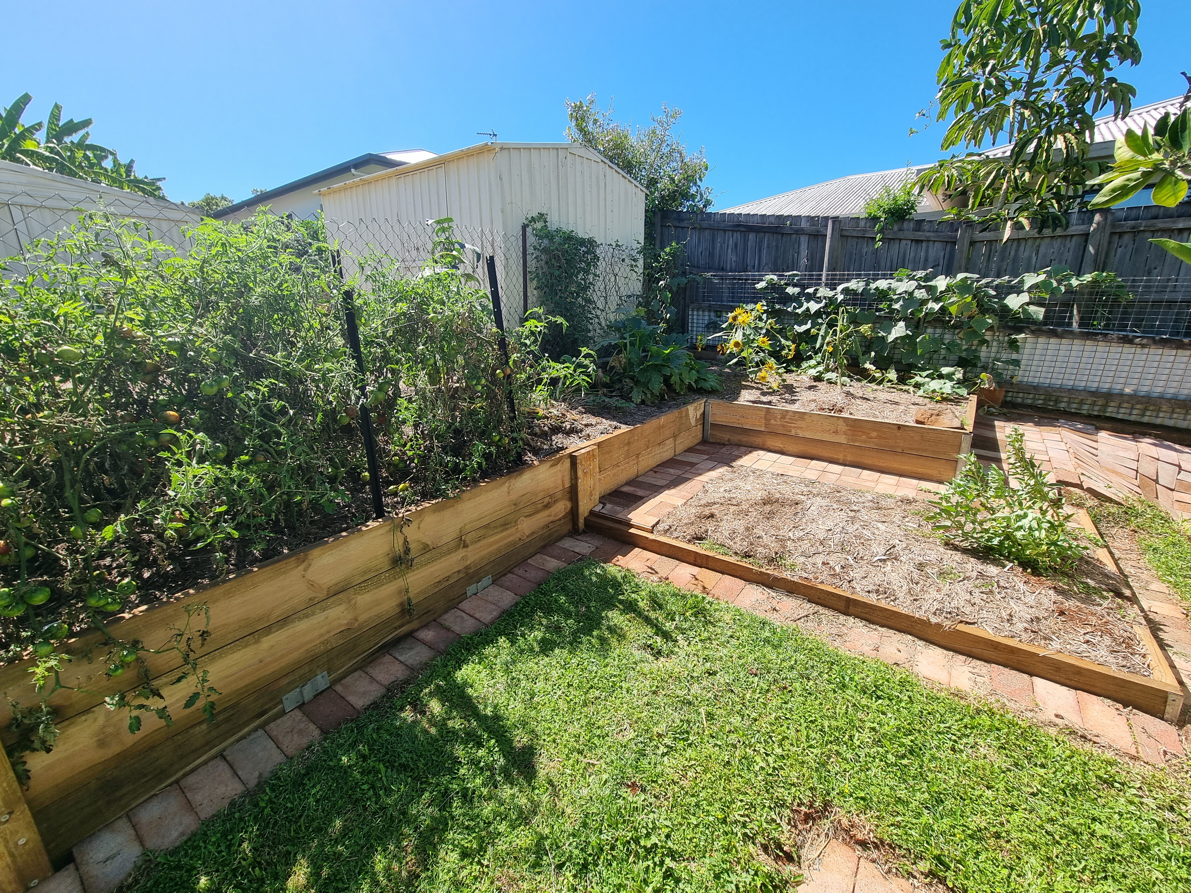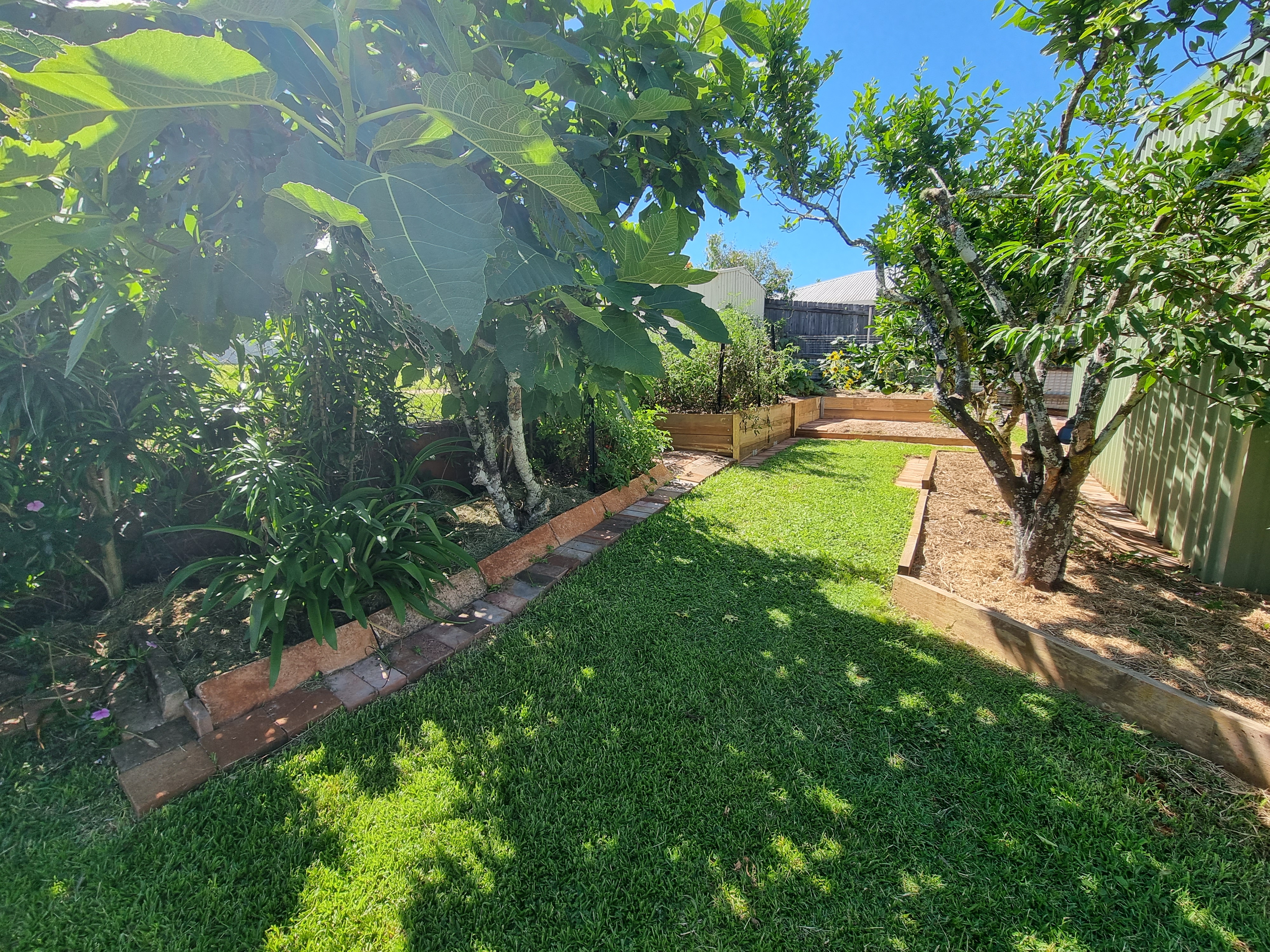 Rear yard has established gardens, a vegetable patch, with plenty of open space and an undercover entreating area.