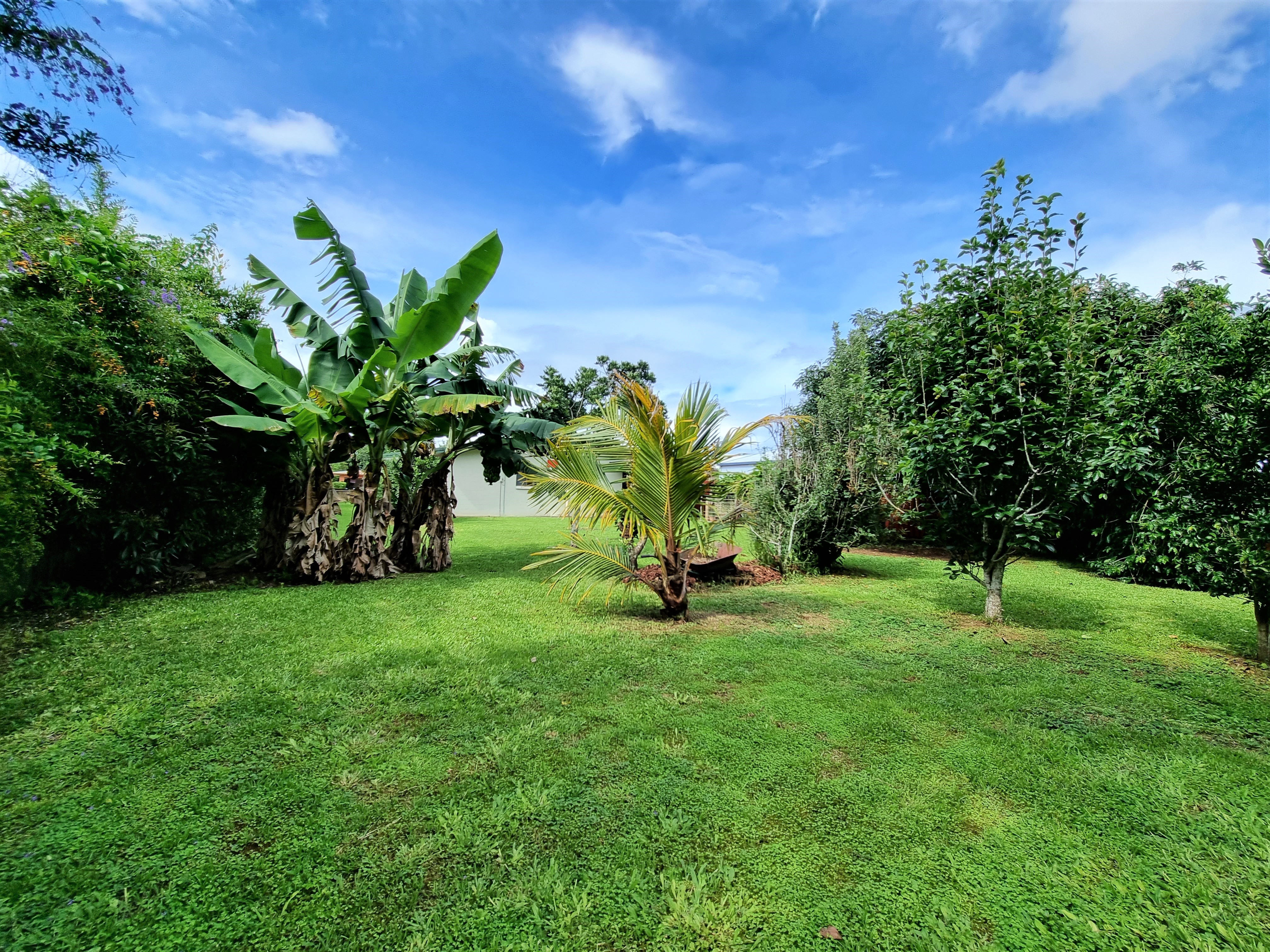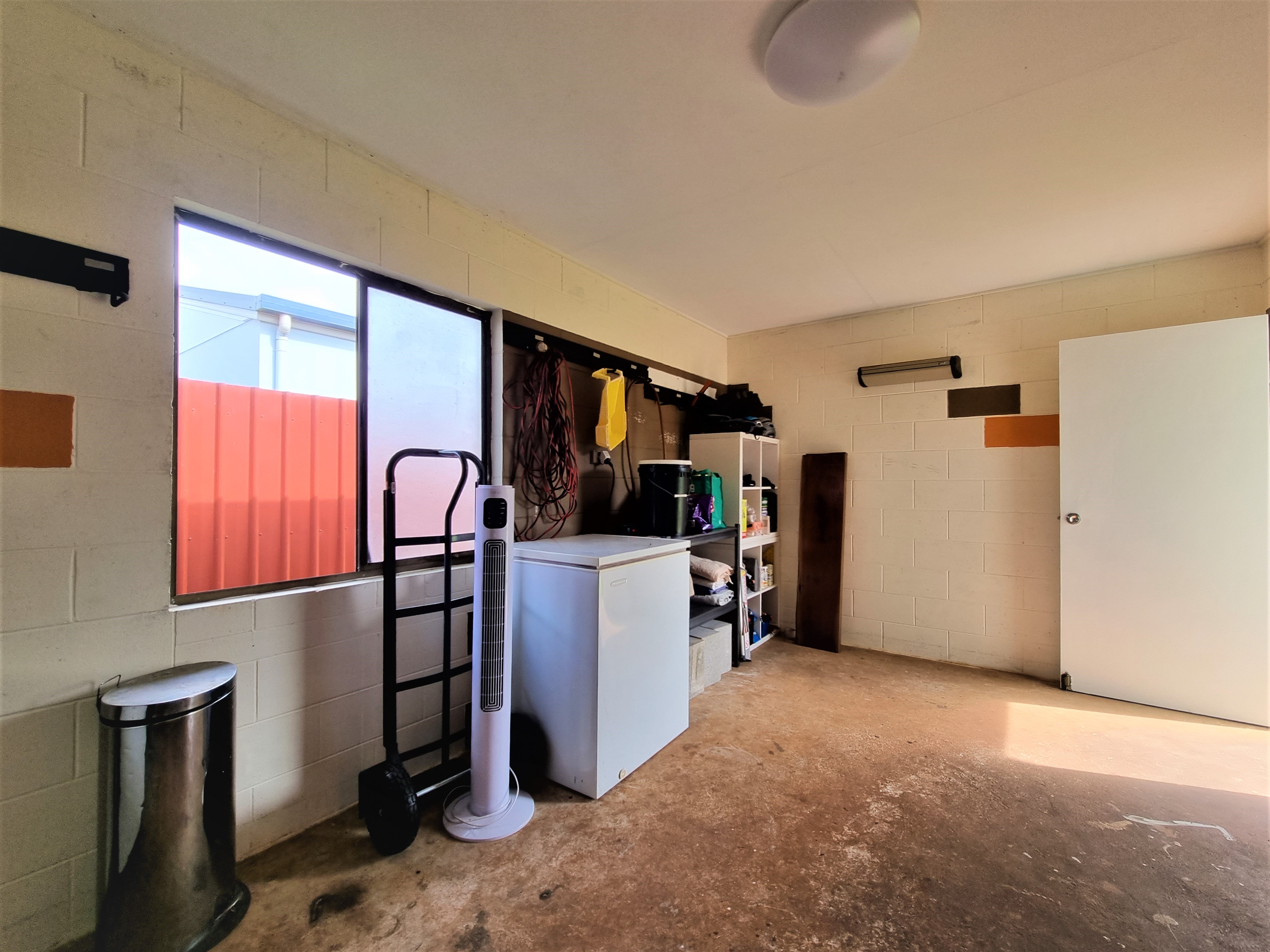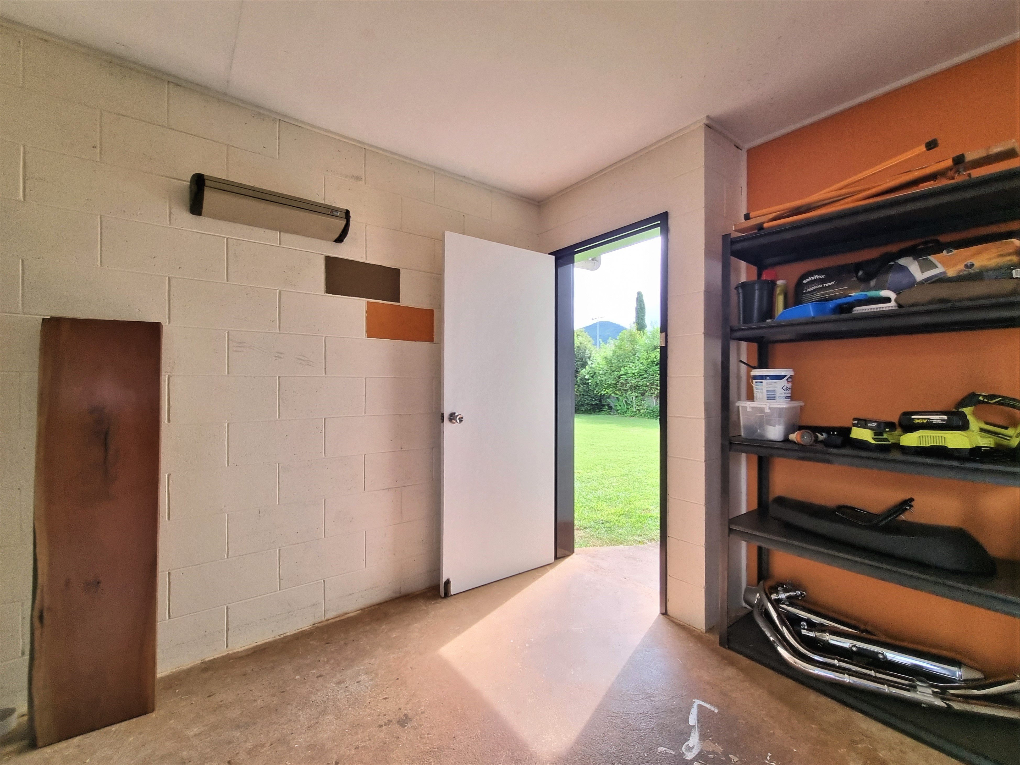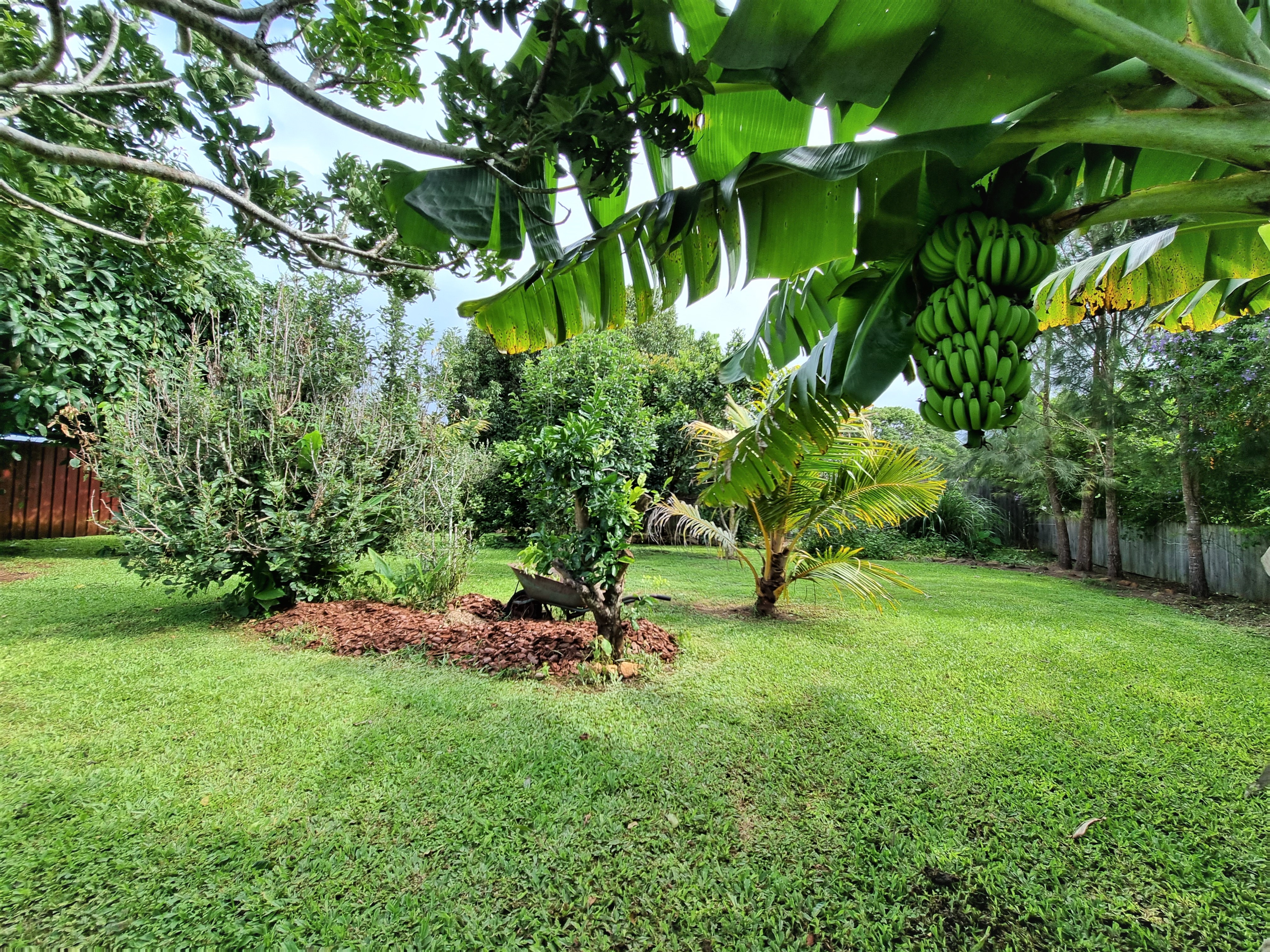 There is a double length garage and storage room running the length of the home flowing through to the established fenced back yard, where you will find avacado, banana, and citrus trees.