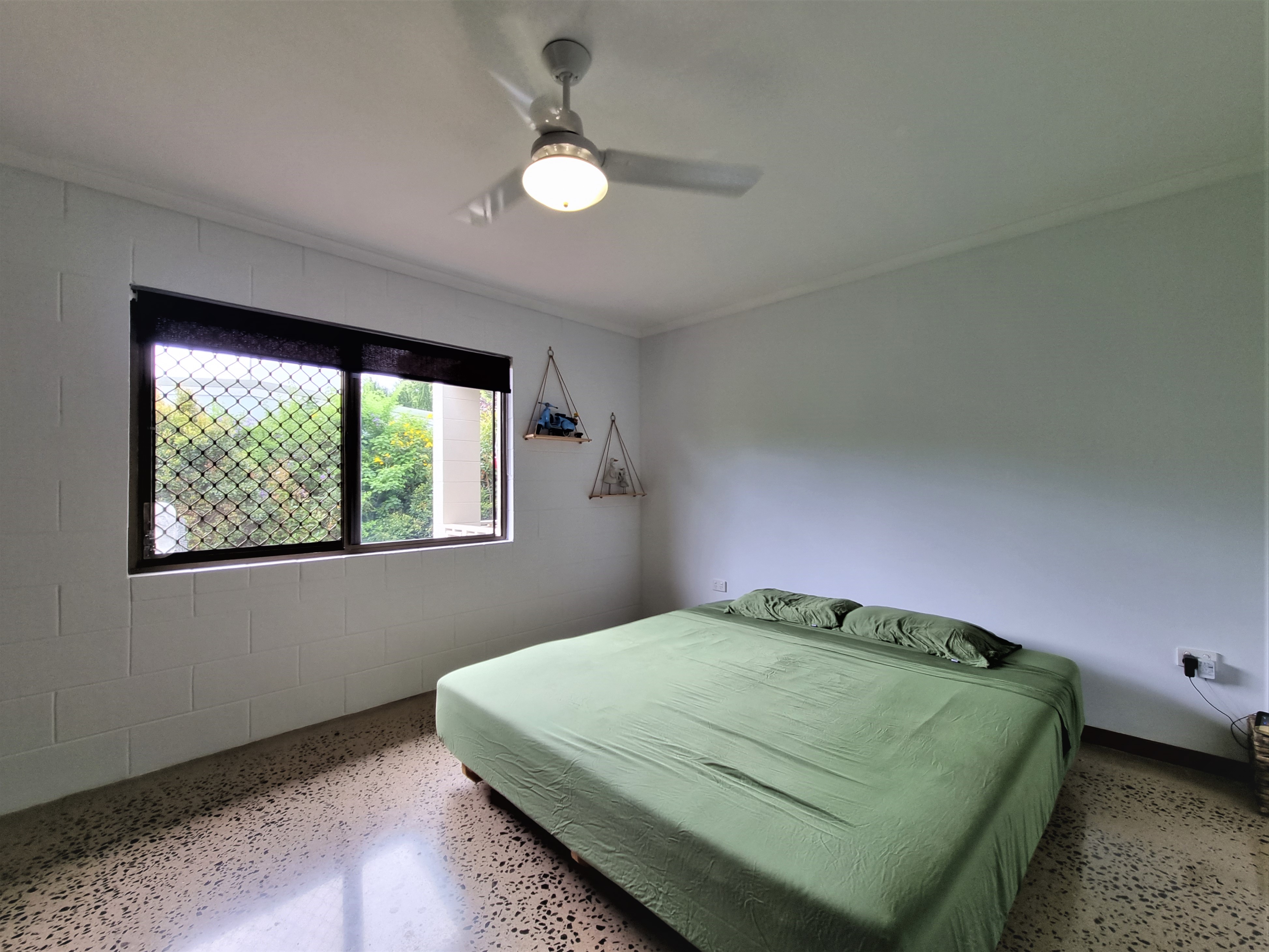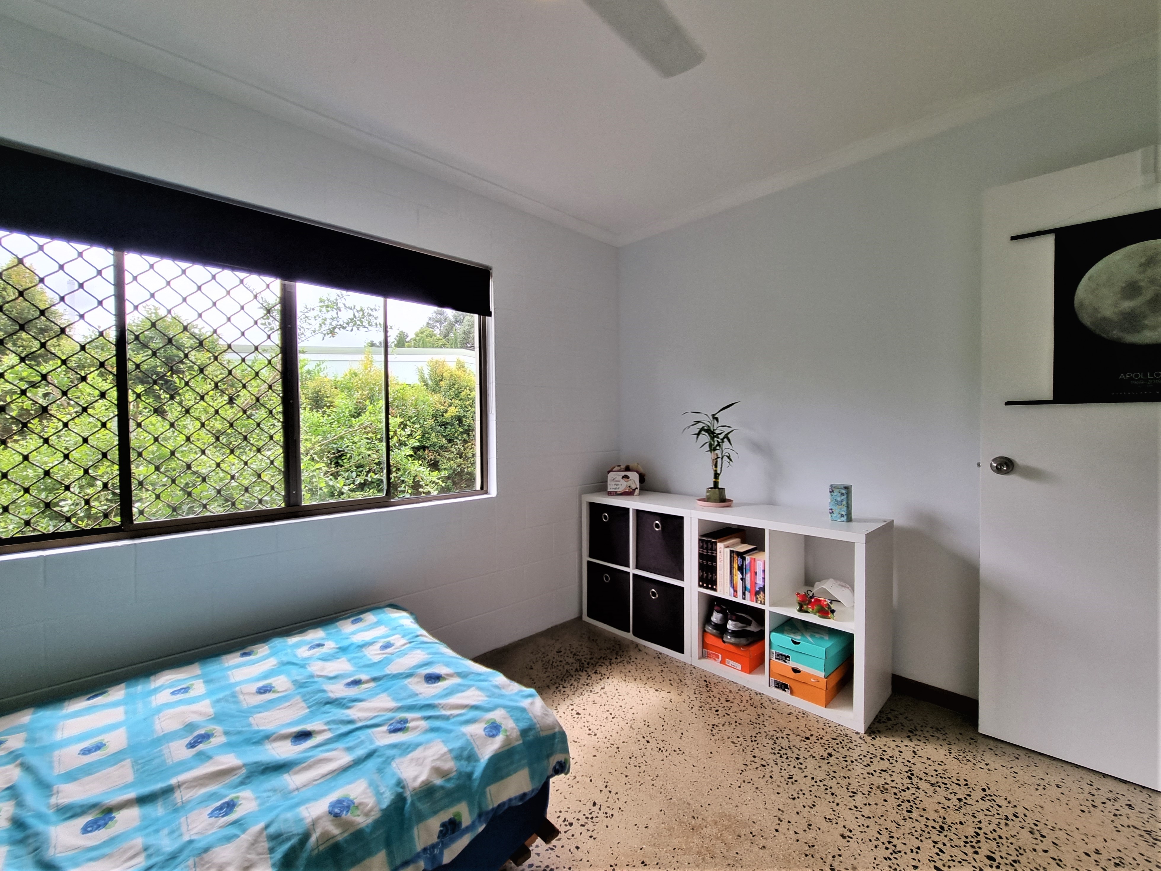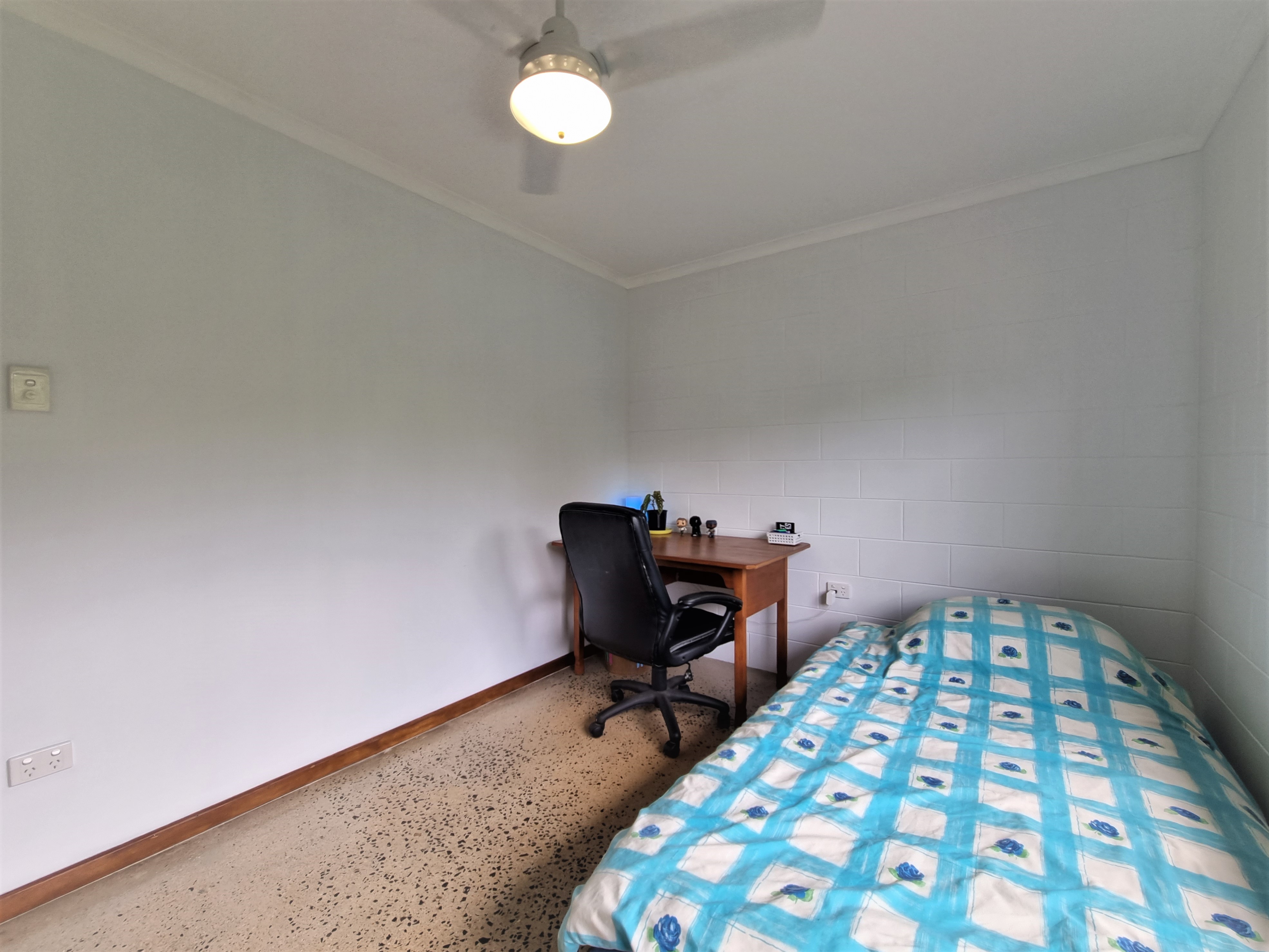 Adjacent to the bathroom, the second bedroom has a security screened window overlooking the side garden.