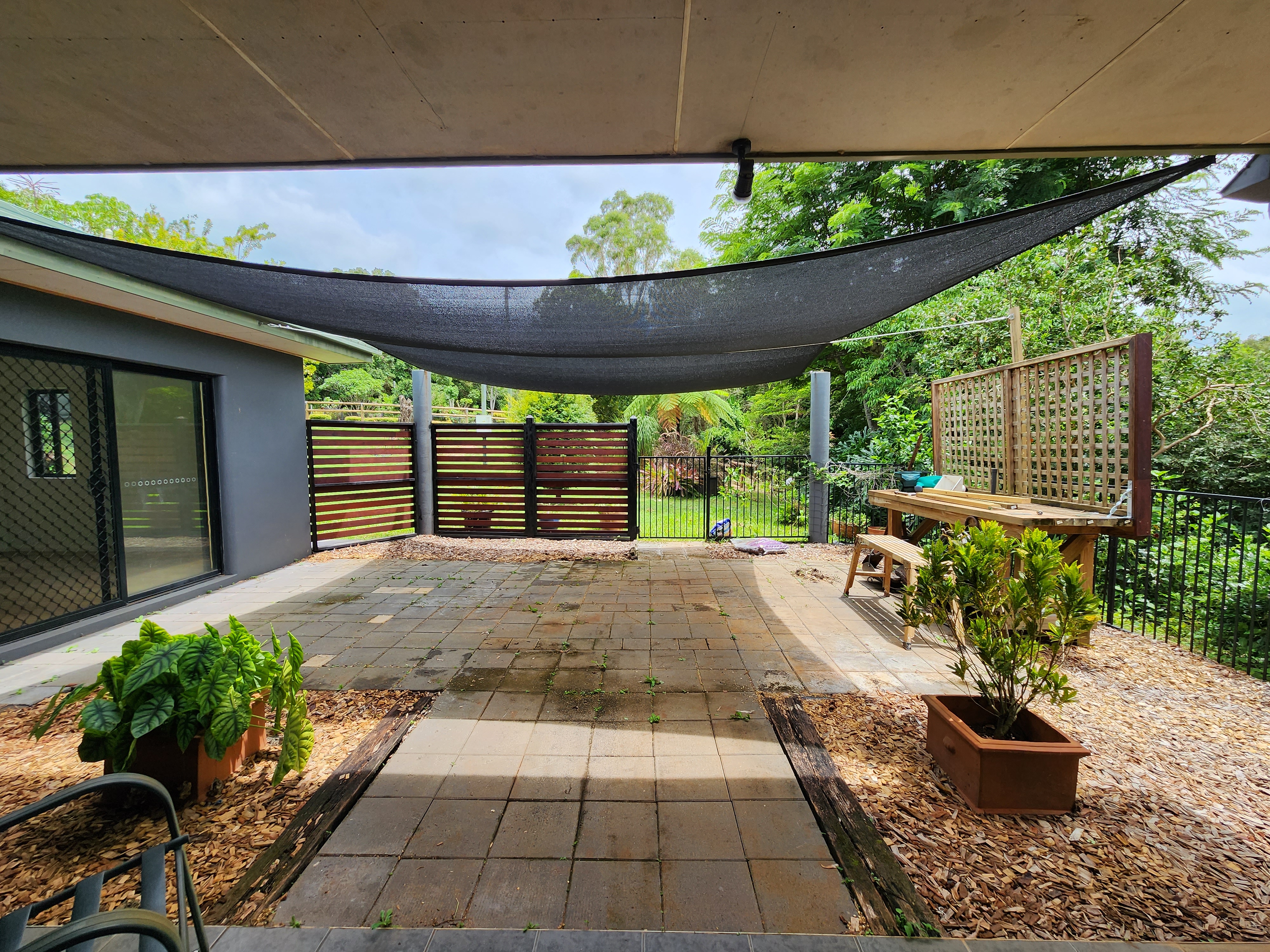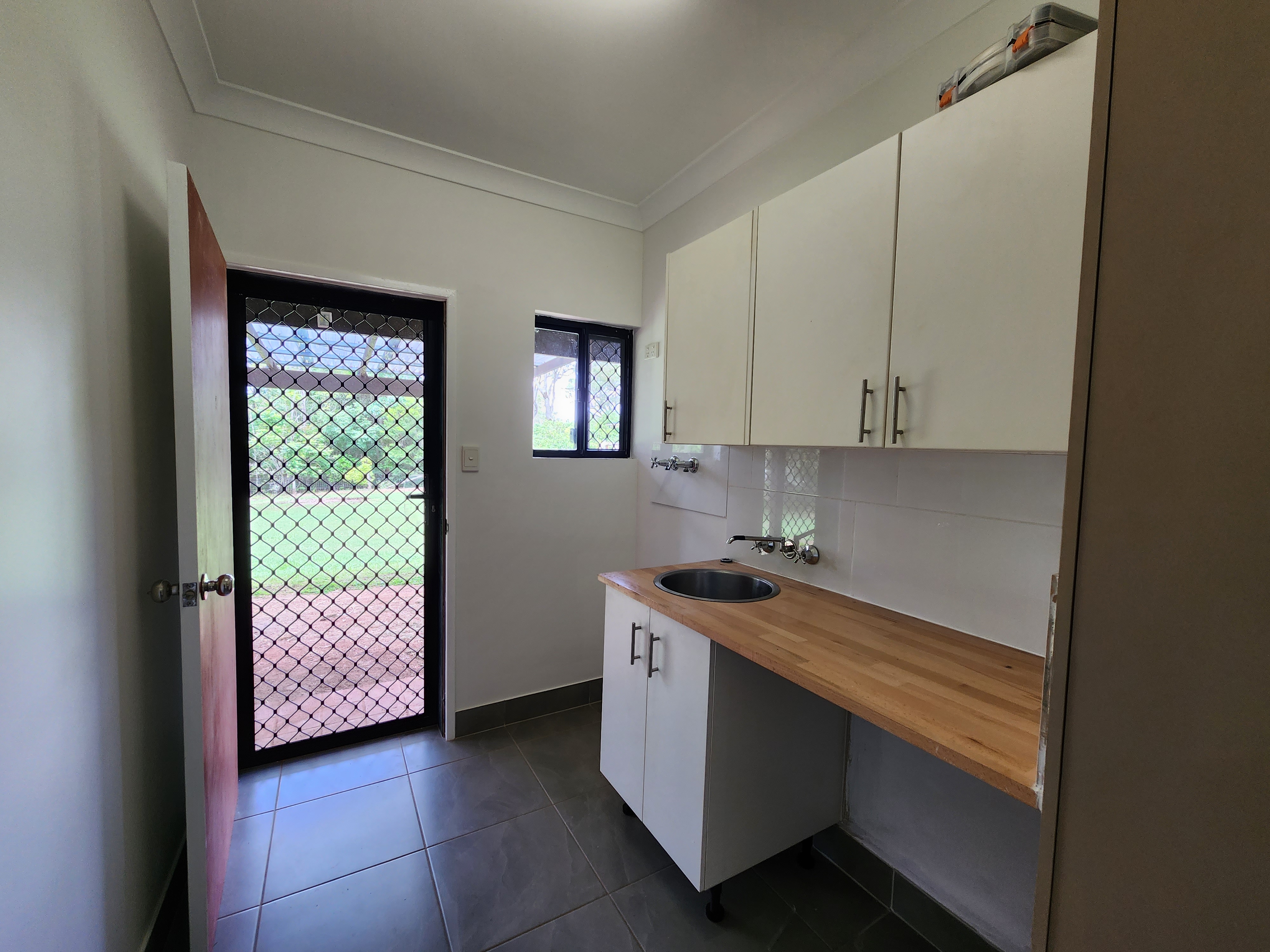 The matching renovated laundry area has direct outdoor access and large bench space.