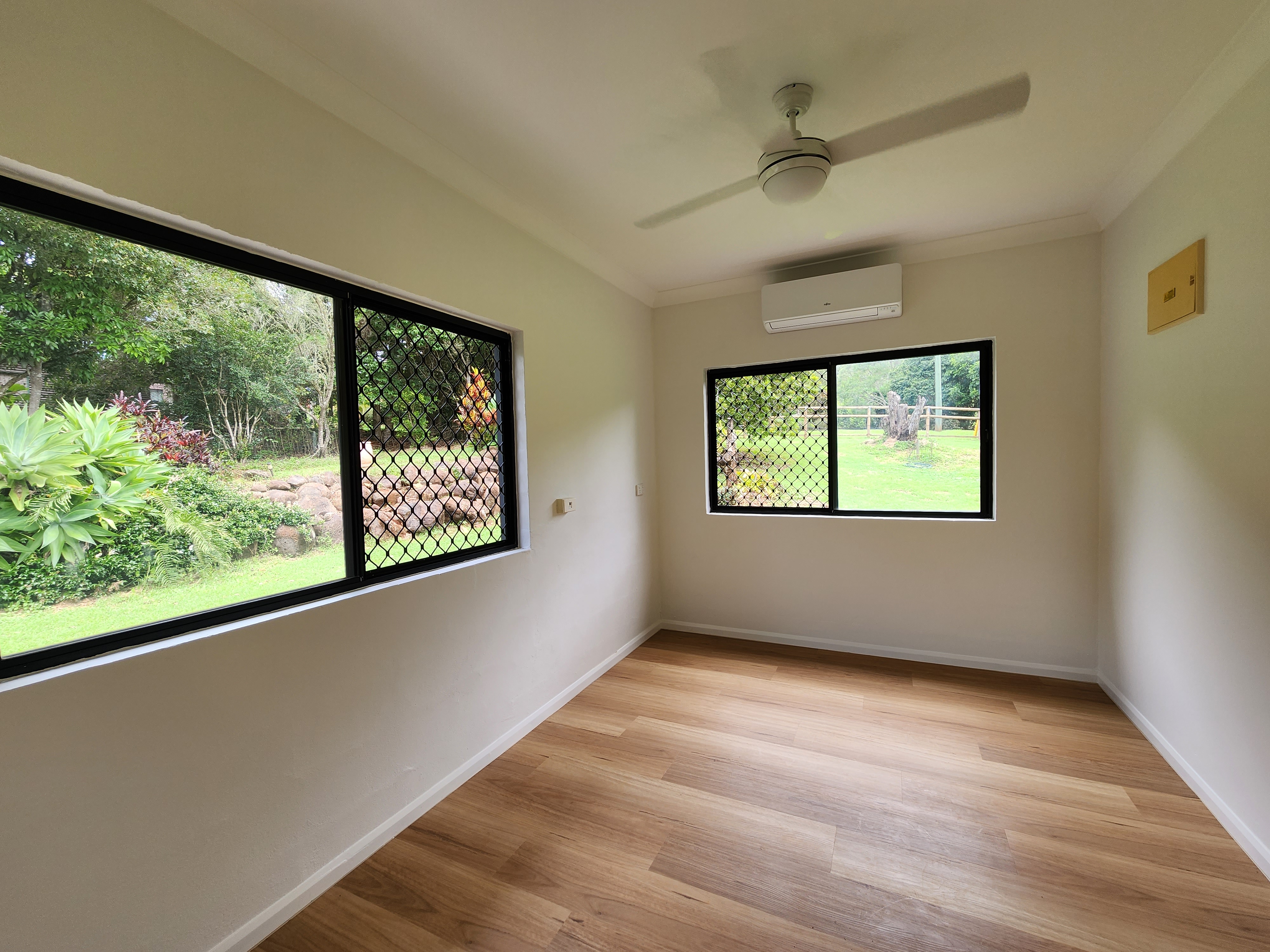 The master bedroom features a large built in robe, air-conditioning, ceiling fan with direct outdoor access onto the patio.