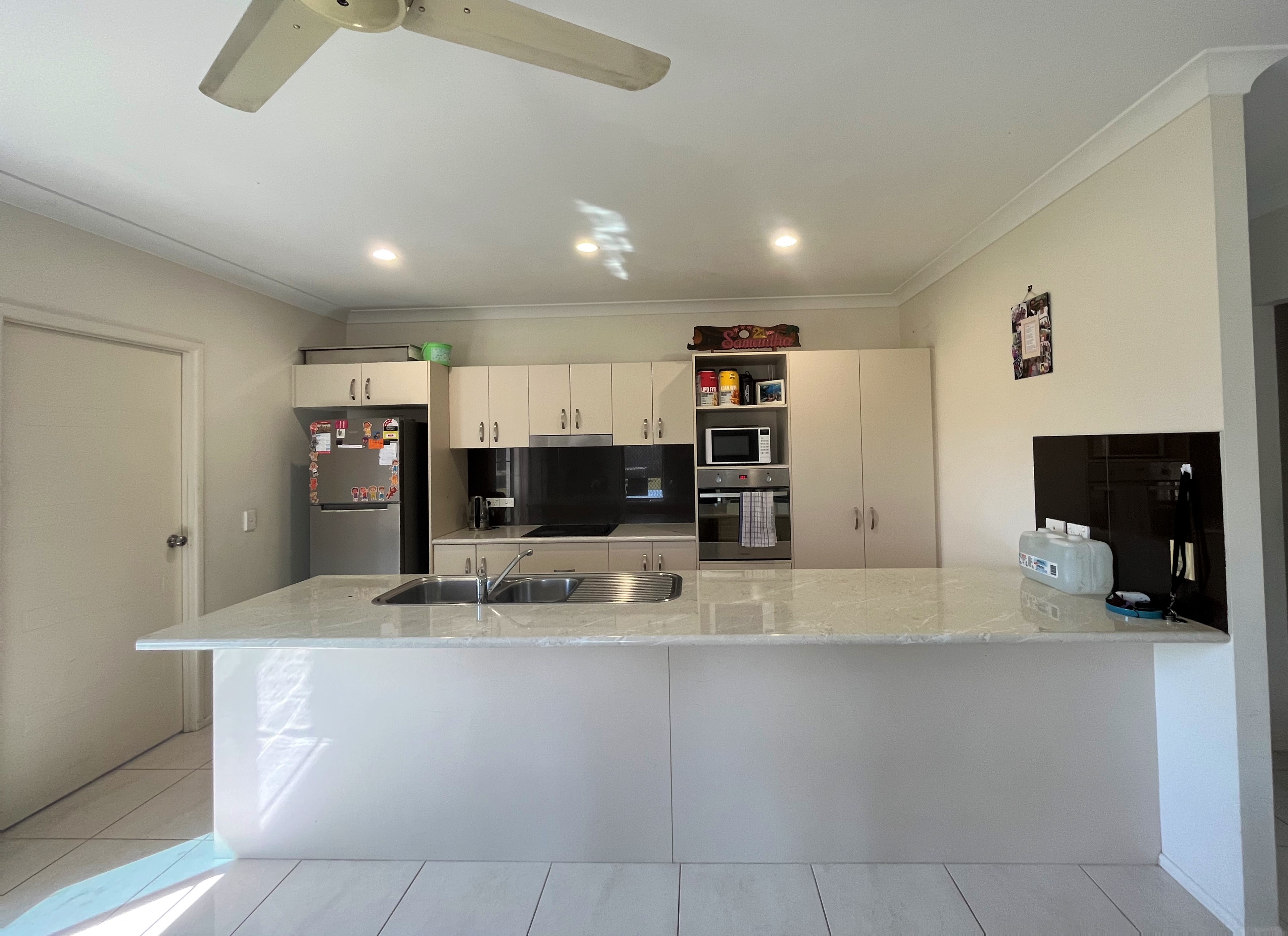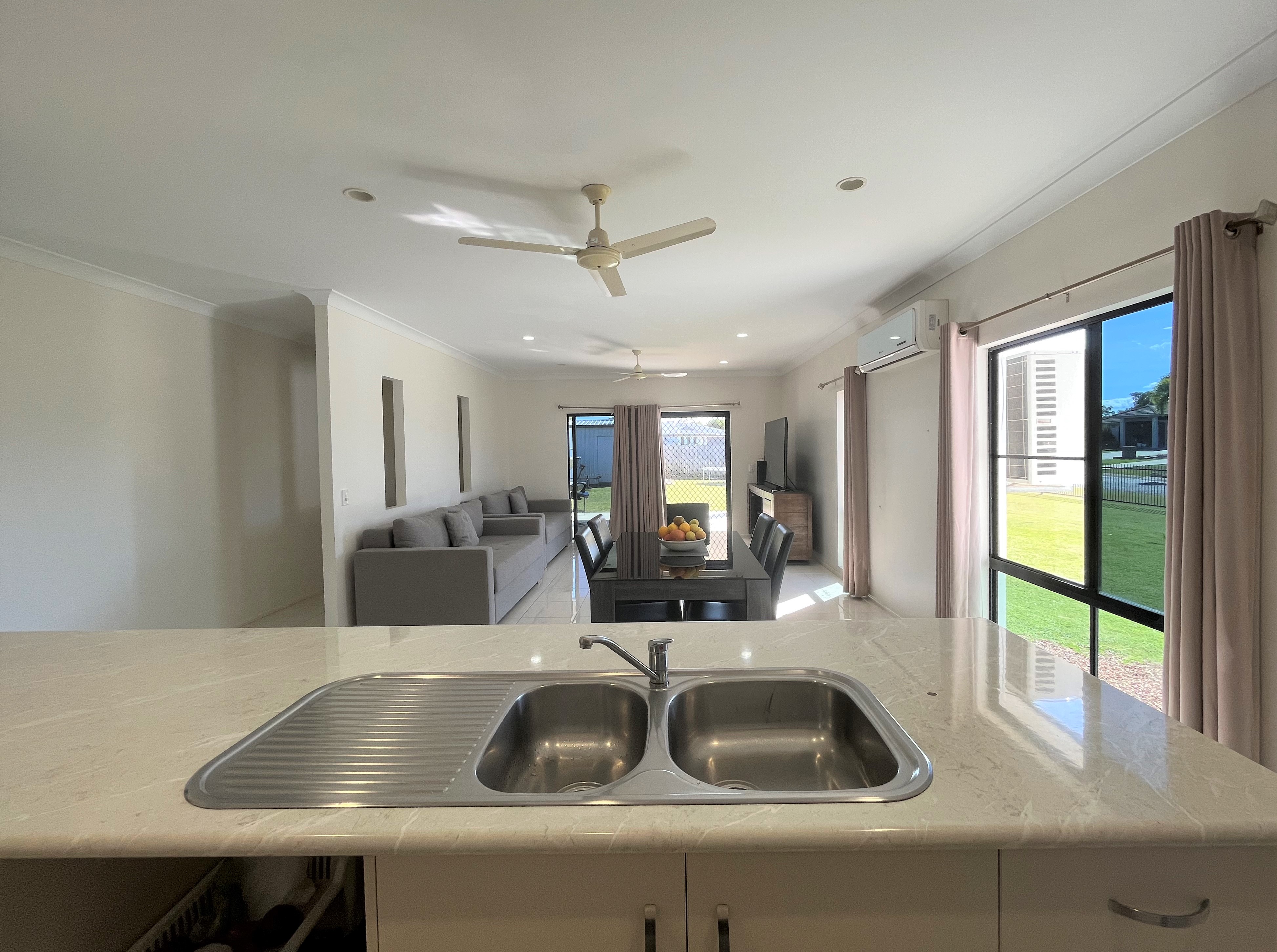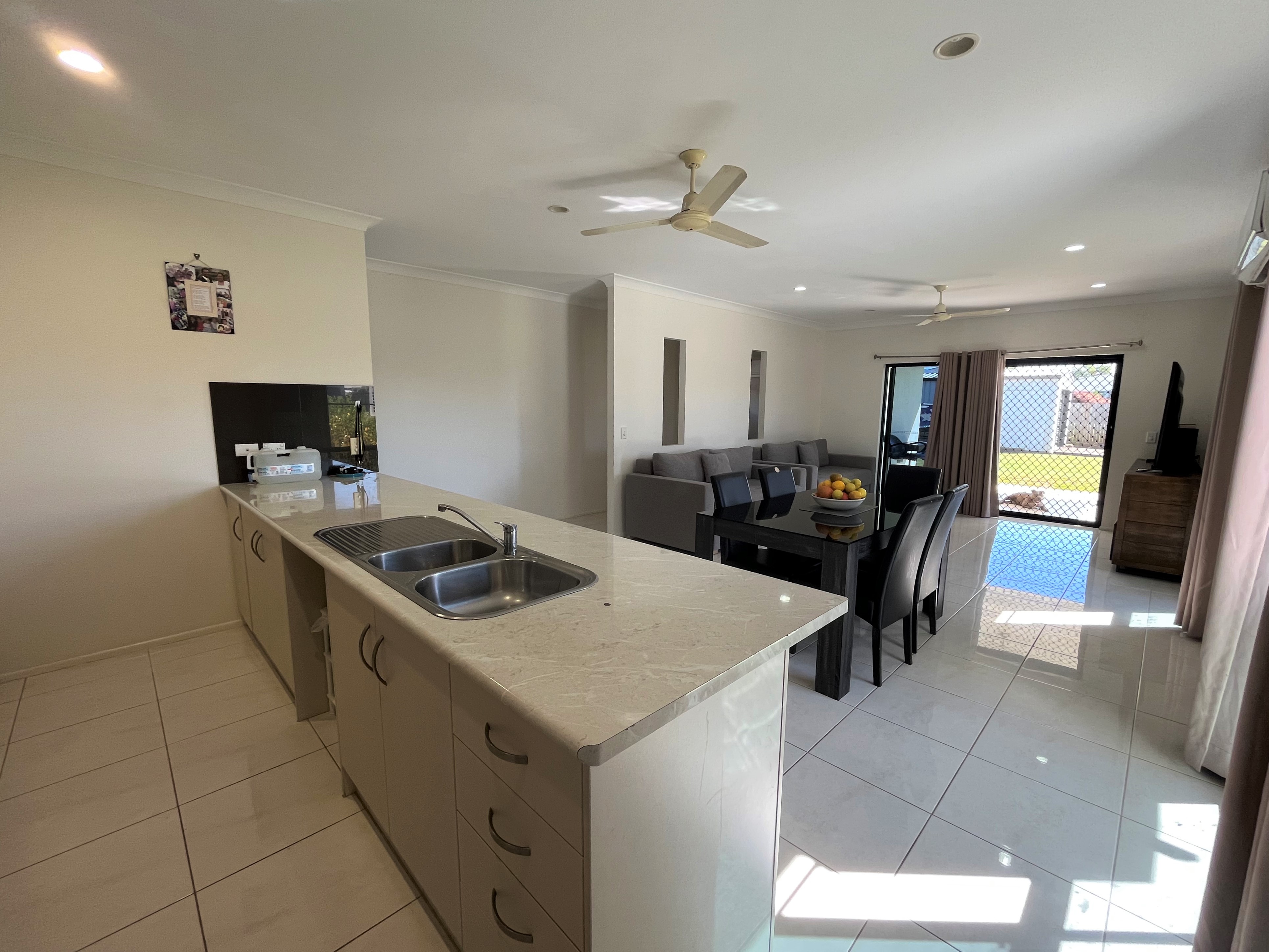 The centre of the home offers an open plan living space for the kitchen, dining and lounge area. This room offers a large aircon with sliding door access to an outdoor tiled patio area.