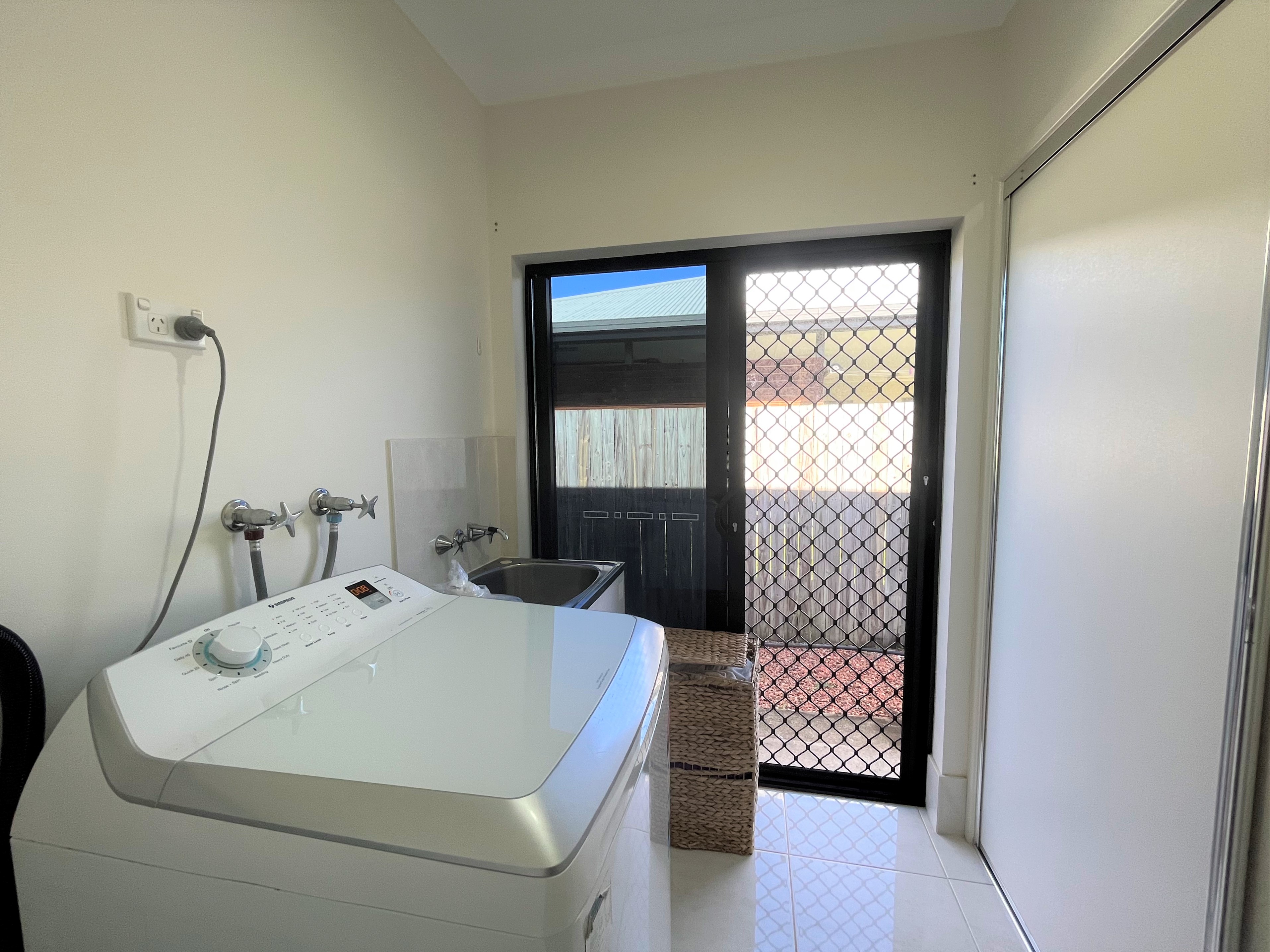 The laundry is located in the home with a built-in cupboard for storage and sliding door to access the outside of the home.