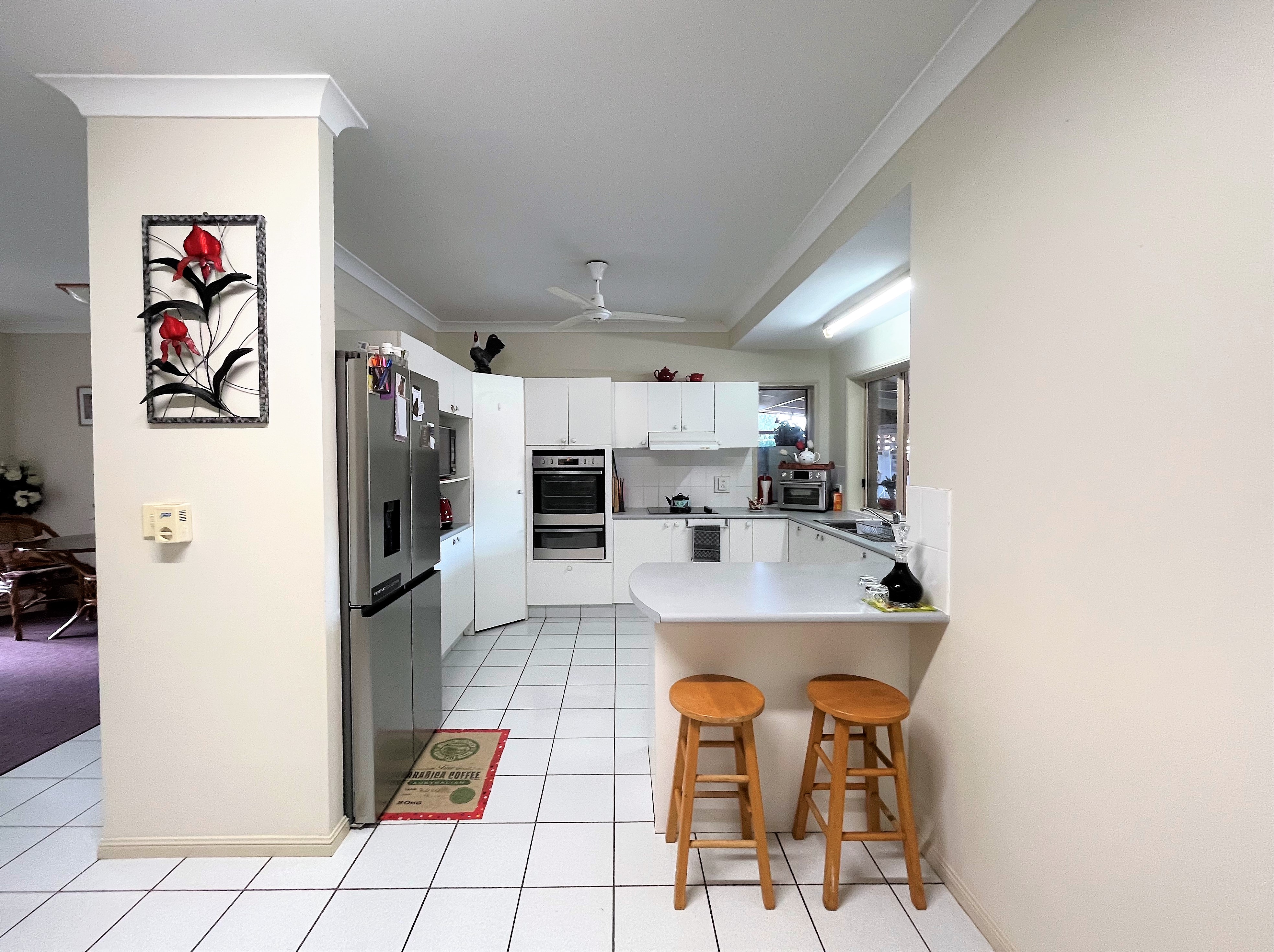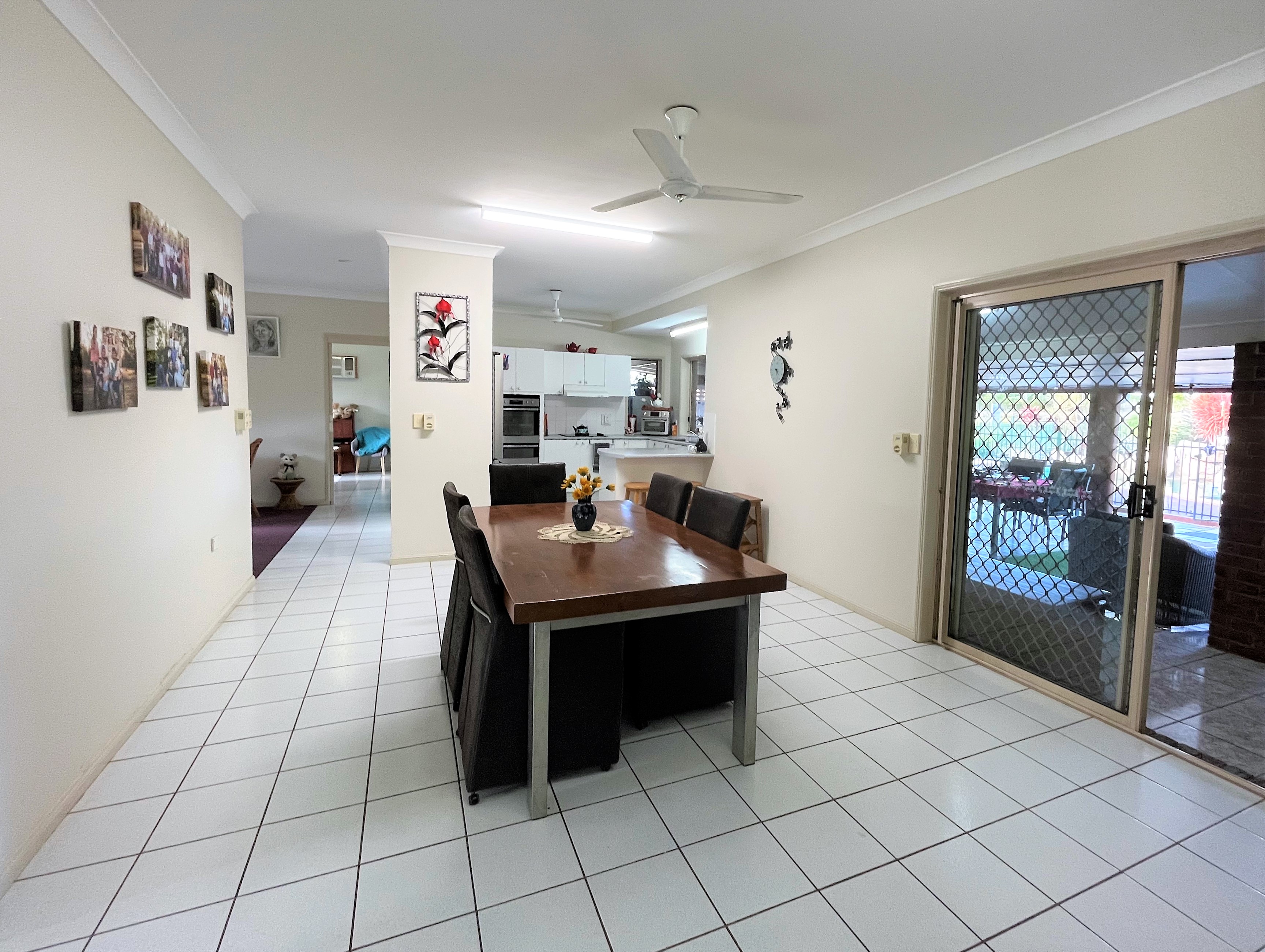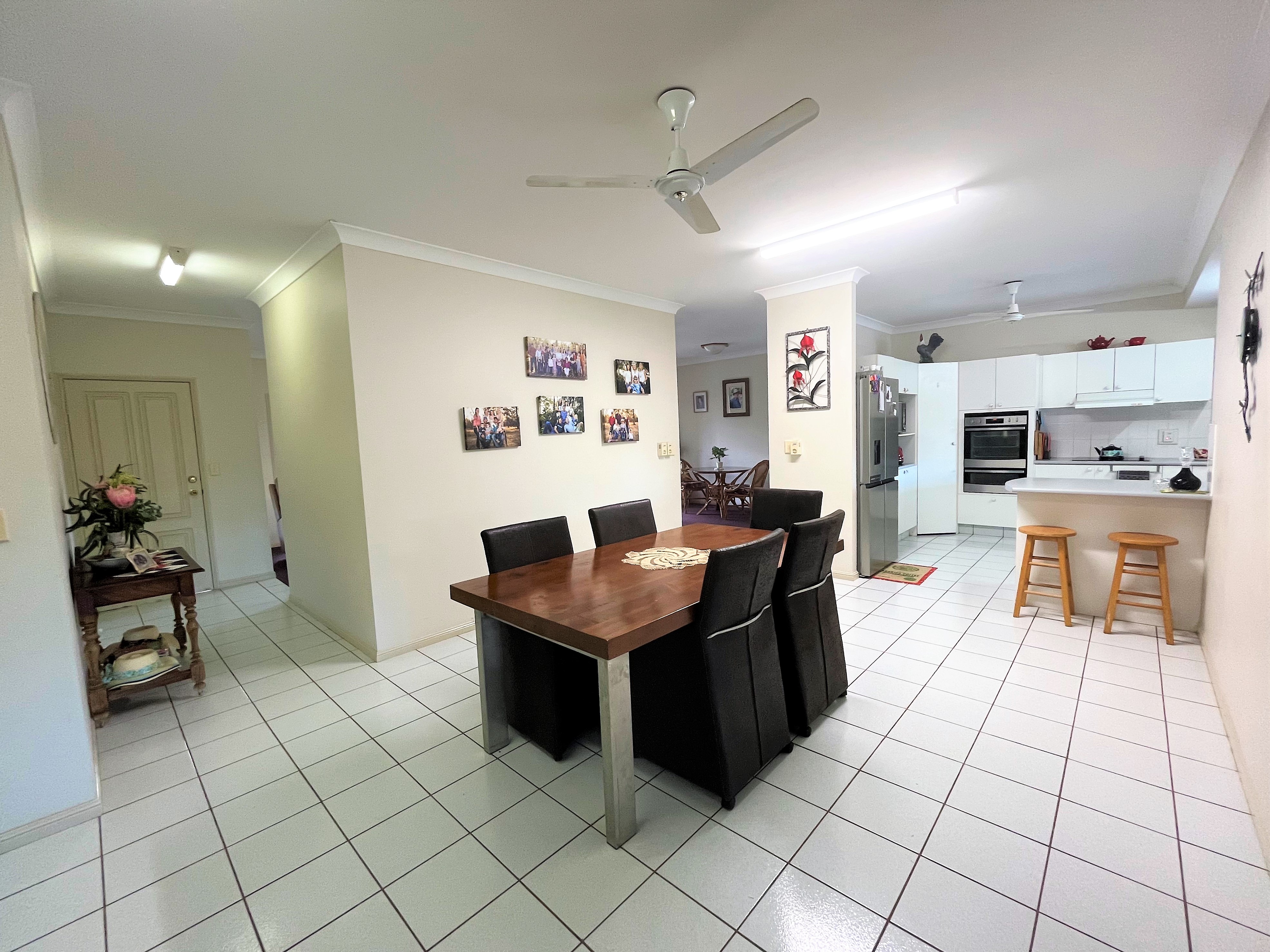 As you enter the home you walk into an open plan kitchen and dining area. The kitchen has stainless steel appliances, ample storage space, a breakfast bar and servery window to the large outdoor entertainment area.