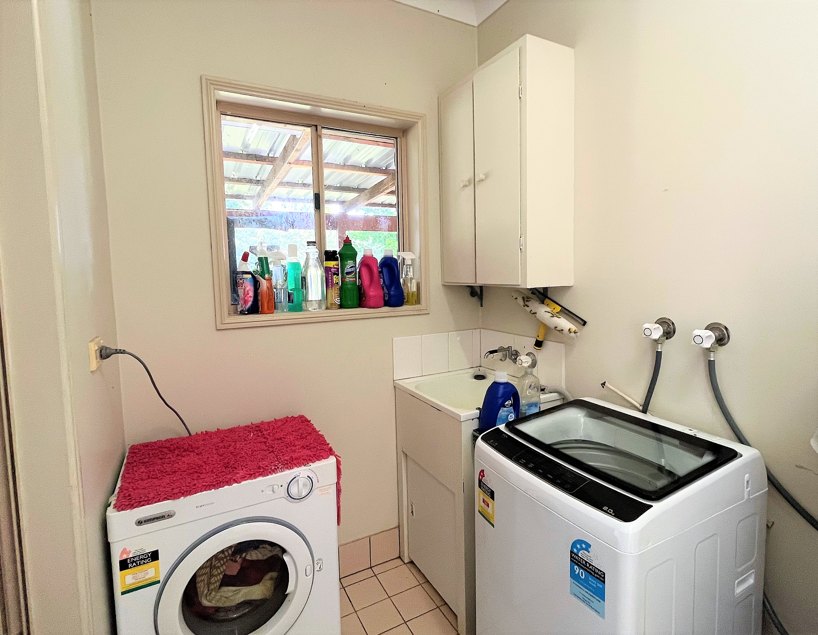 The laundry is located in its own room with a standalone sink area and ample space for a large washing machine and dryer.