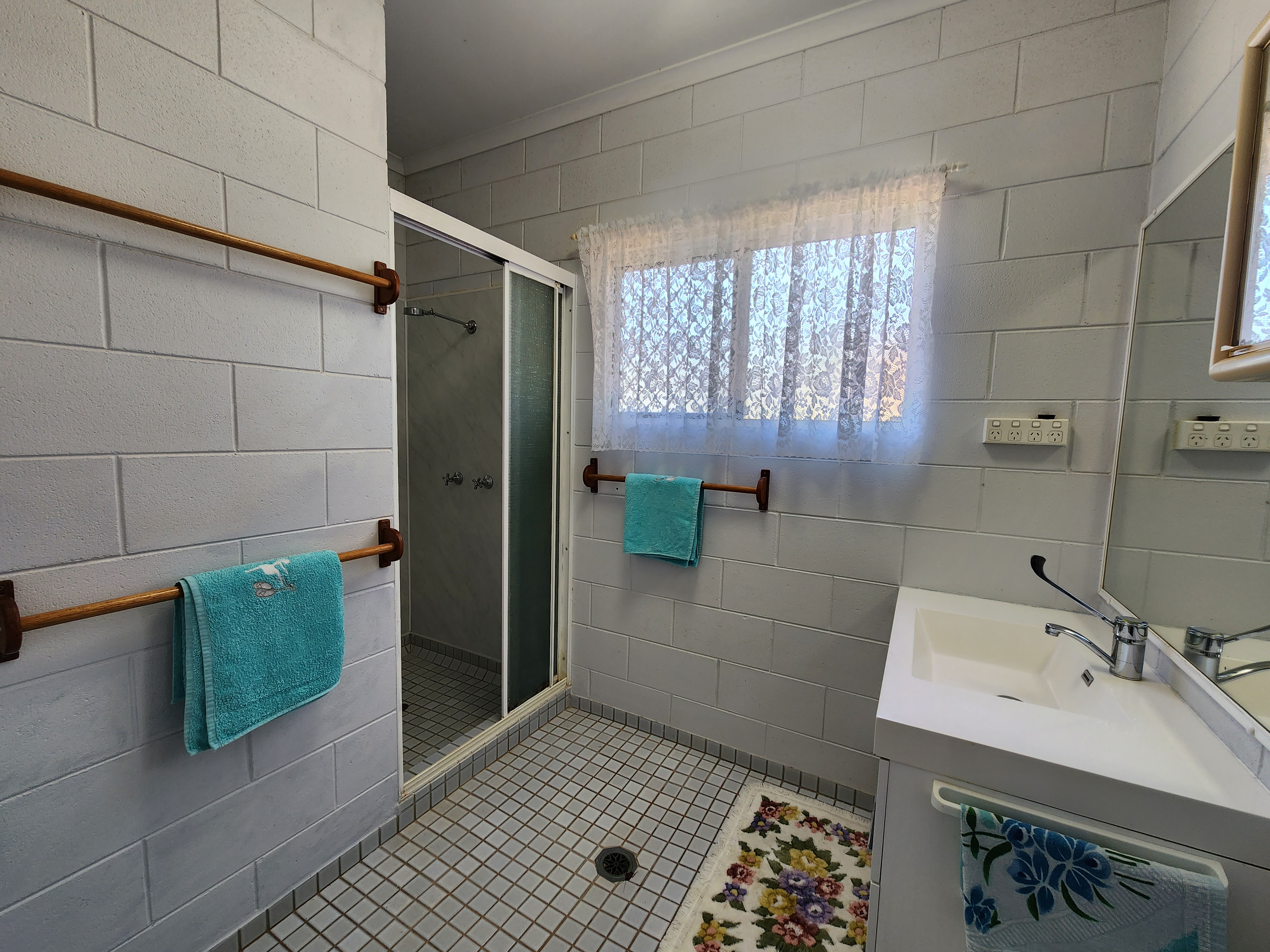 A partially updated bathroom provides a linen cupboard, shower and modern vanity.