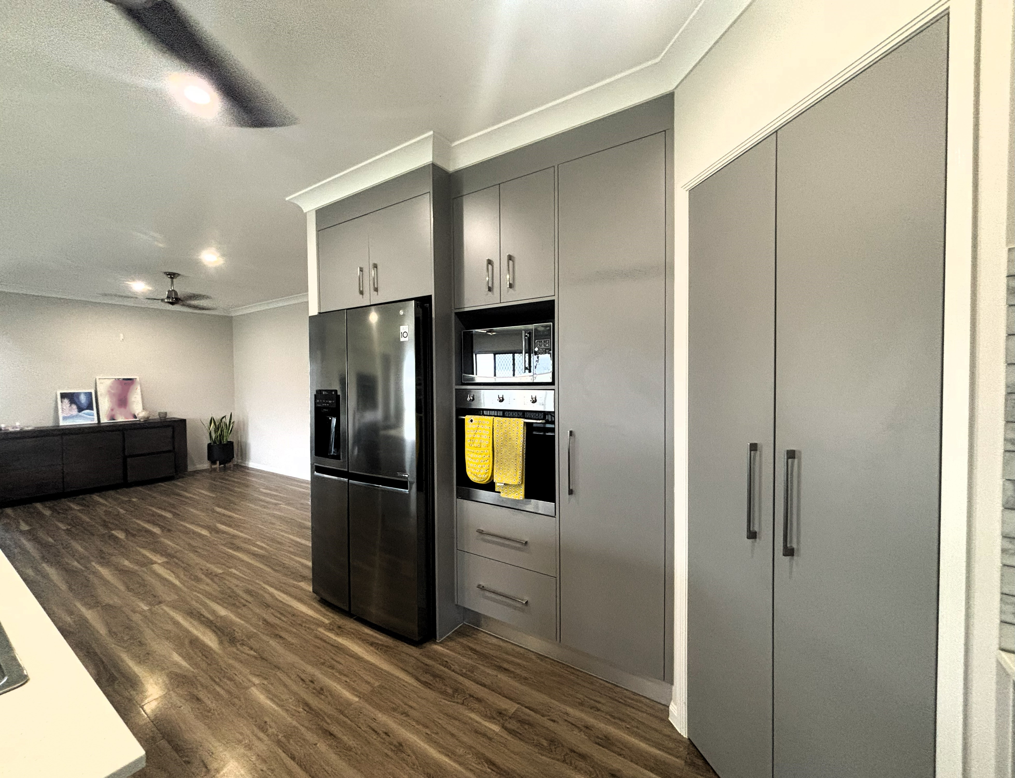The internal laundry features an expansive laminate countertop with storage space underneath, complemented by a built-in cupboard located in the hallway. Additionally, it is equipped with a built-in laundry sink.