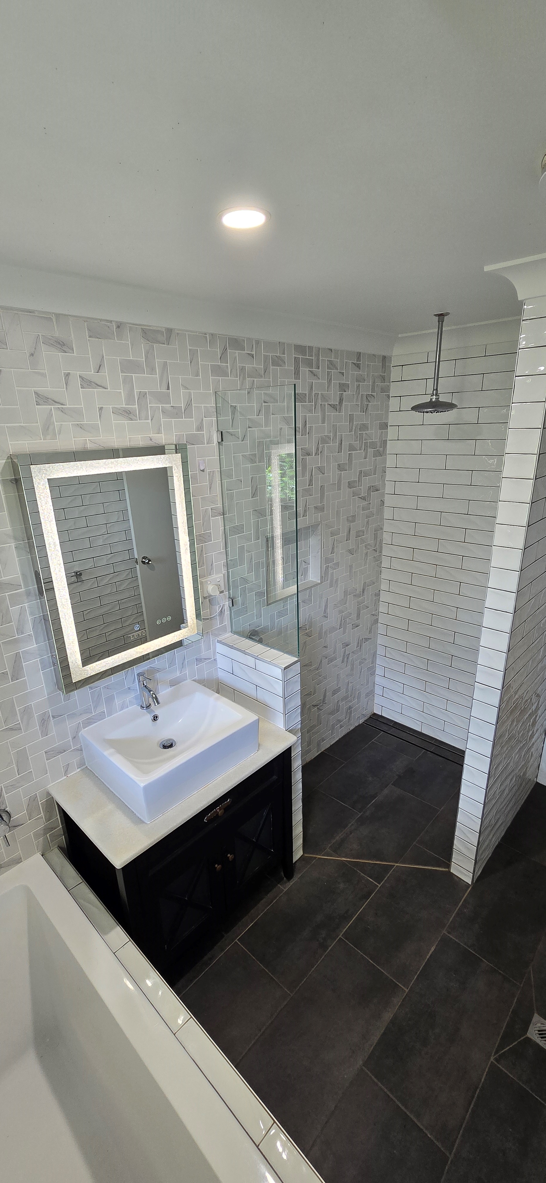 The renovated bathroom has a separate shower with the added bonus of a deep soaking bathtub and the luxury of a Ultra Luxe LED Mirror with touch control.