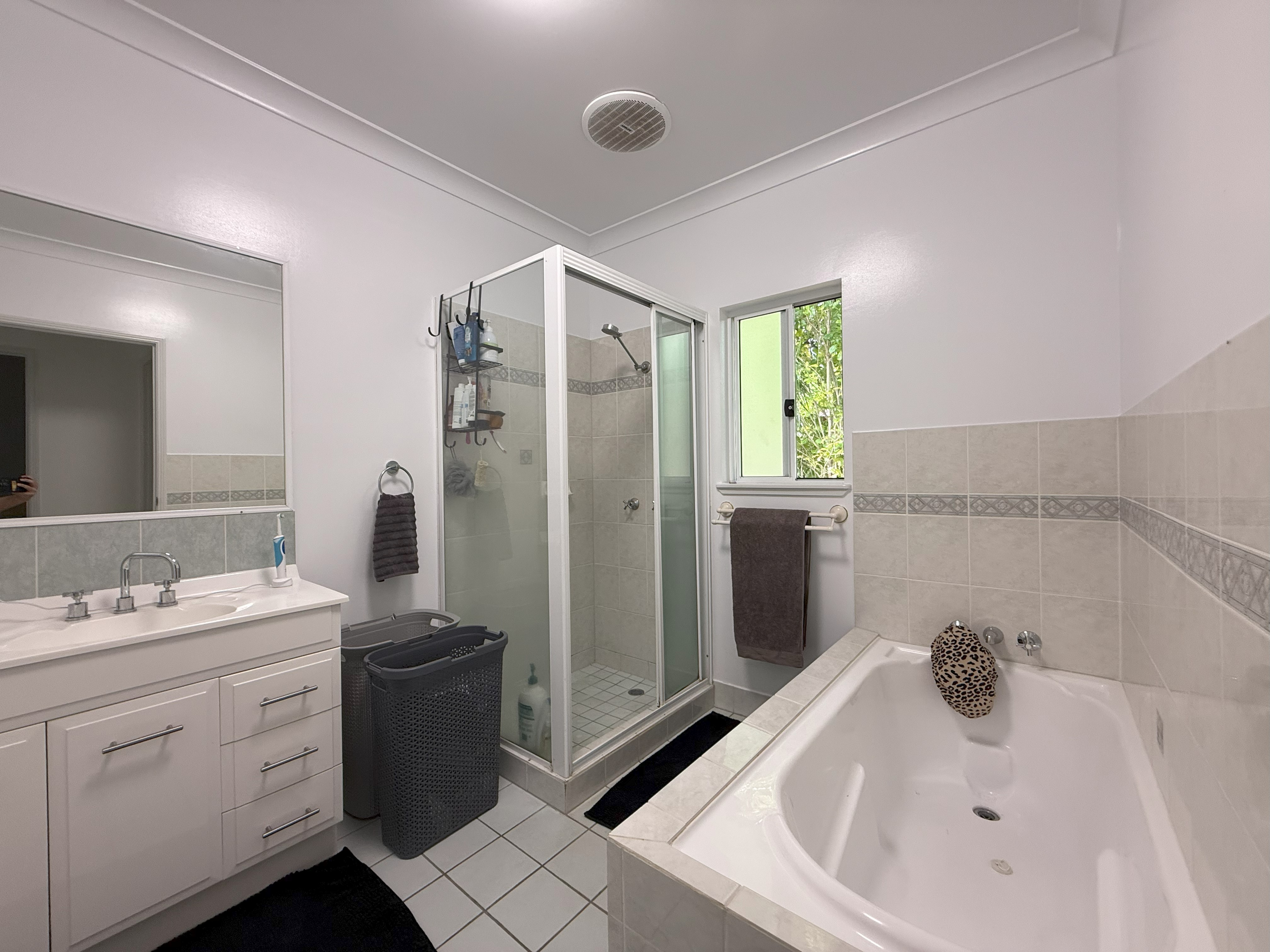 The main bathroom includes a bathtub and a separate shower, offering flexibility for families.