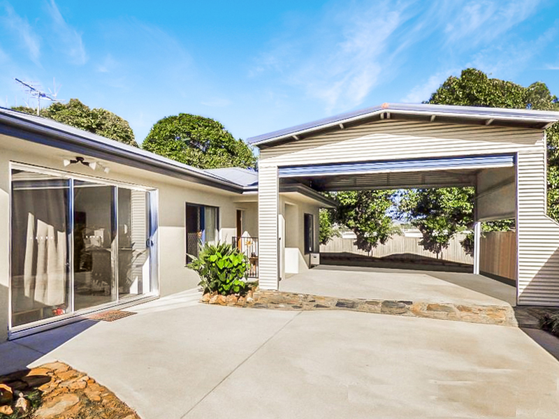Outside, the high-clearance carport—ideal for a large boat or caravan—is secured by an automatic roller door, with two additional open parking spaces in front. On the opposite side of the home, an undercover patio area provides the perfect space for a BBQ or outdoor entertaining.