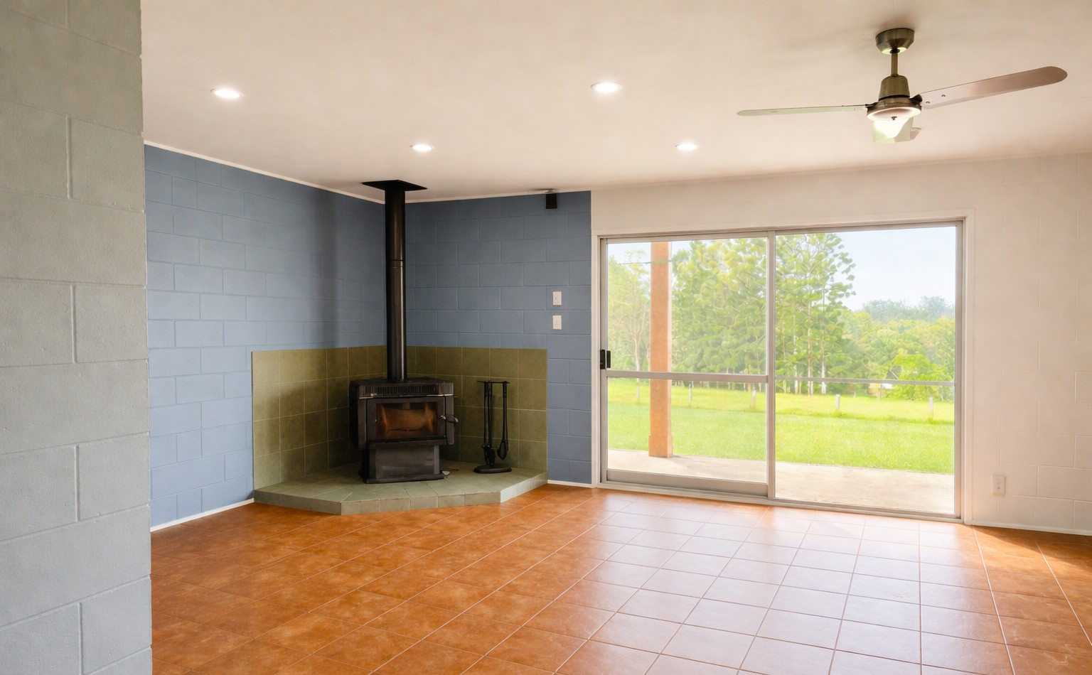 The home features three bedrooms and one central bathroom, along with a spacious open plan kitchen, dining and living area. The kitchen offers ample cupboard space and a gas stove, while the lounge room includes a wood heater, perfect for the cooler months.