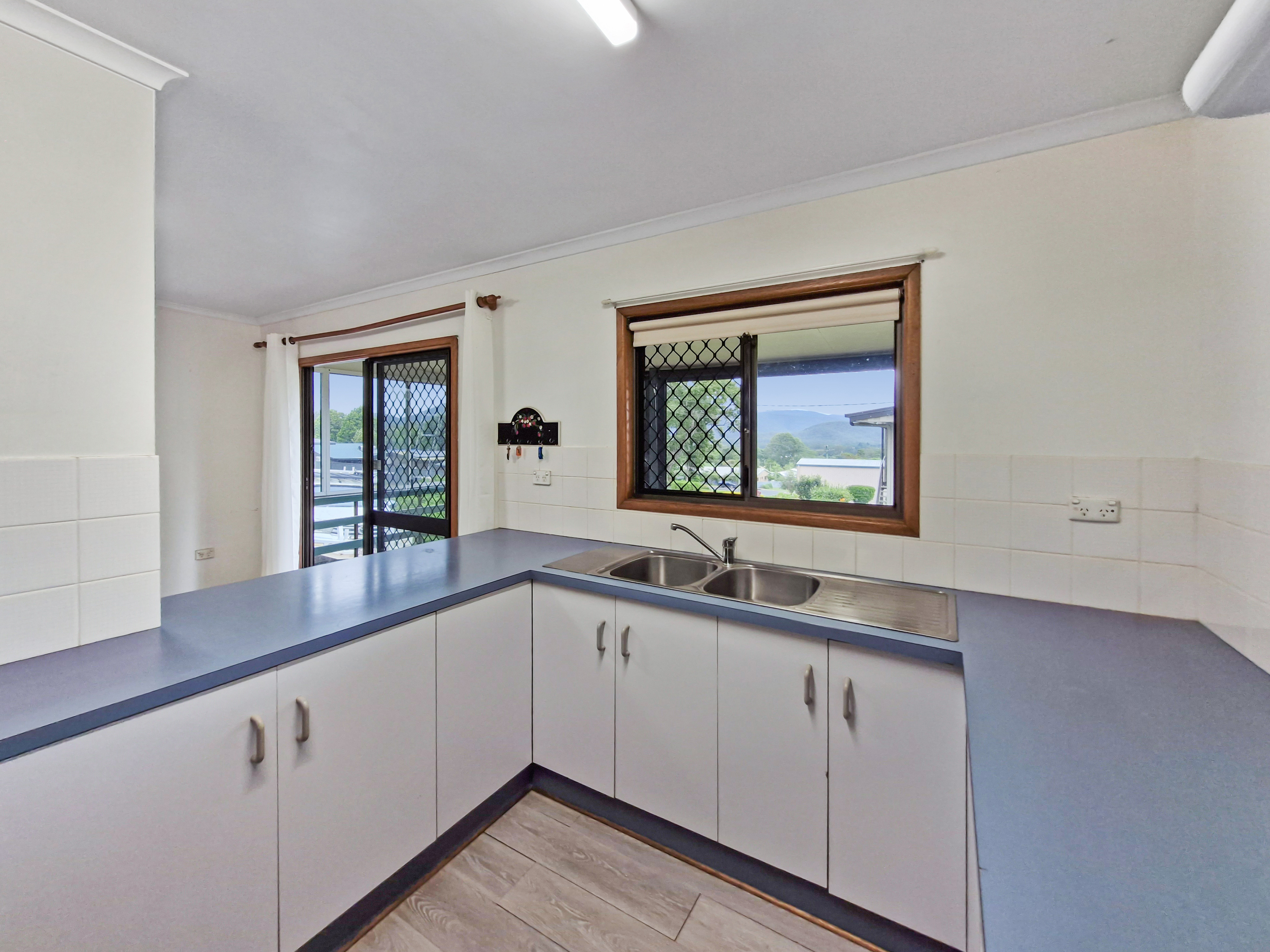 Stepping inside off the large timber deck, you’re greeted by an open-plan kitchen, lounge and dining area. From the glass sliding entry doors and the kitchen window, you can enjoy views of the Baldy Mountain forest reserve, all from the comfort of the air-conditioned space.