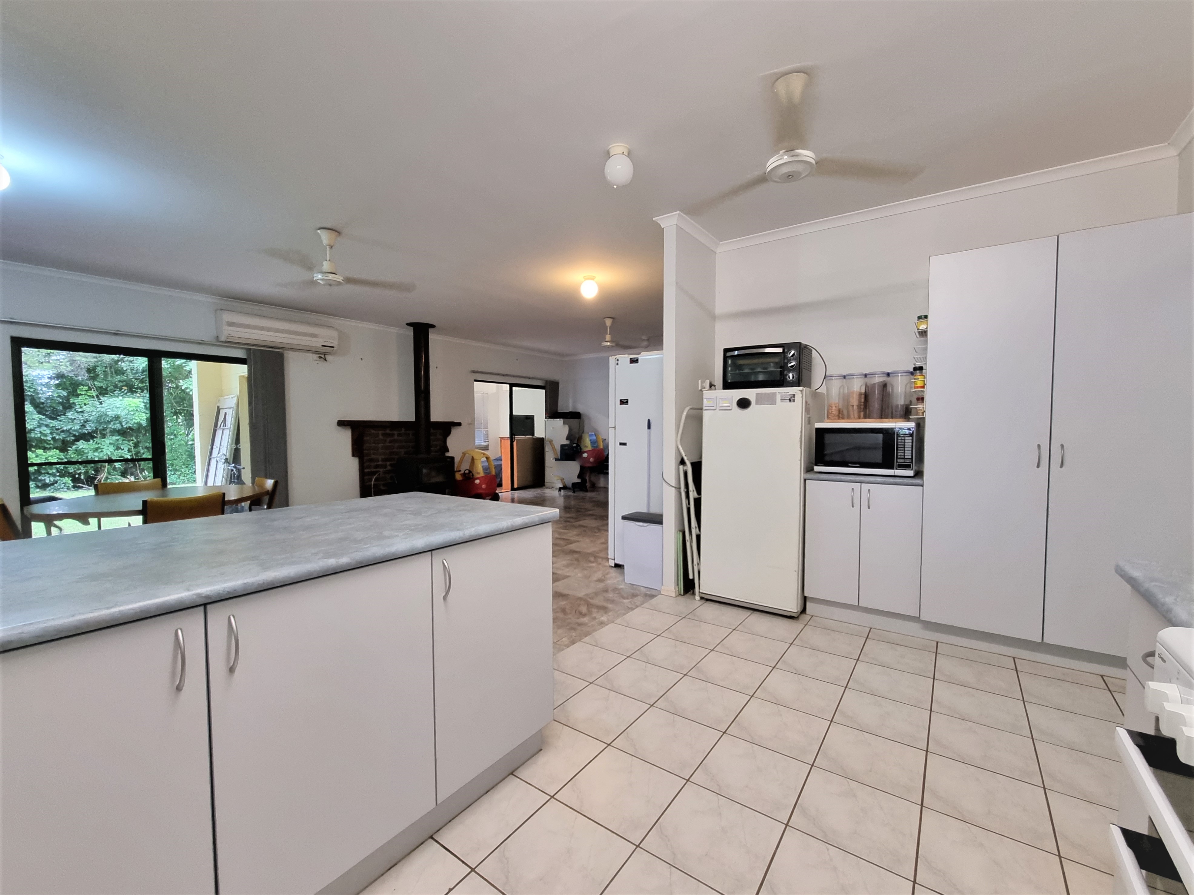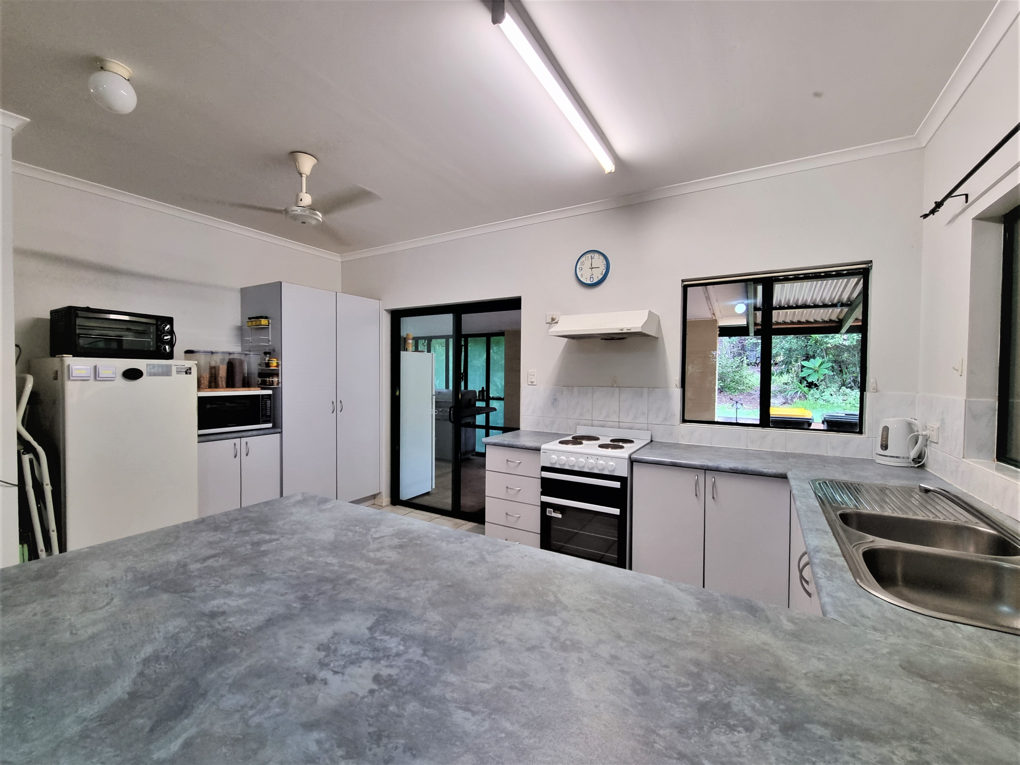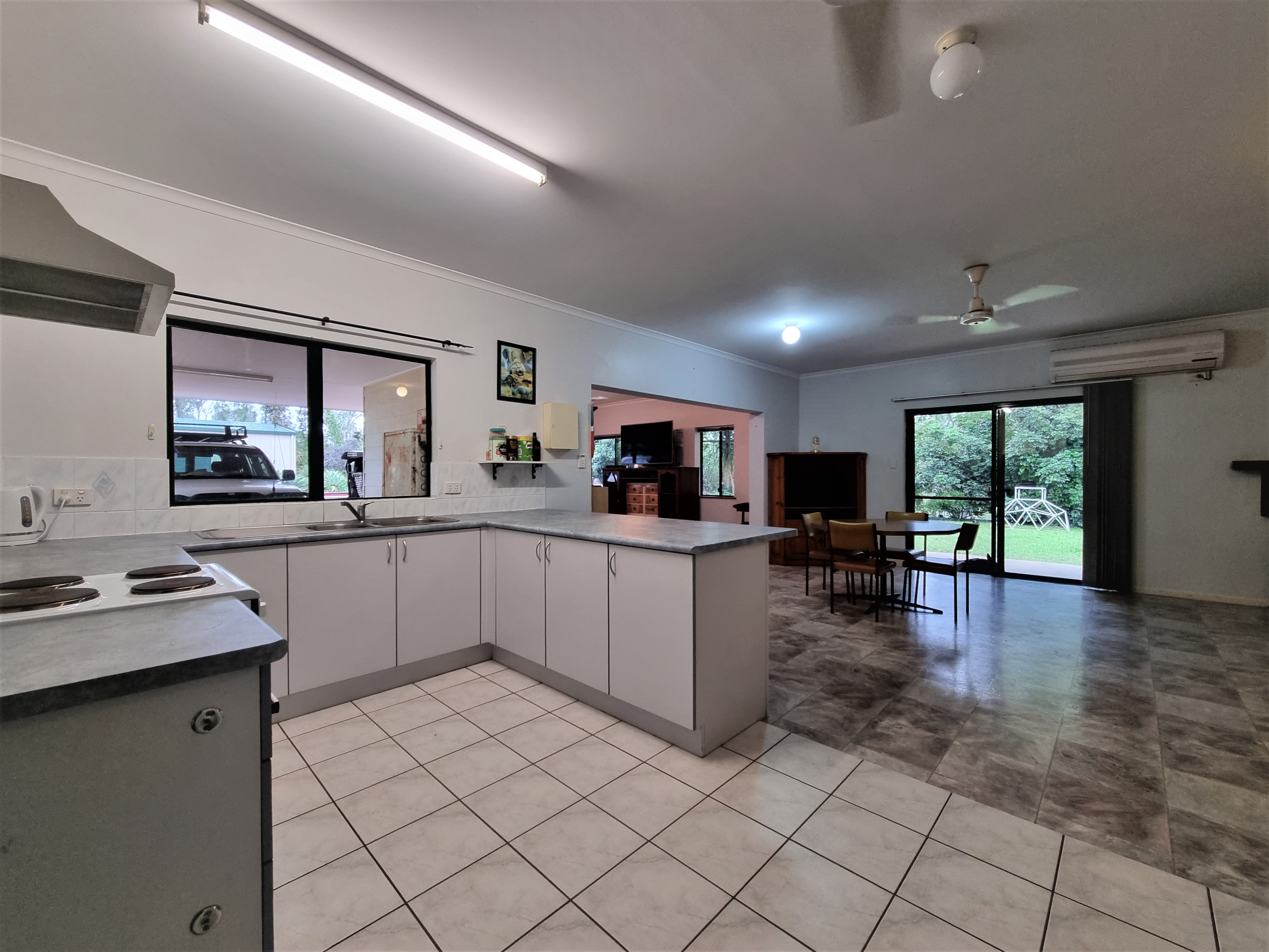 The open plan kitchen features a new electric oven, rangehood, pantry, and breakfast bar with sliding glass doors leading out to the single carport.