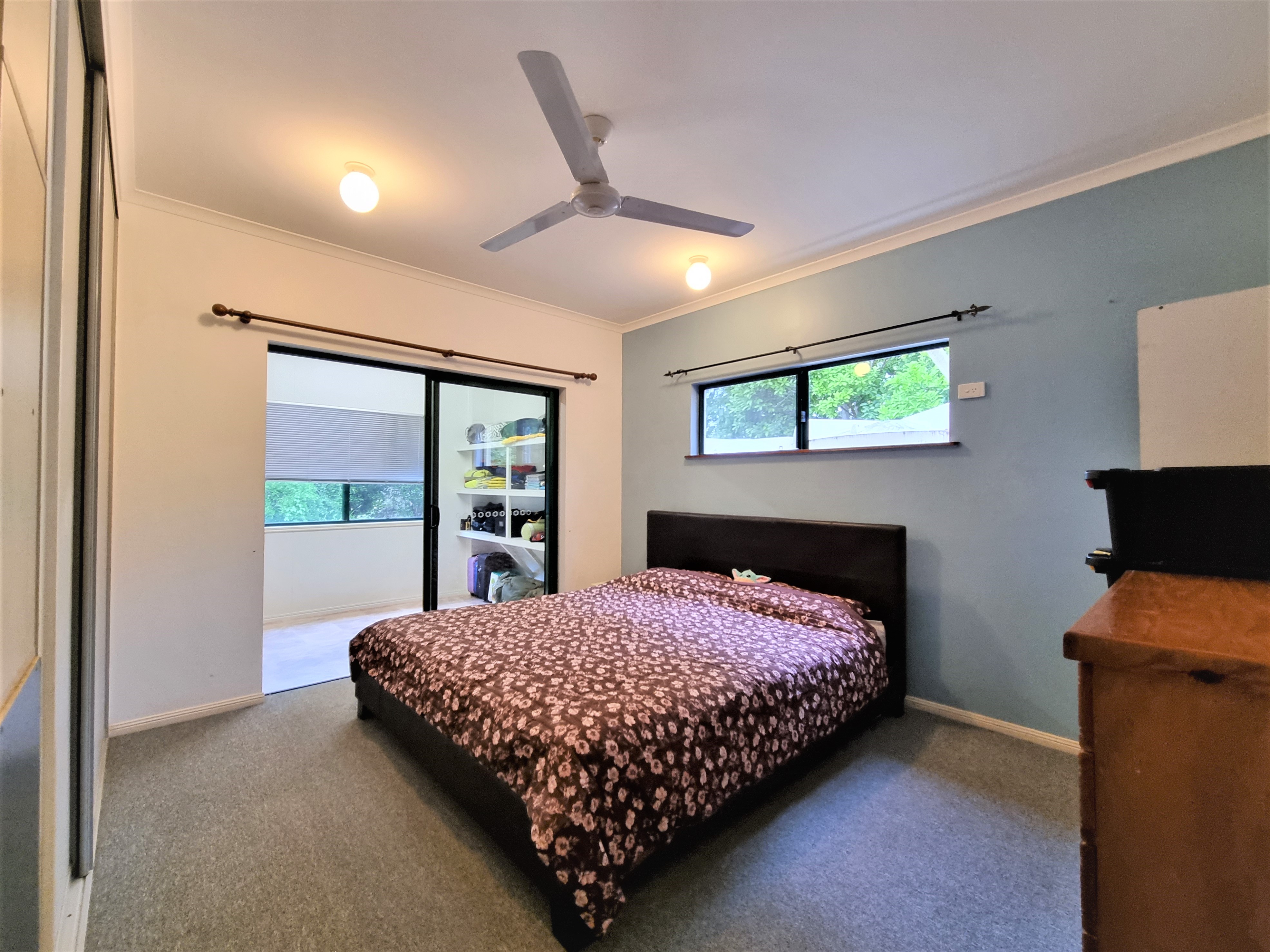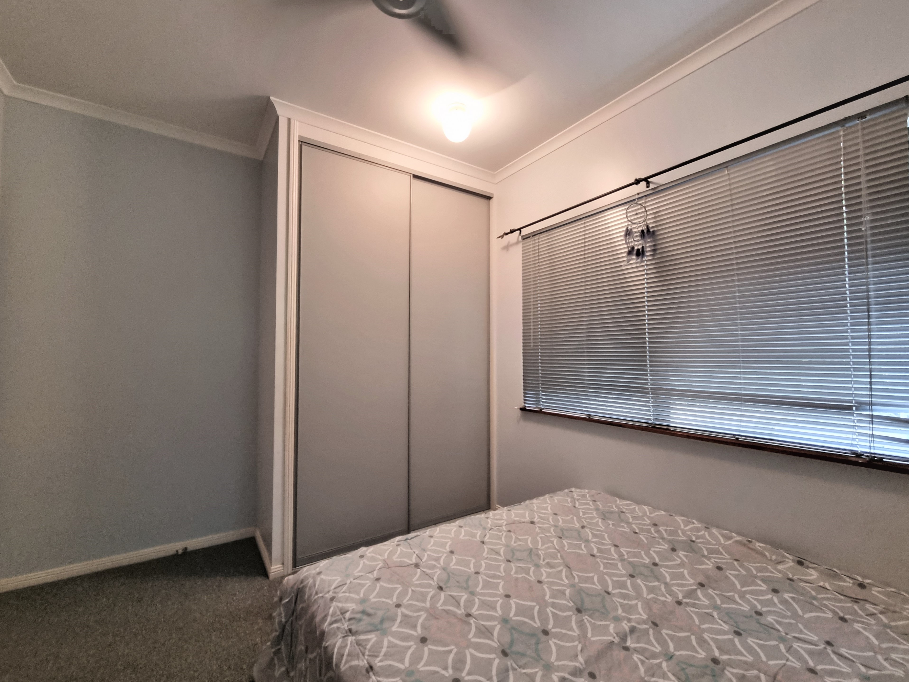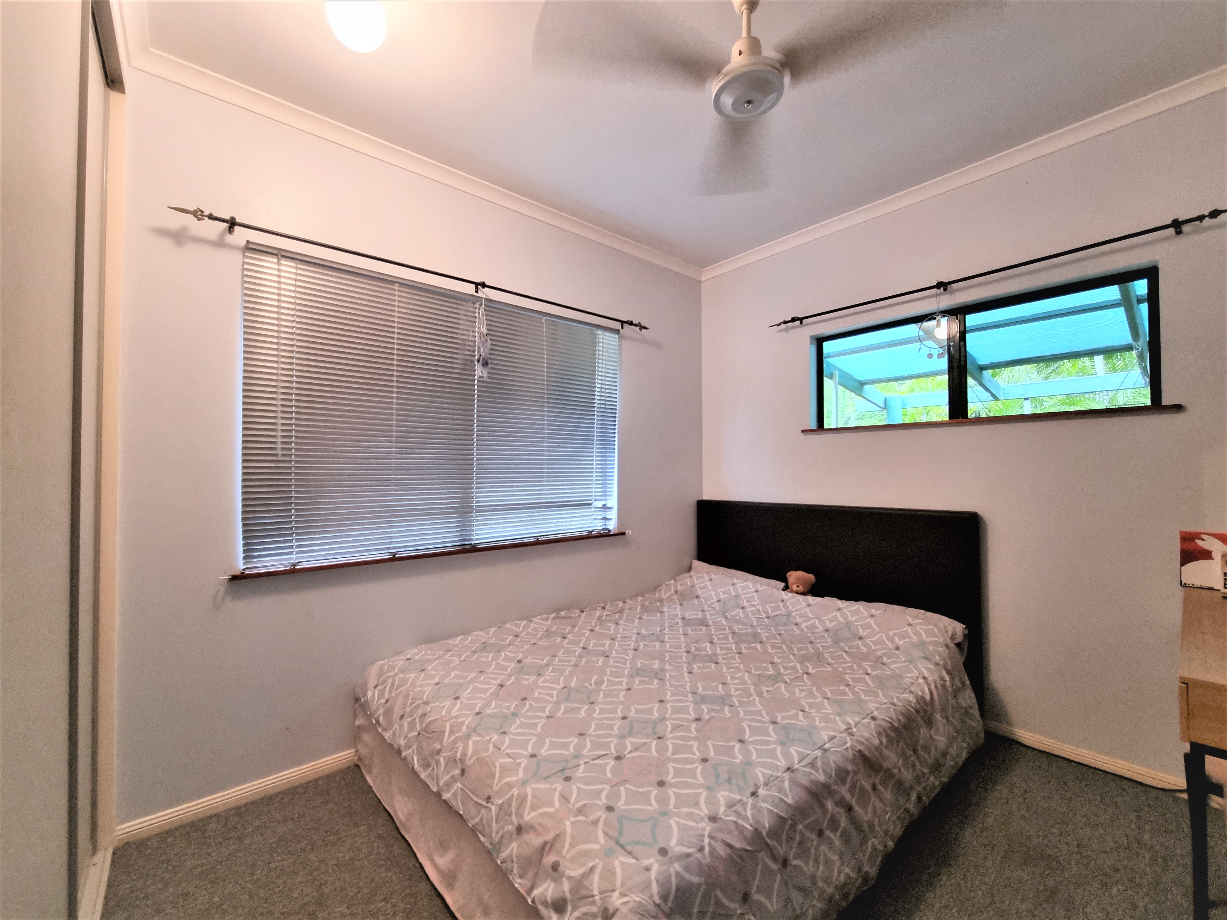 The second bedroom has a built in wardrobe and a fan.