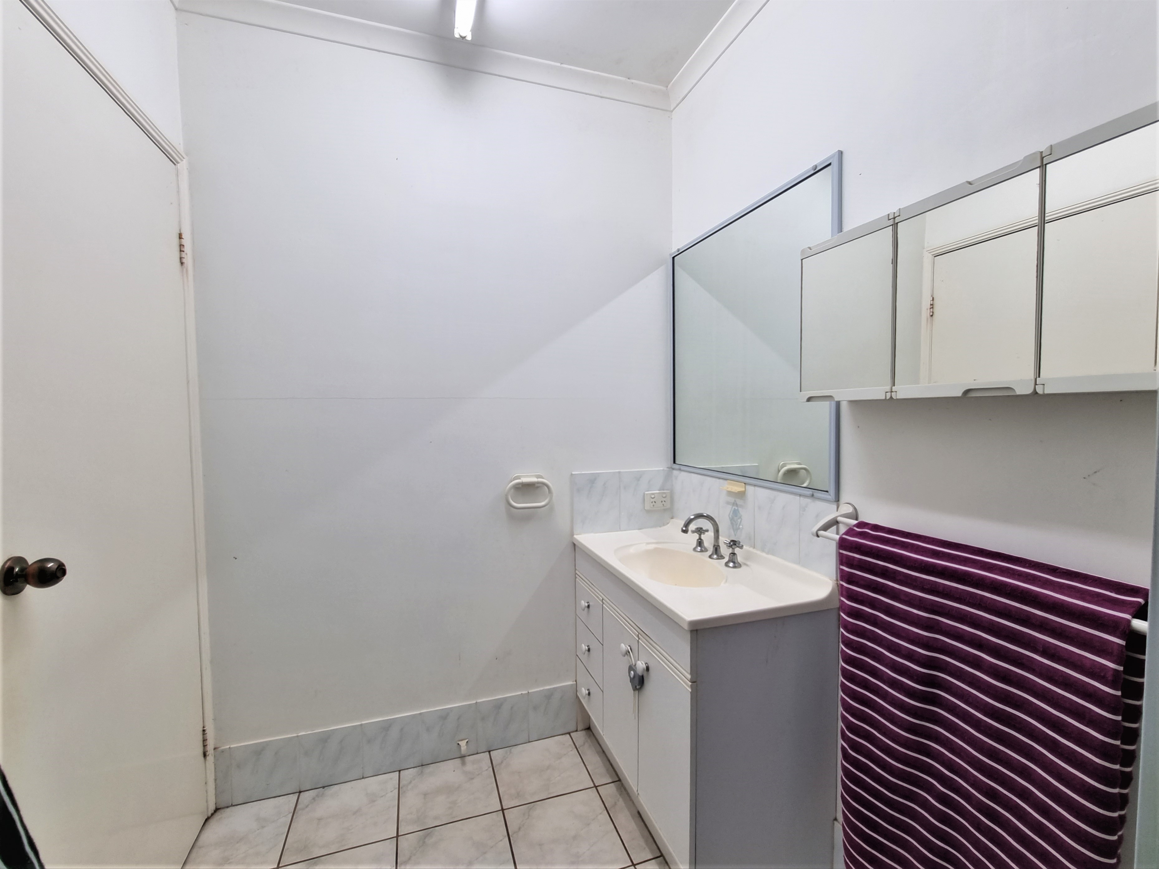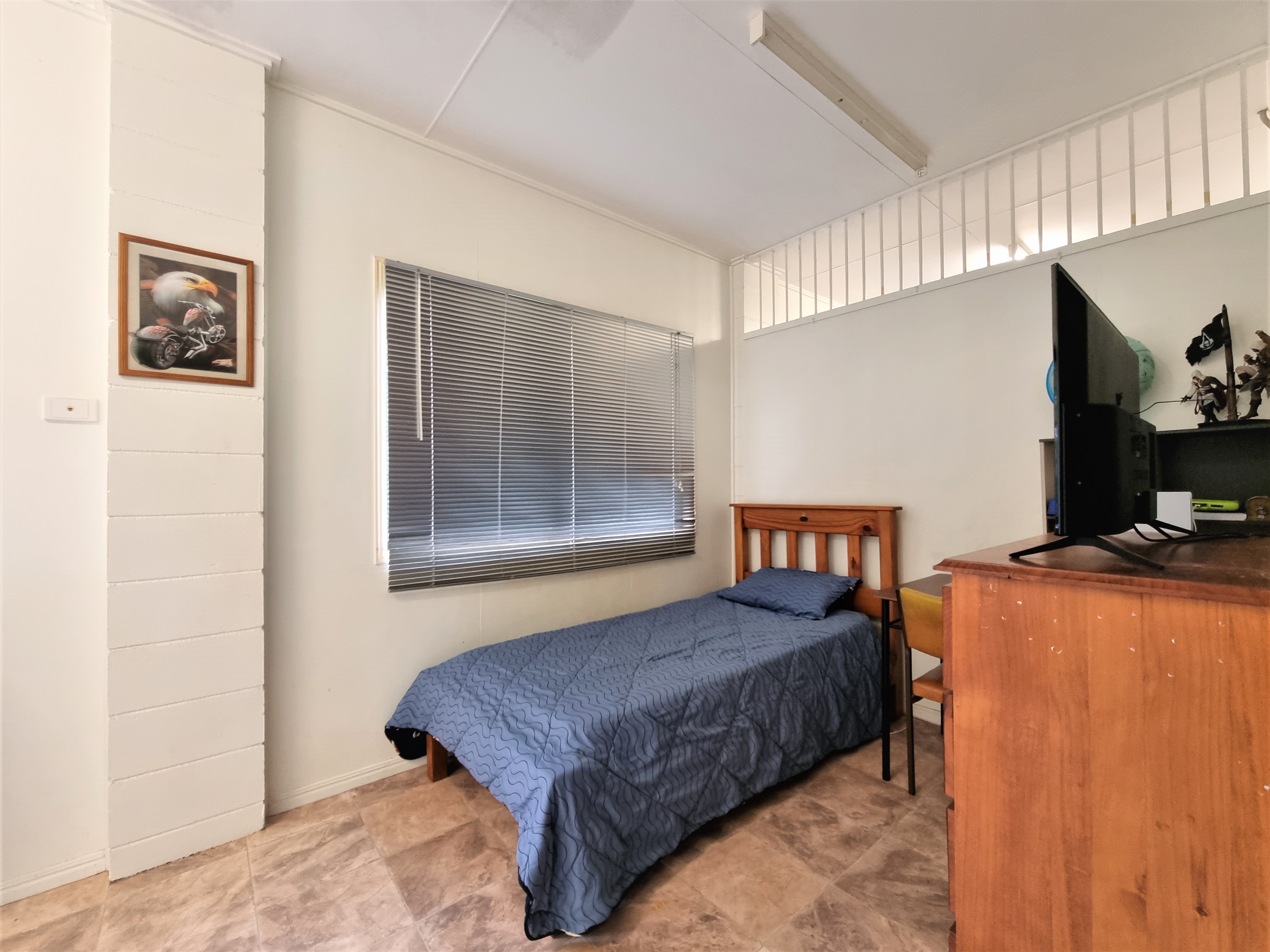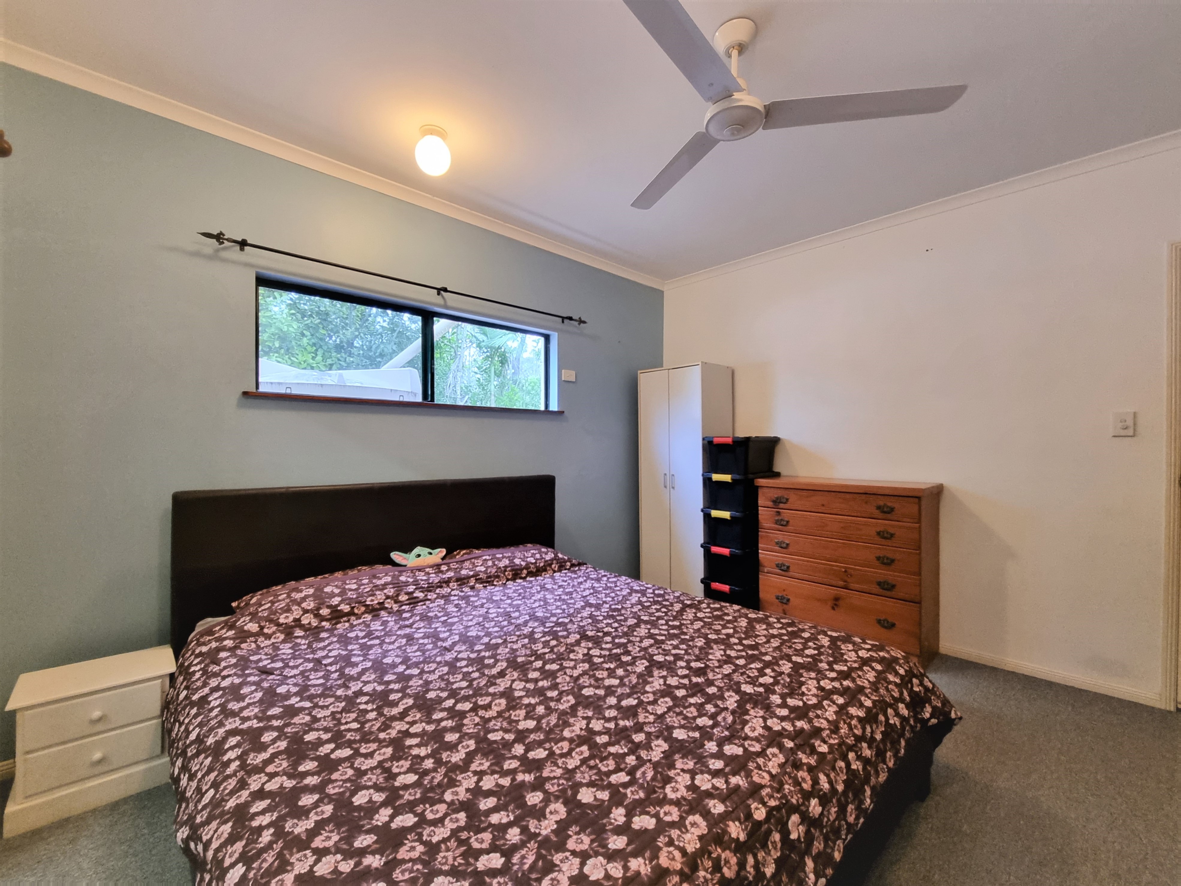 The second bedroom has a built in wardrobe and a fan.