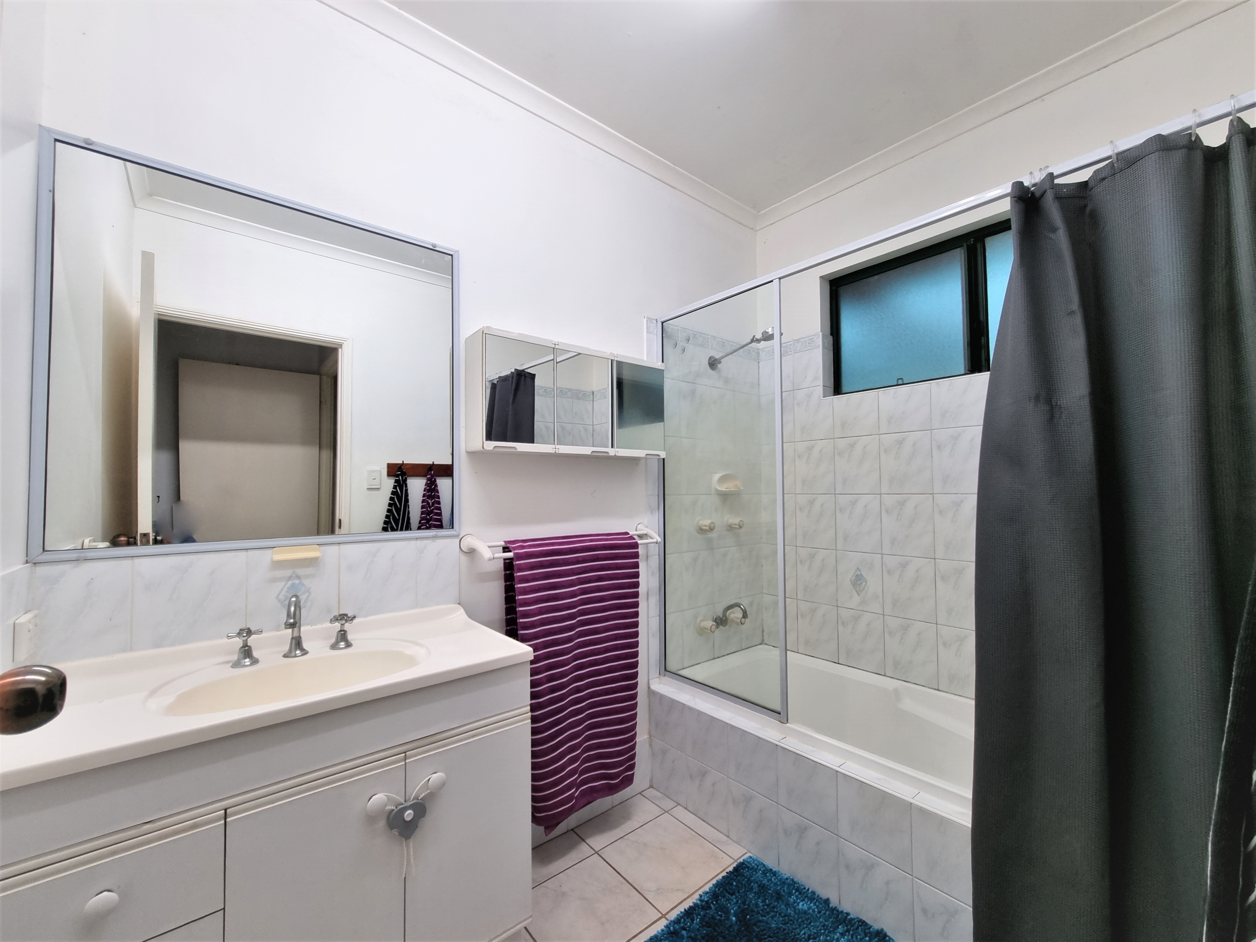 The bathroom features a vanity, and shower over the full length bath.
