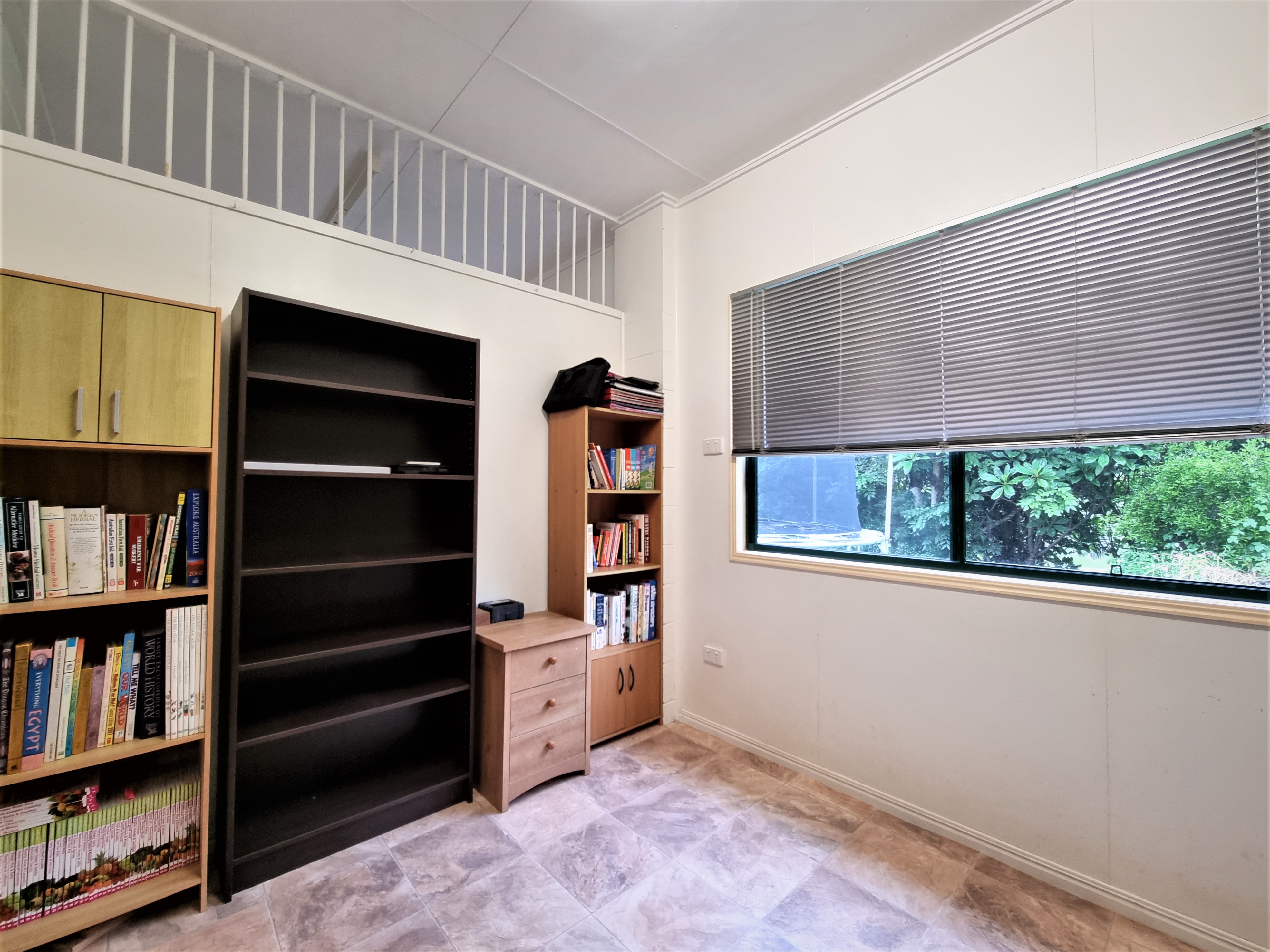 The master bedroom features a large built in robe, fan and, a handy office/storeroom with views of the front yard also.