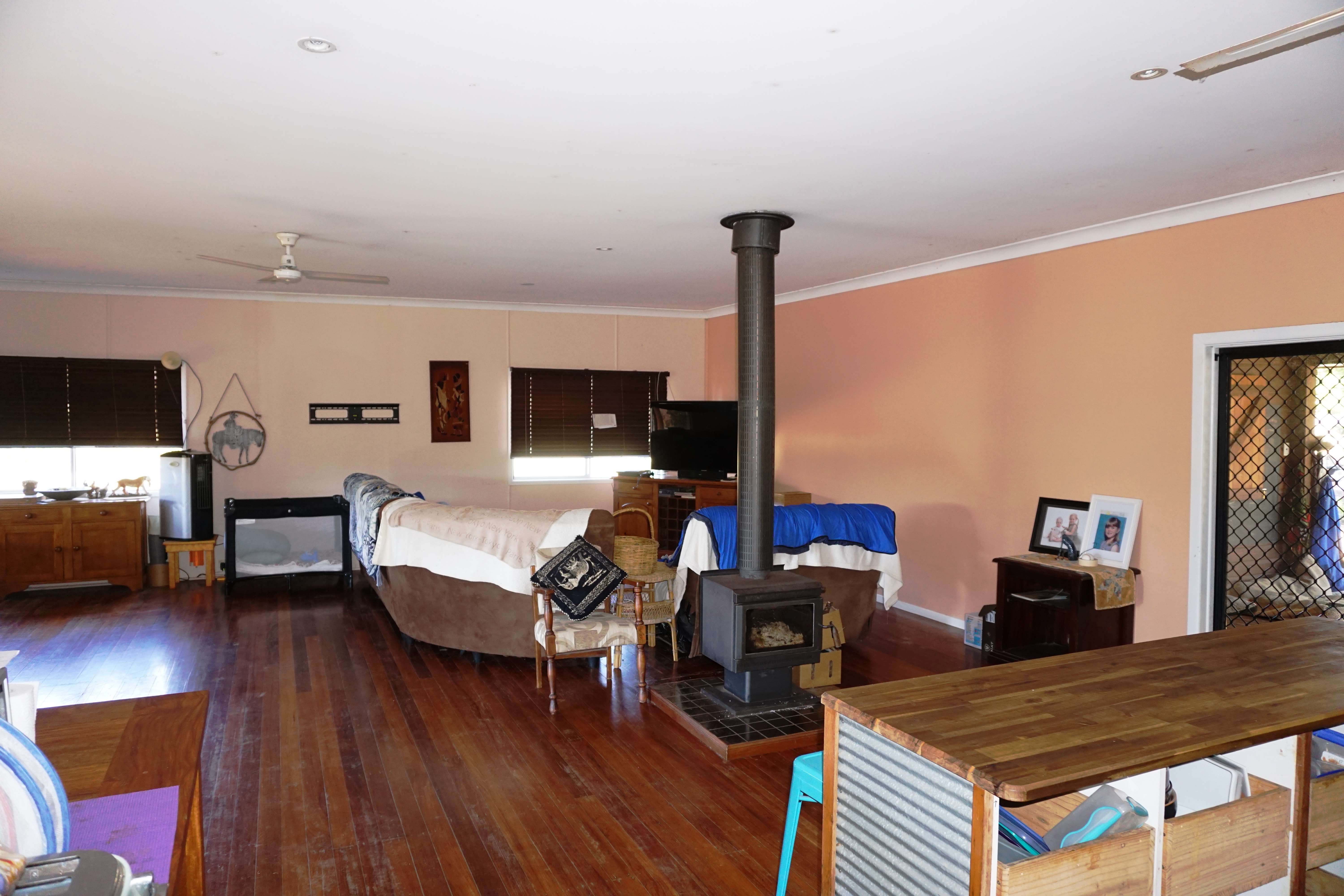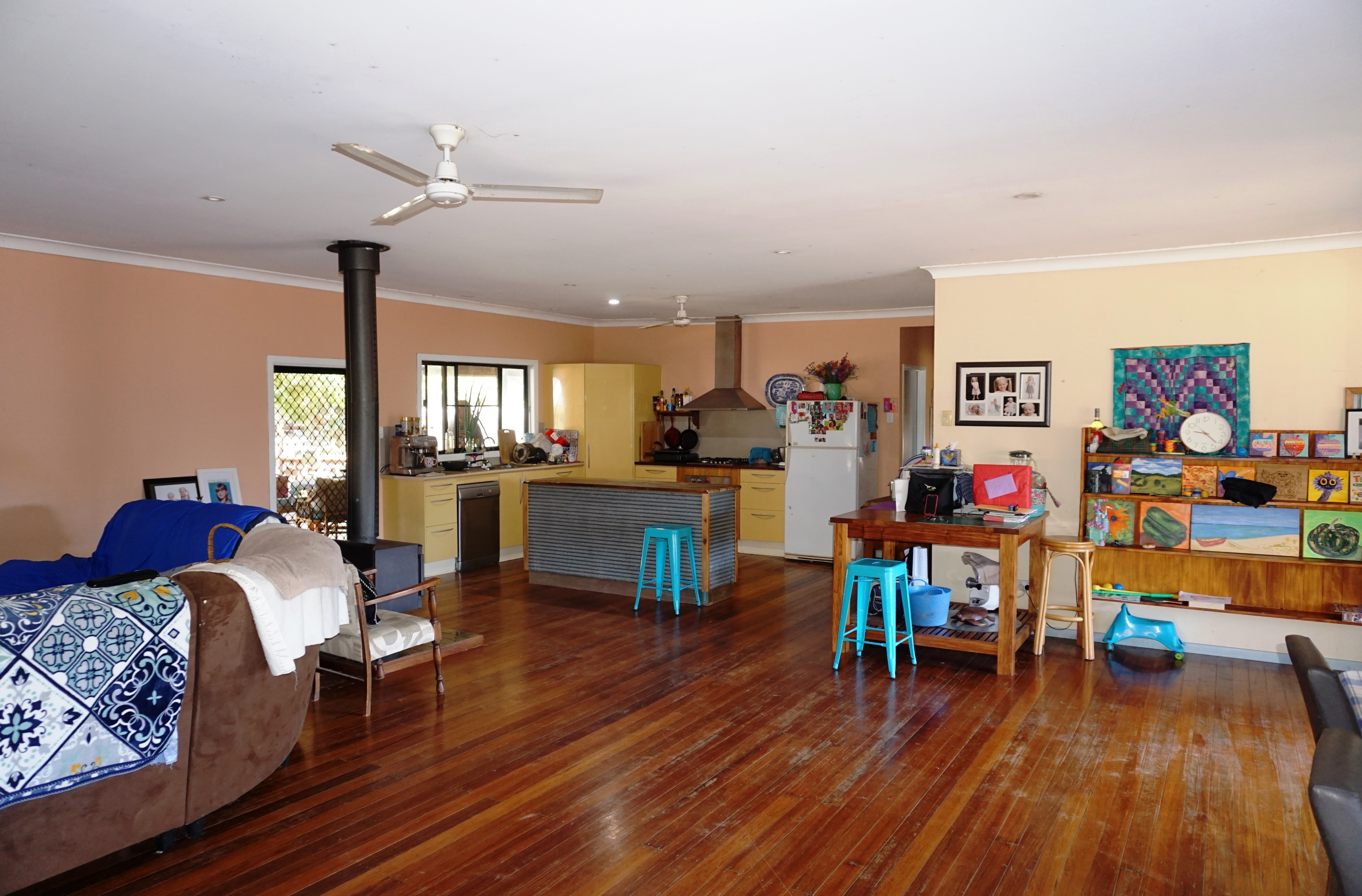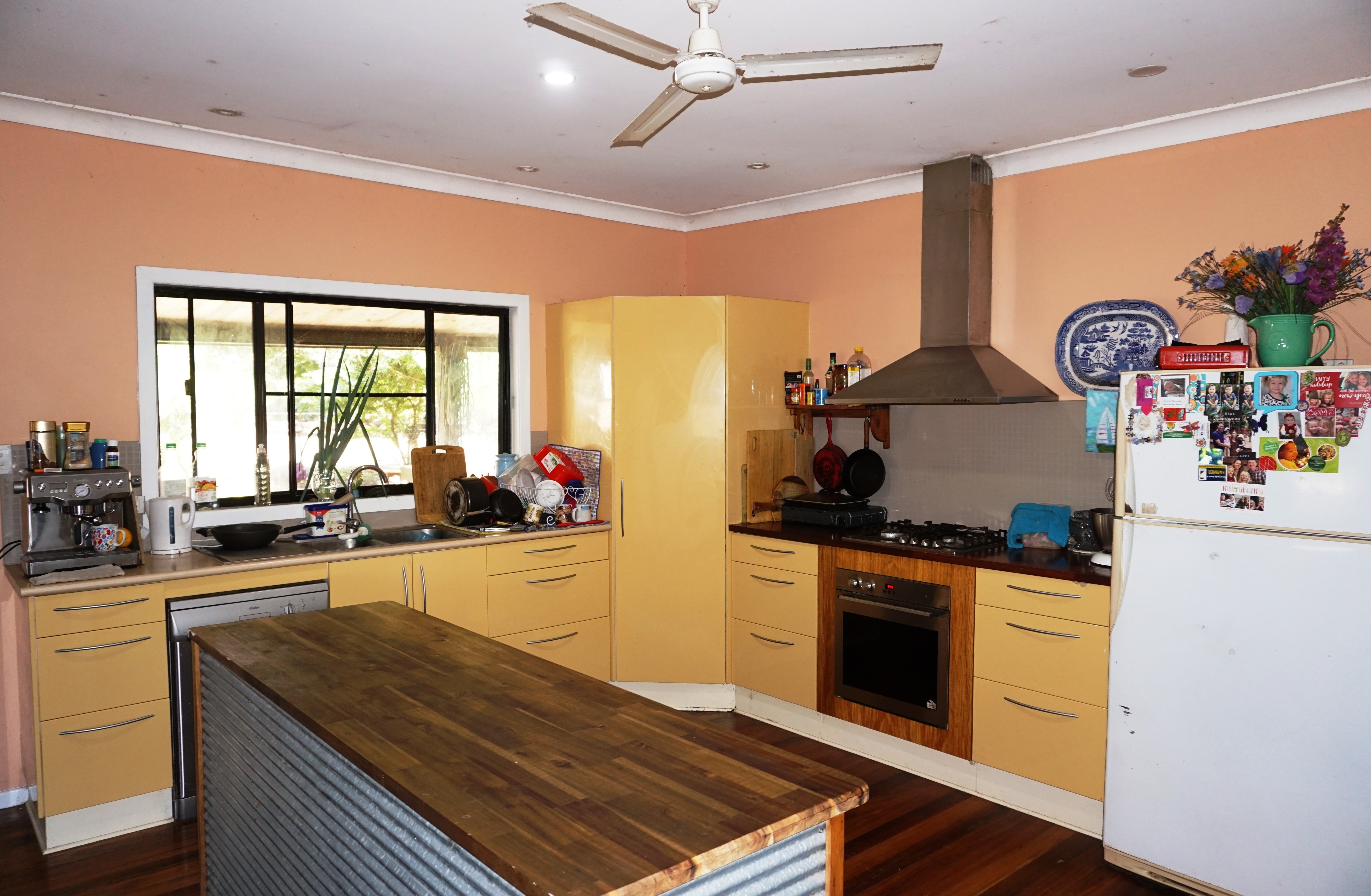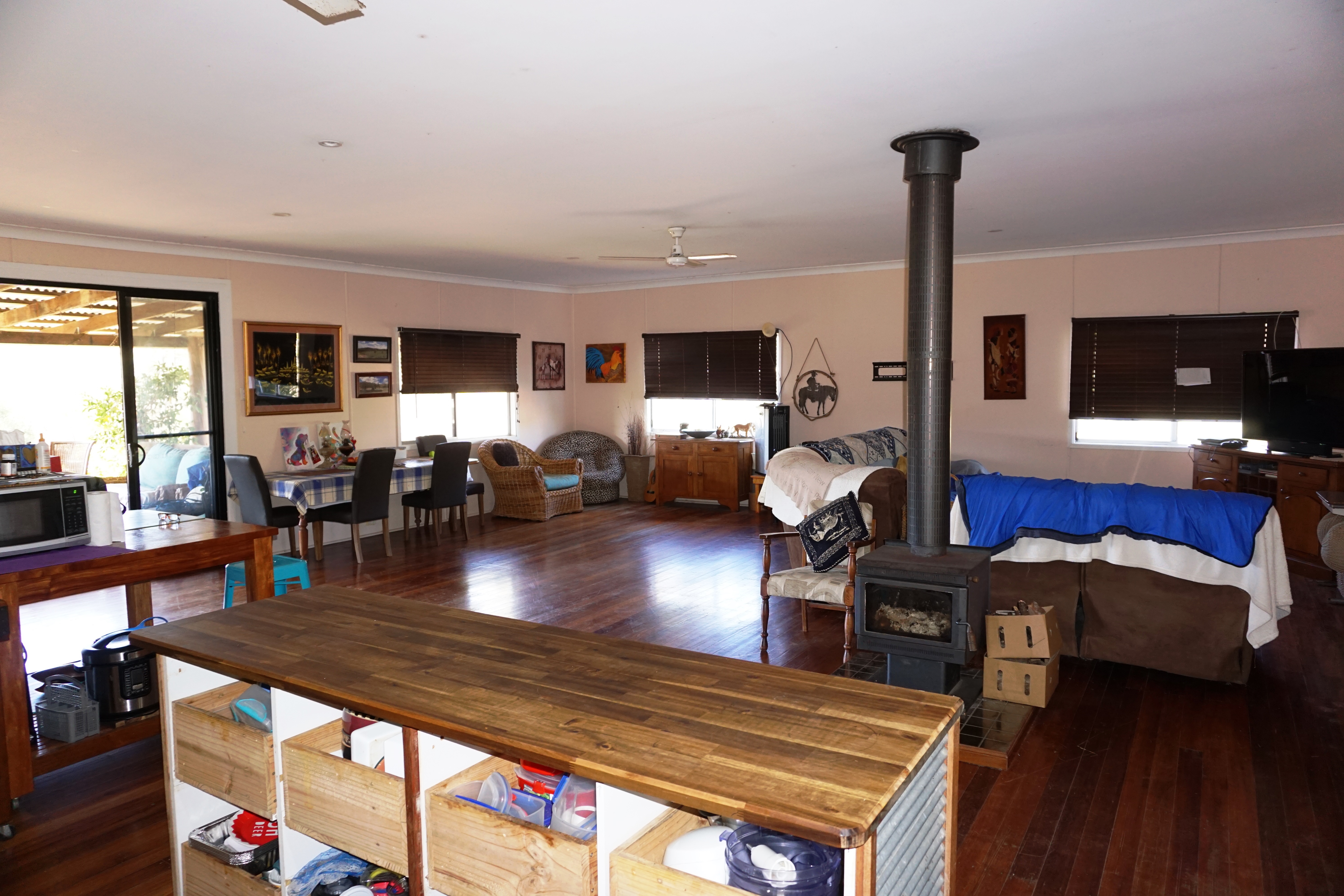 The property has a comfortable home with polished timber floors, a modern kitchen with gas cook top, pantry, dishwasher and island bench, and large open plan living area flowing through to timber decks on either side.