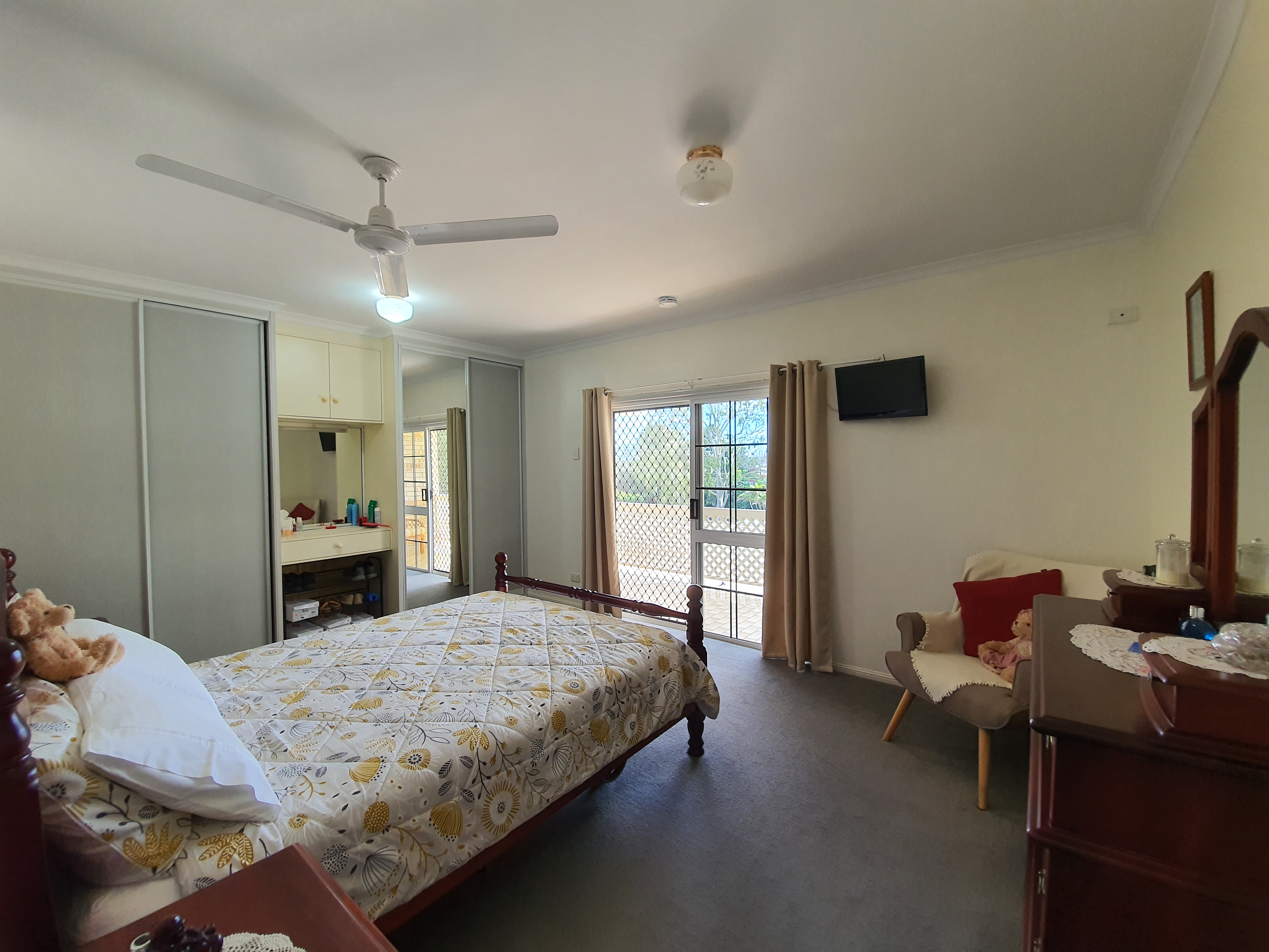 • Master bedroom with built ins, makeup bench and private balcony with views