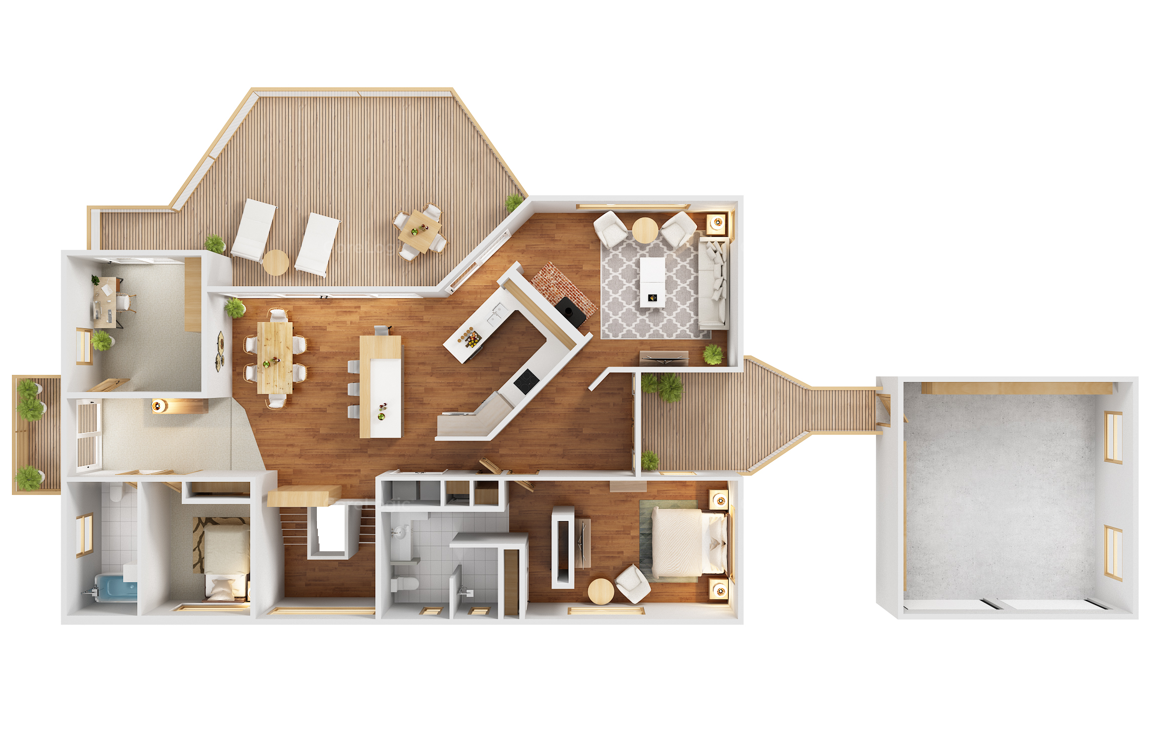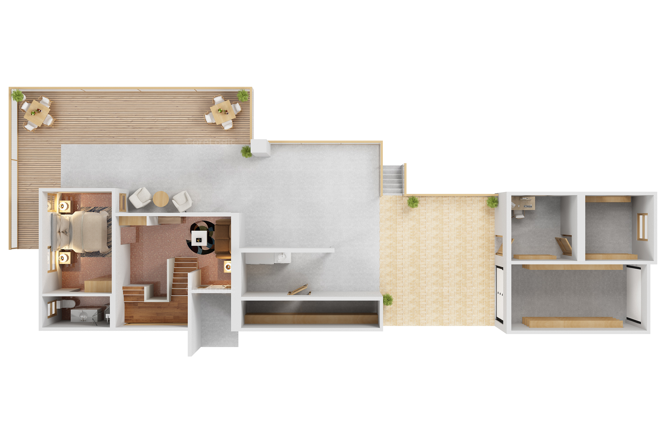 The upper level features the master bedroom with airconditioning, a spacious walk through his and hers built in wardrobe space and a stunning renovated ensuite. The second bedroom has its own access to the deck and the third bedroom is separated with a family bathroom. A small patio from the side overlooks the terraced and landscaped gardens.