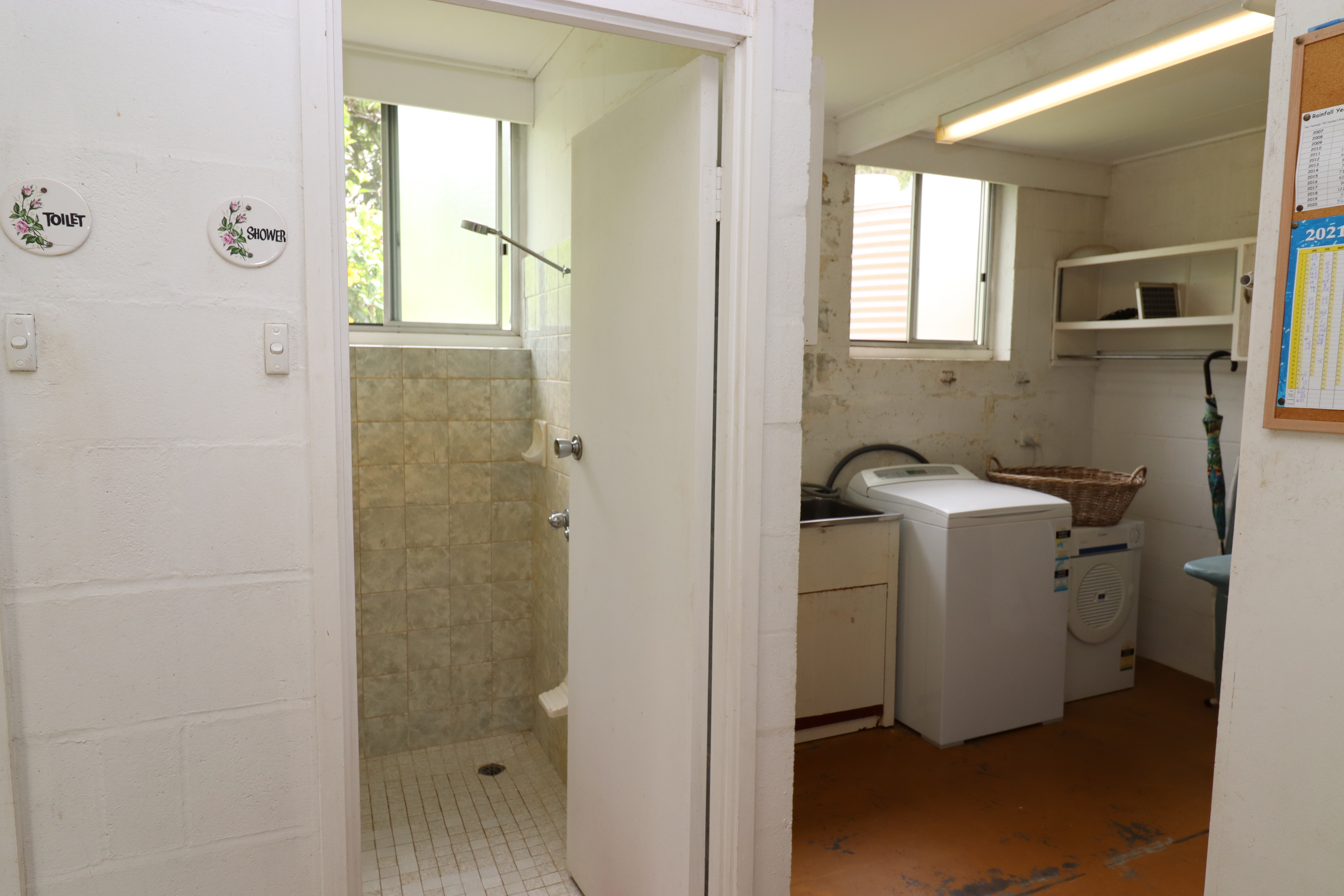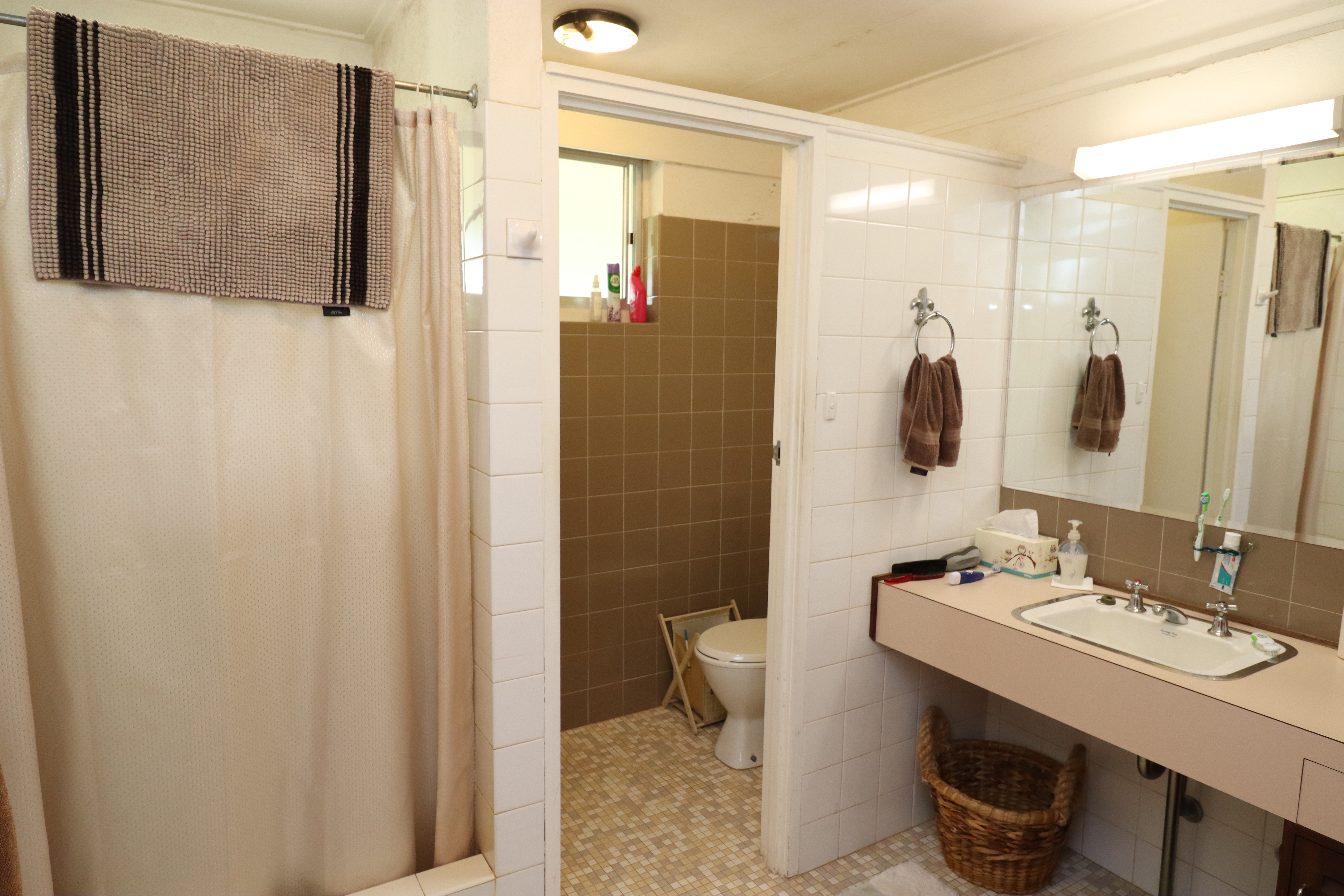 -	Tiled main bathroom with shower, vanity and toilet. Hallway linen.