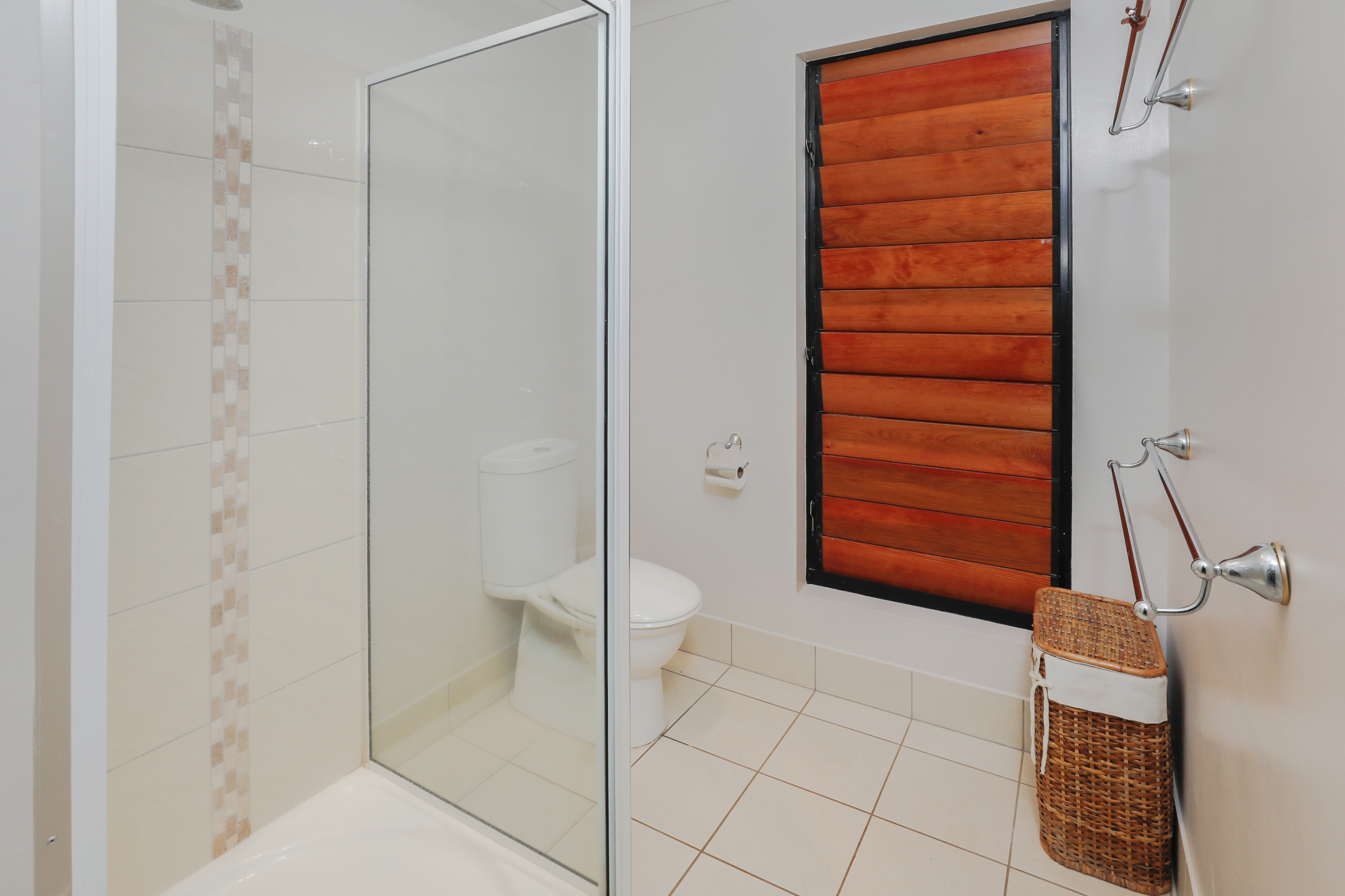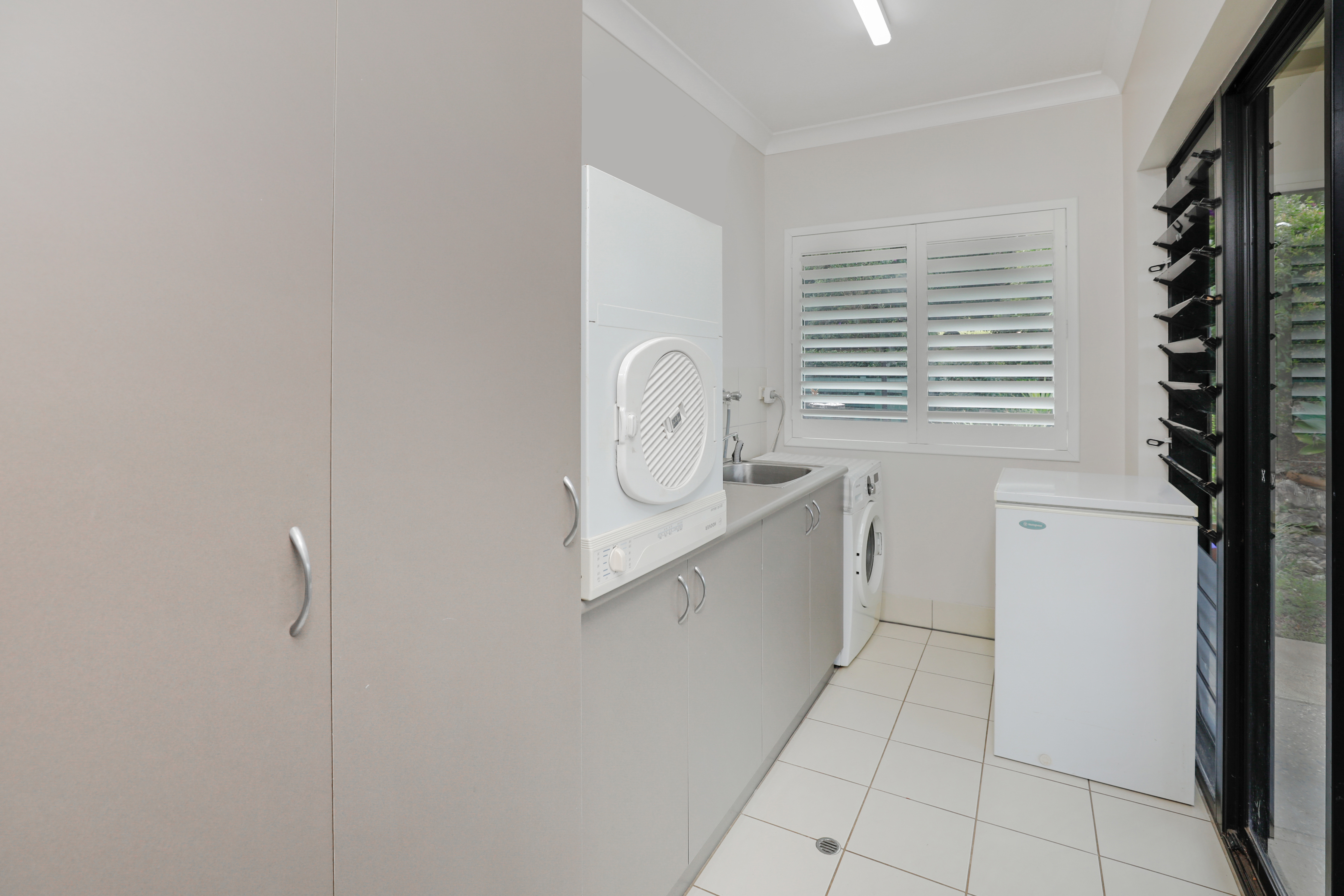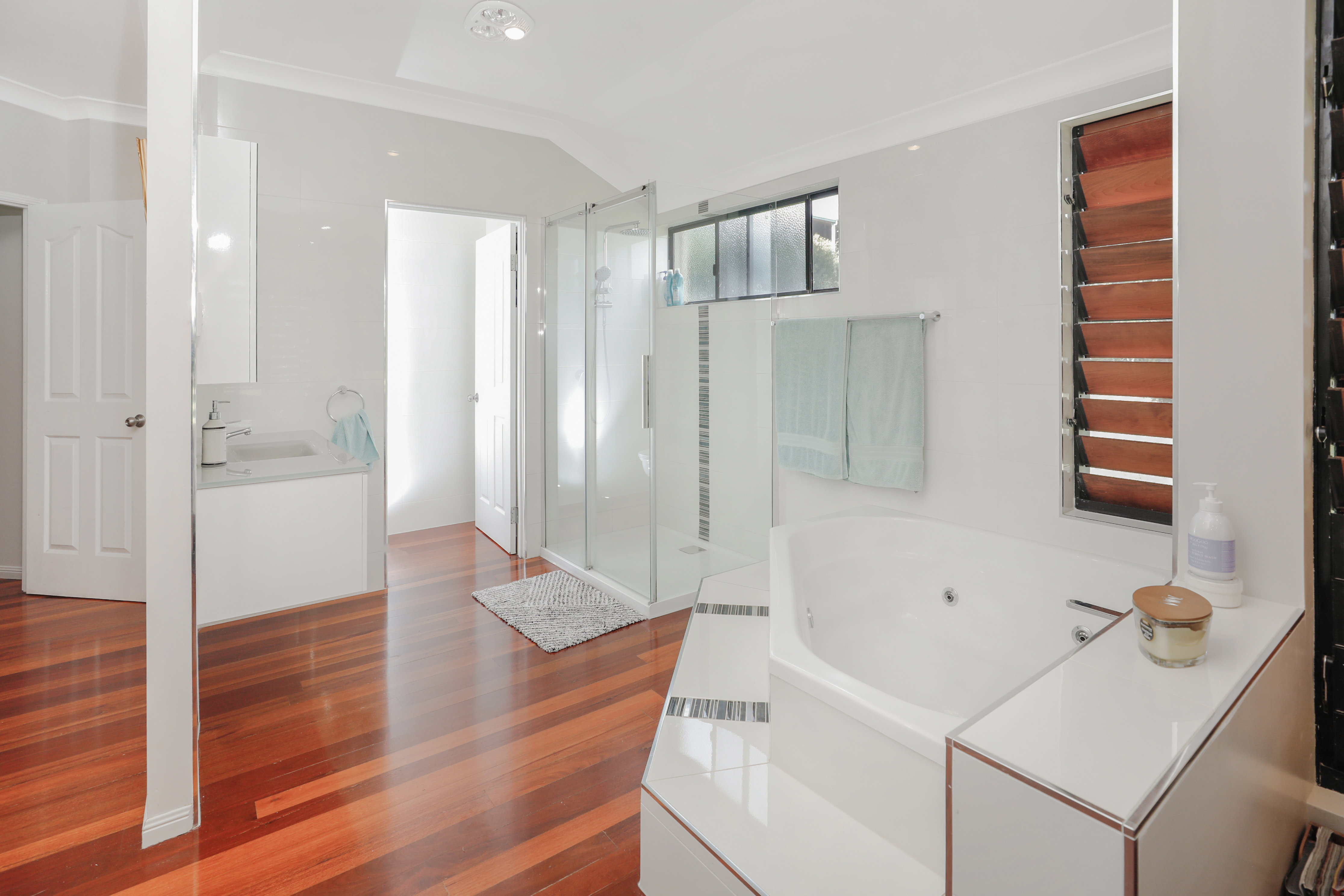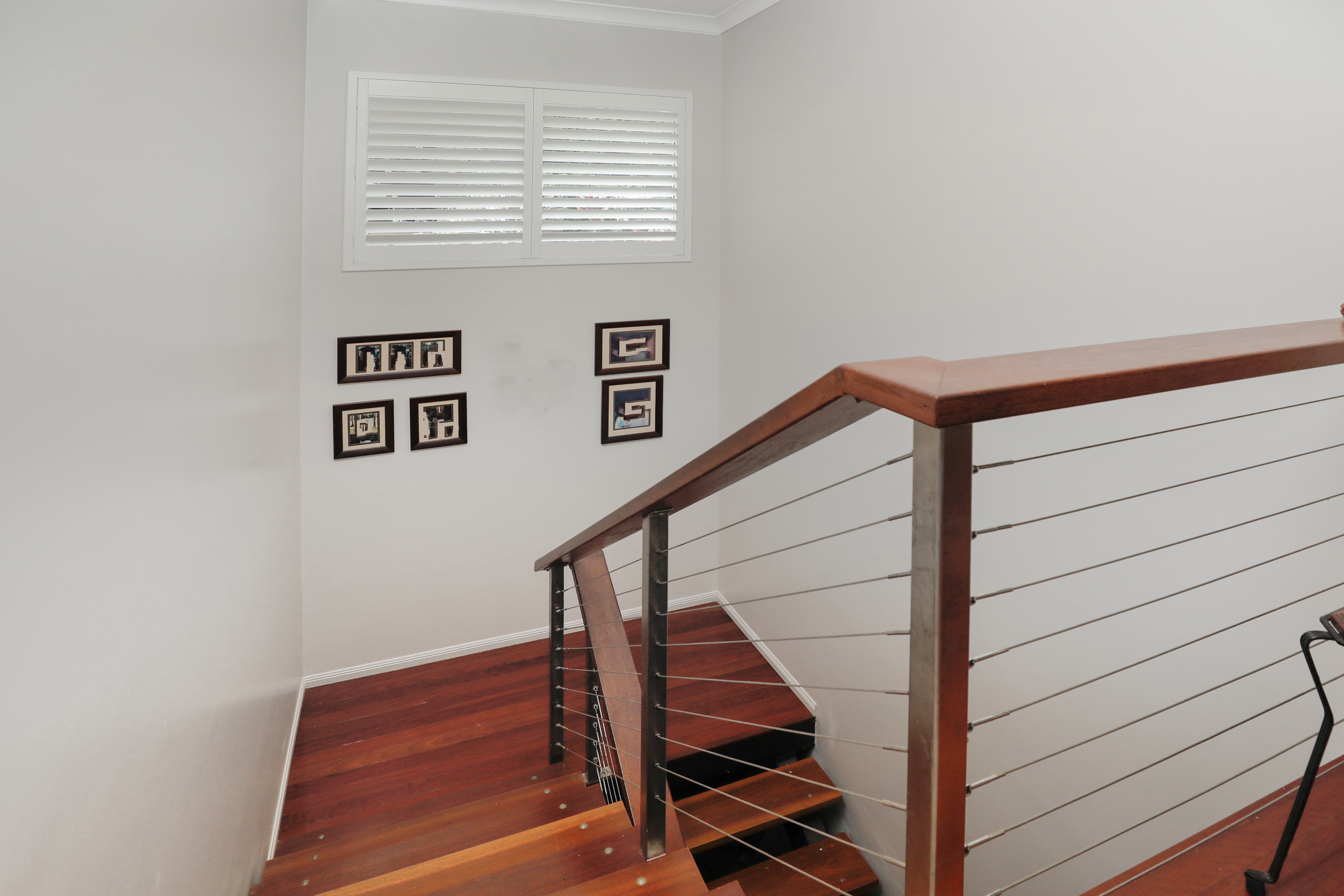 The top level also contains the master suite, which offers holiday vibes with stunning water views, bi-fold doors to the patio, a beautiful spa bath and open style ensuite with built in robes for storage. The second bedroom is fitted with a fan, built in robe and looks out to the manicured garden. The main bathroom is closely situated to the separate, spacious laundry and the hallway has cleverly incorporated 3 doors of linen storage.