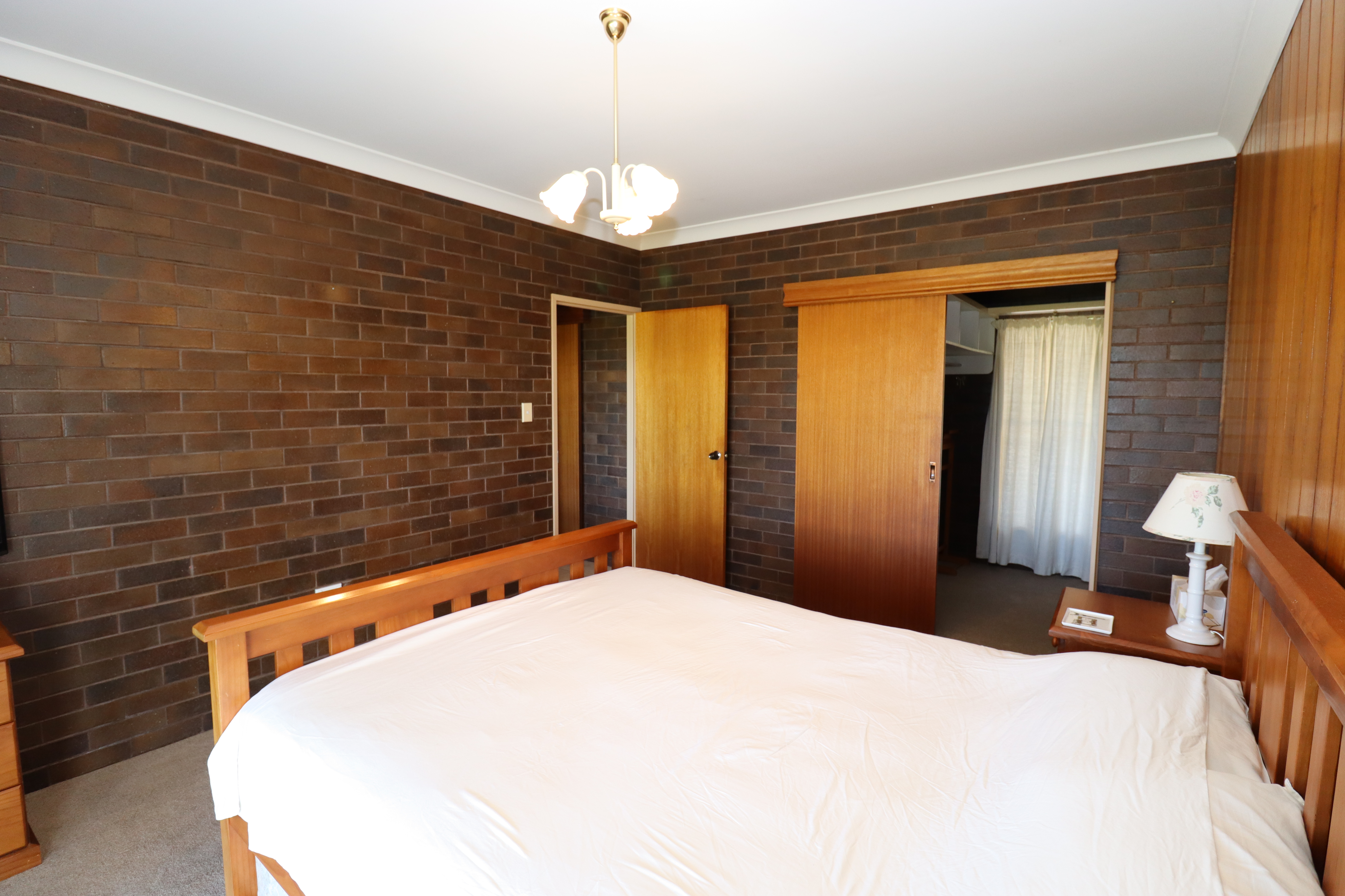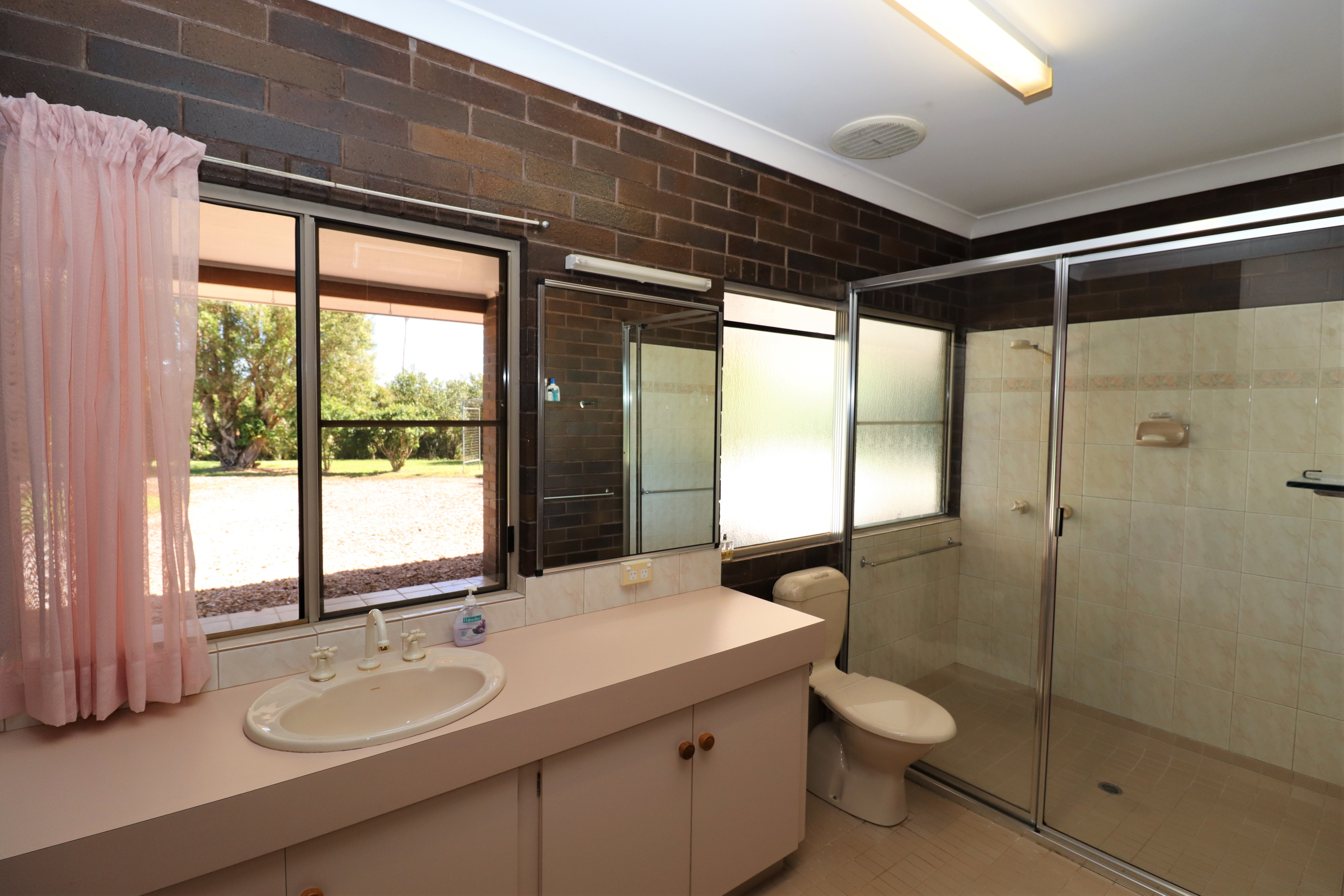 - Tiled bathroom with built in linen, large vanity & shower recess.