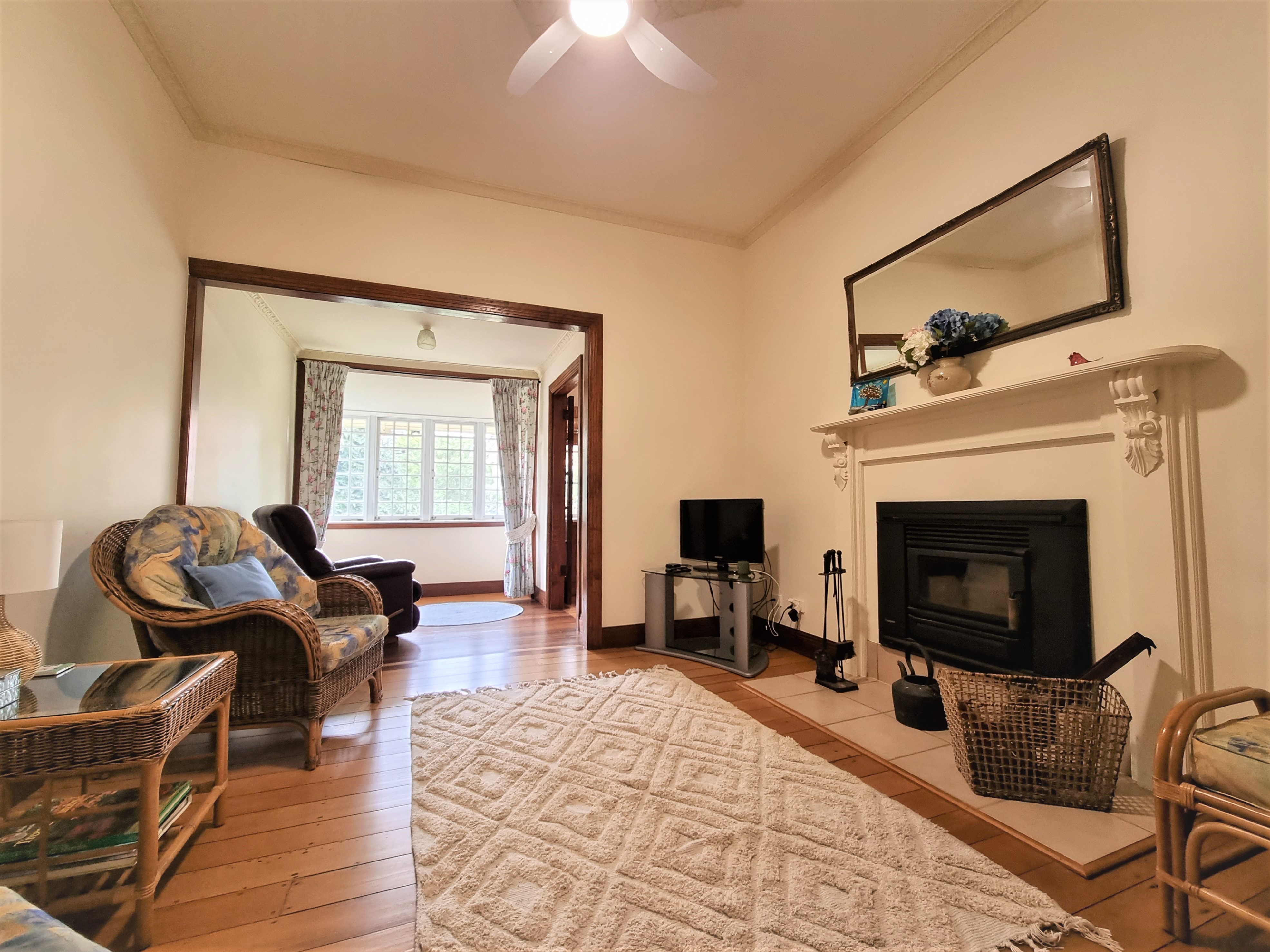 The second formal lounge features a wood heater built into the fire place with a classic mantle piece and tiled hearth.