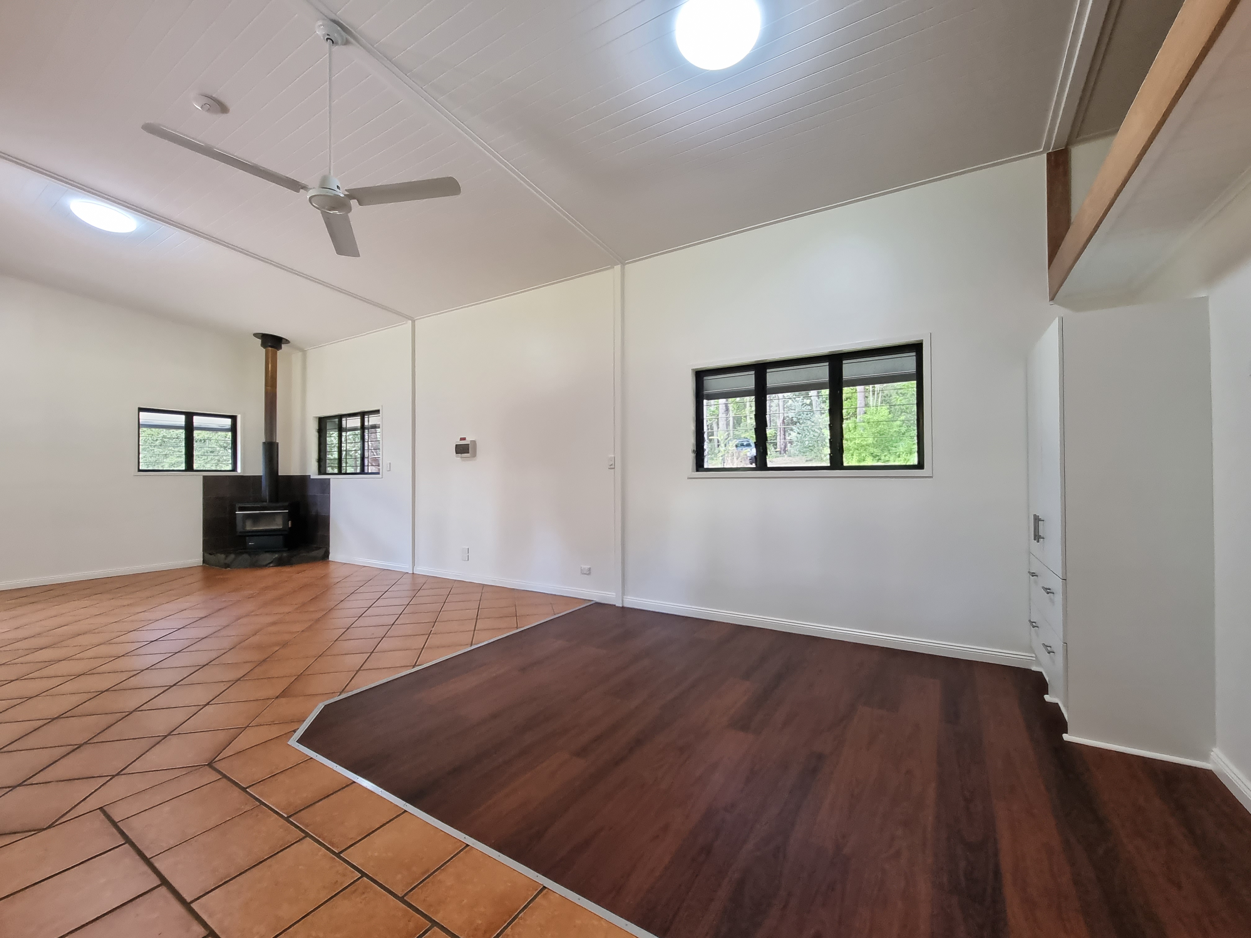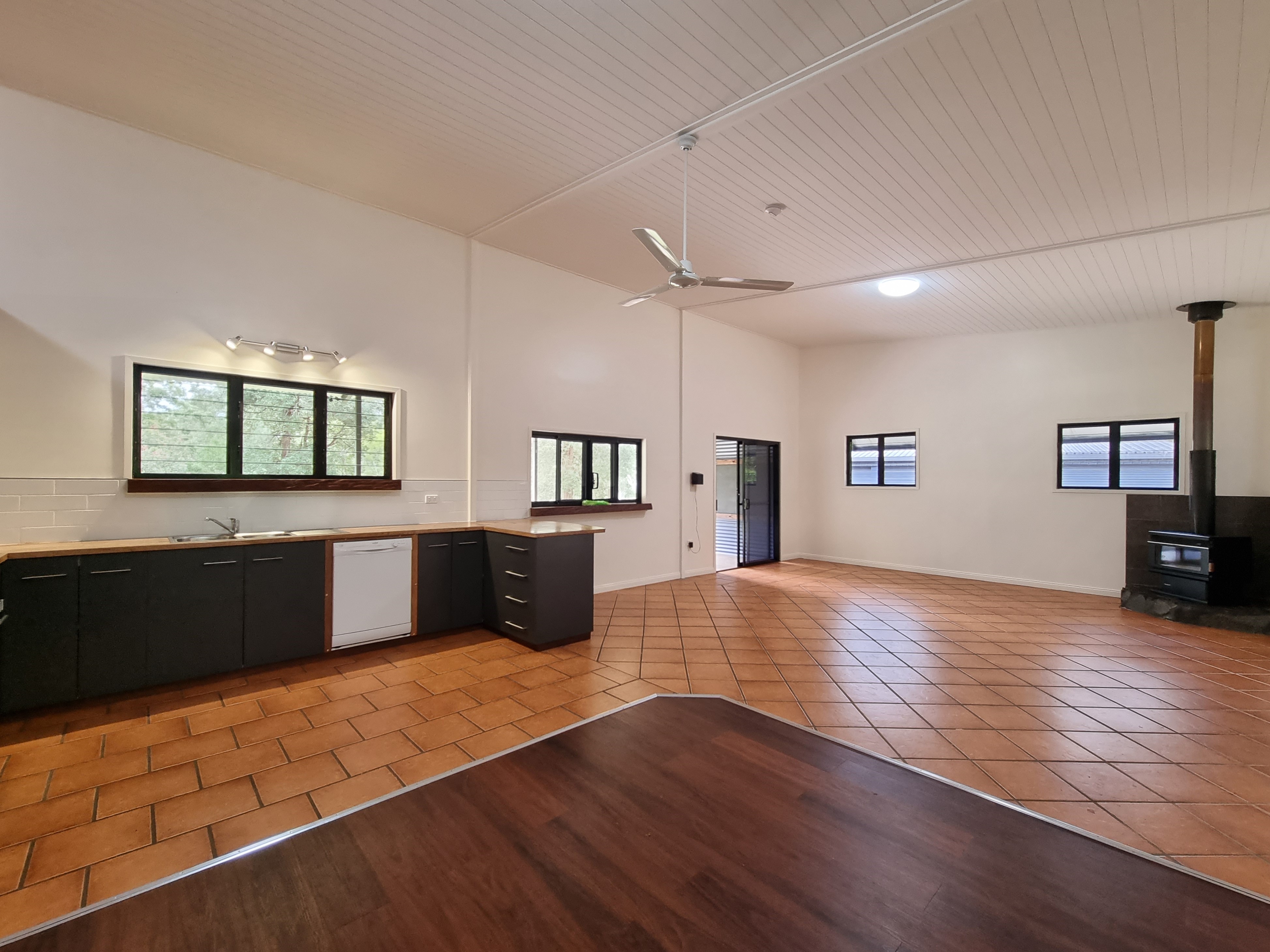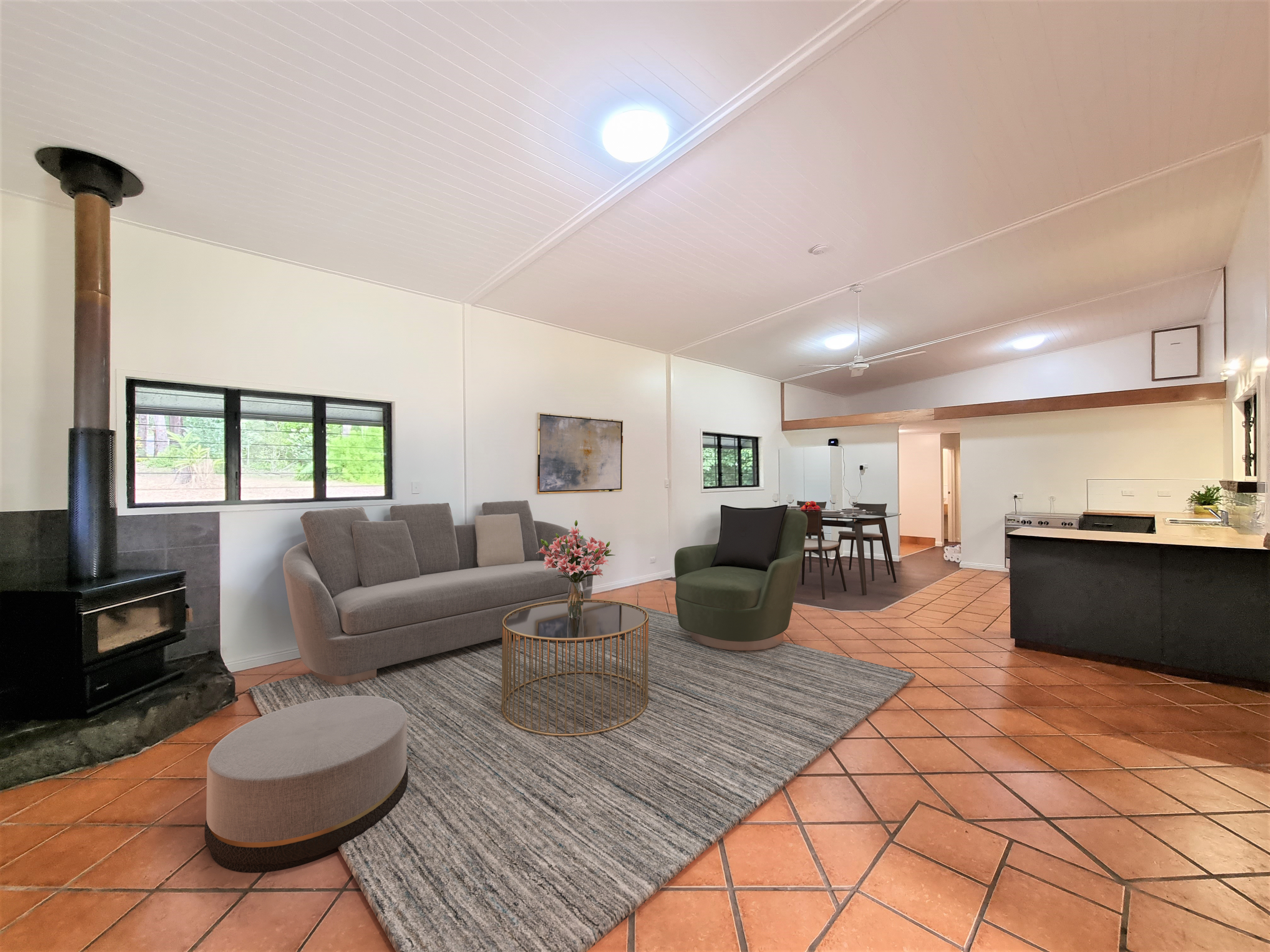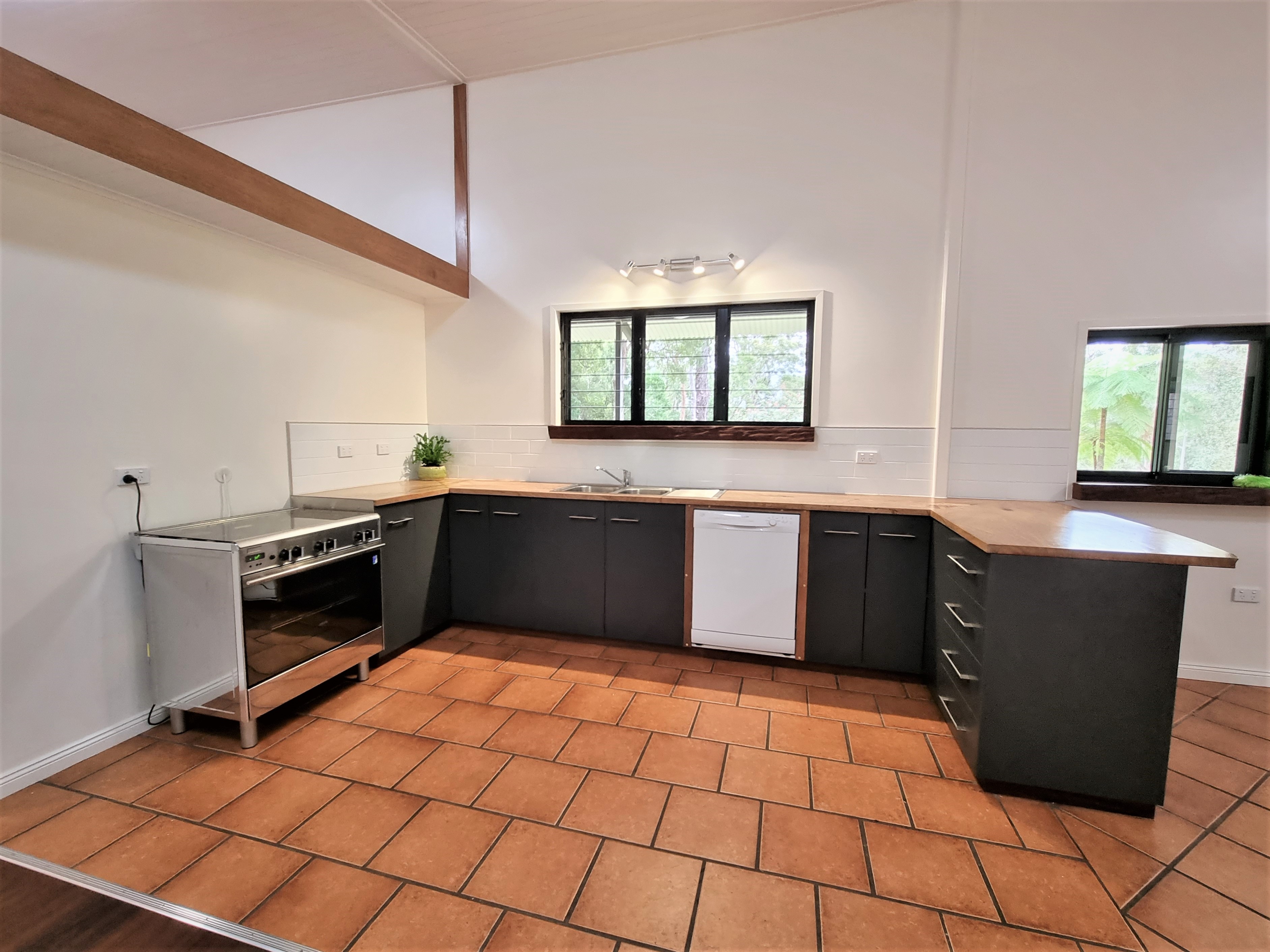 The modern kitchen offers blue gum bench tops cut from timber on the land, a dishwasher, pantry, a 5 burner gas stove and a server window opening to the 50m² tiled patio with lantern lighting where you can relax and entertain overlooking the fenced paddocks and forest surrounds.