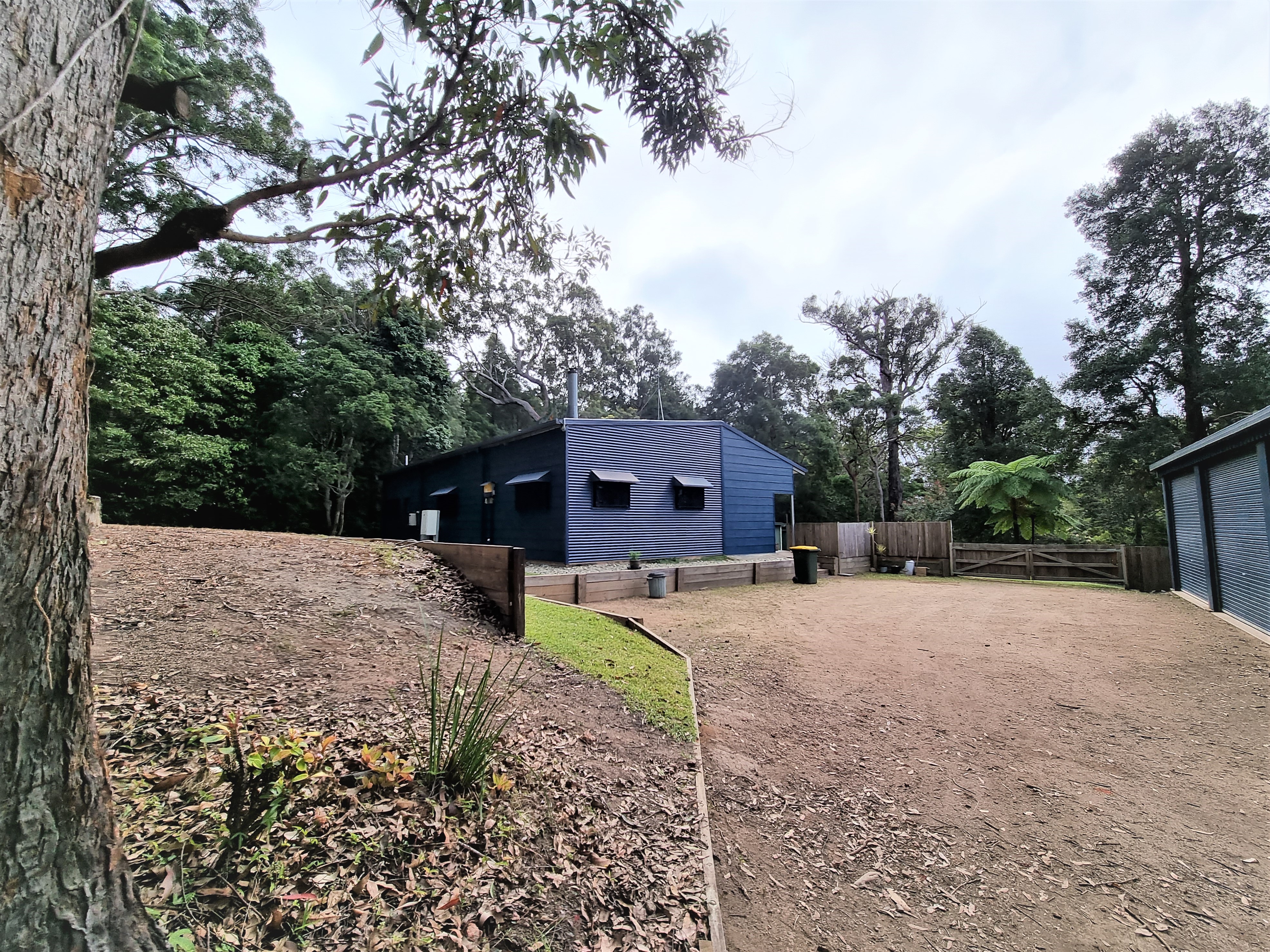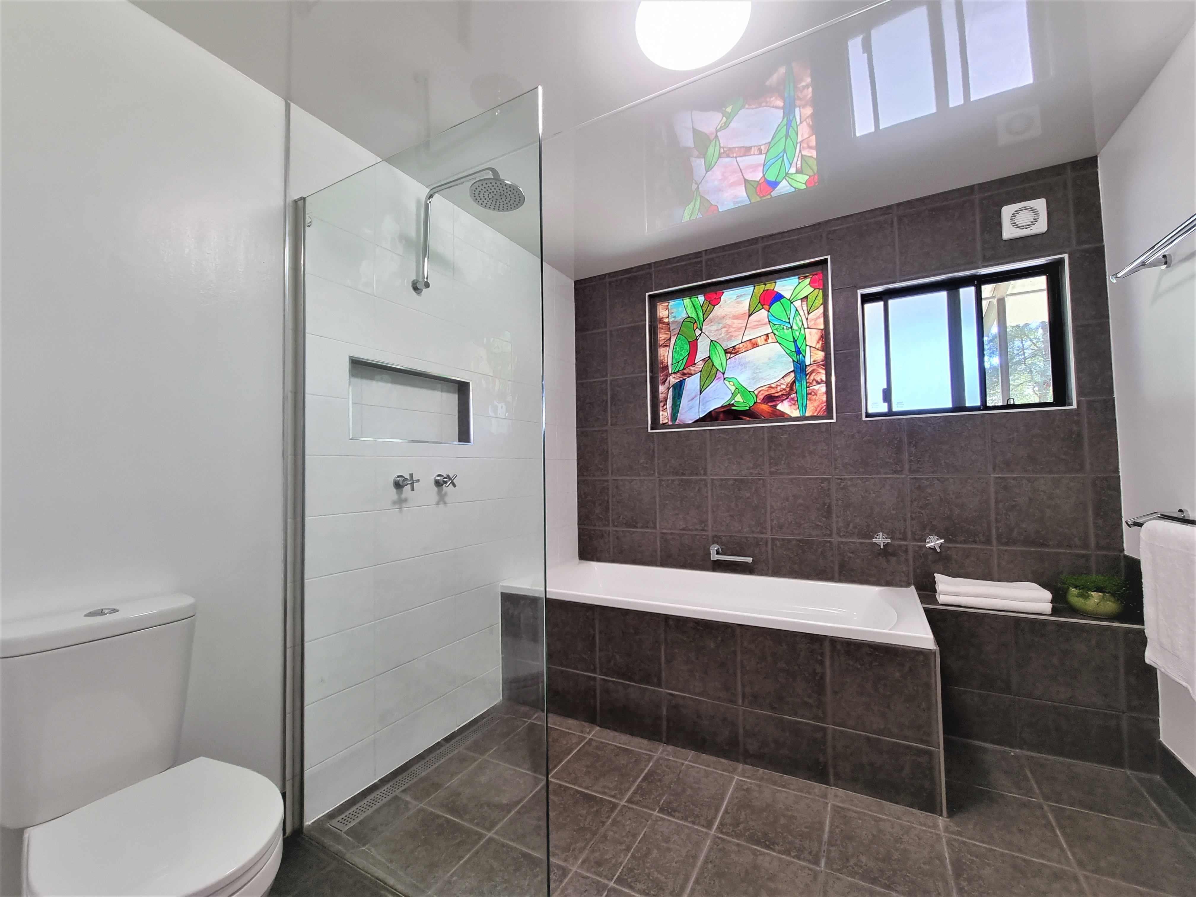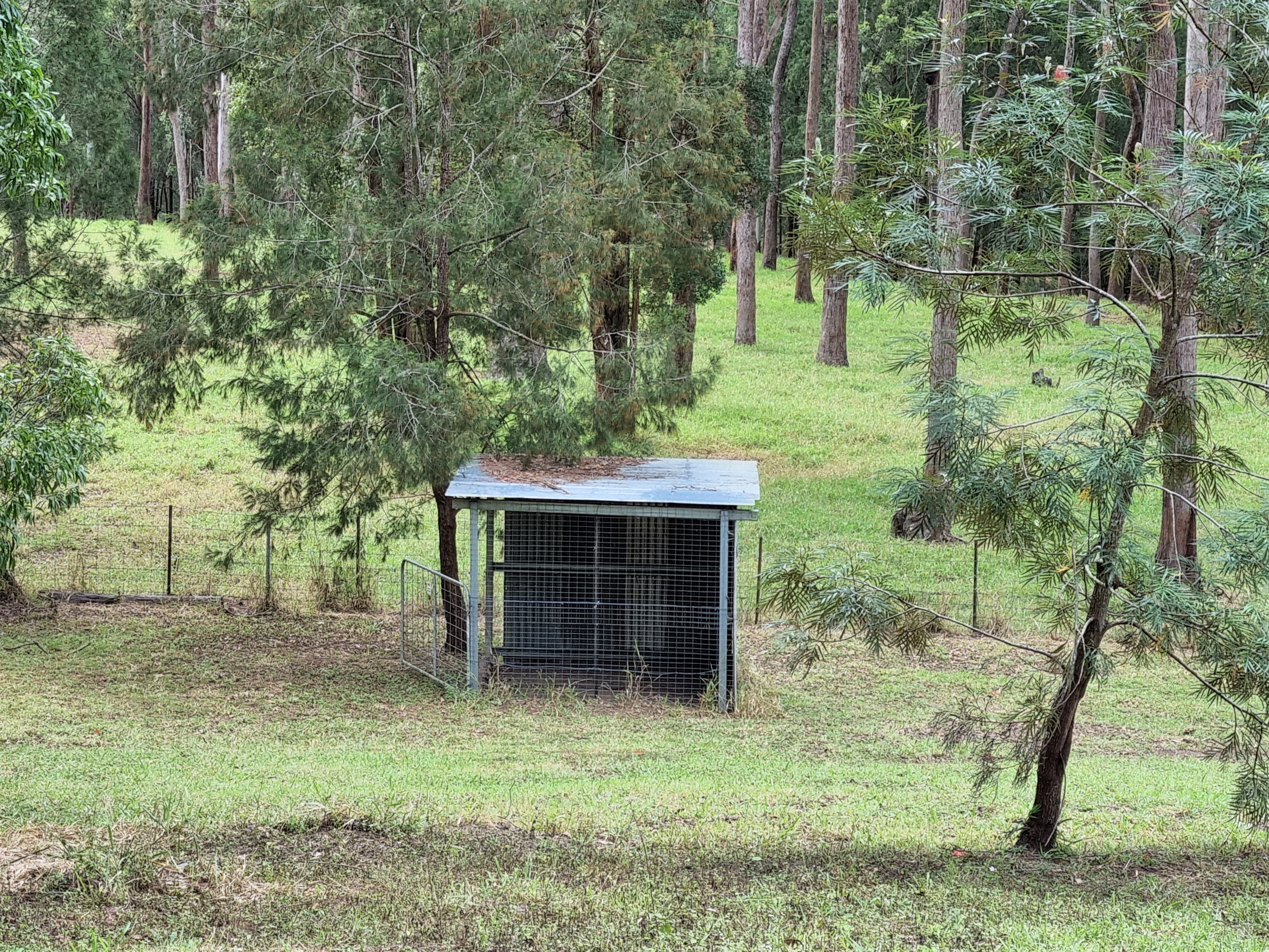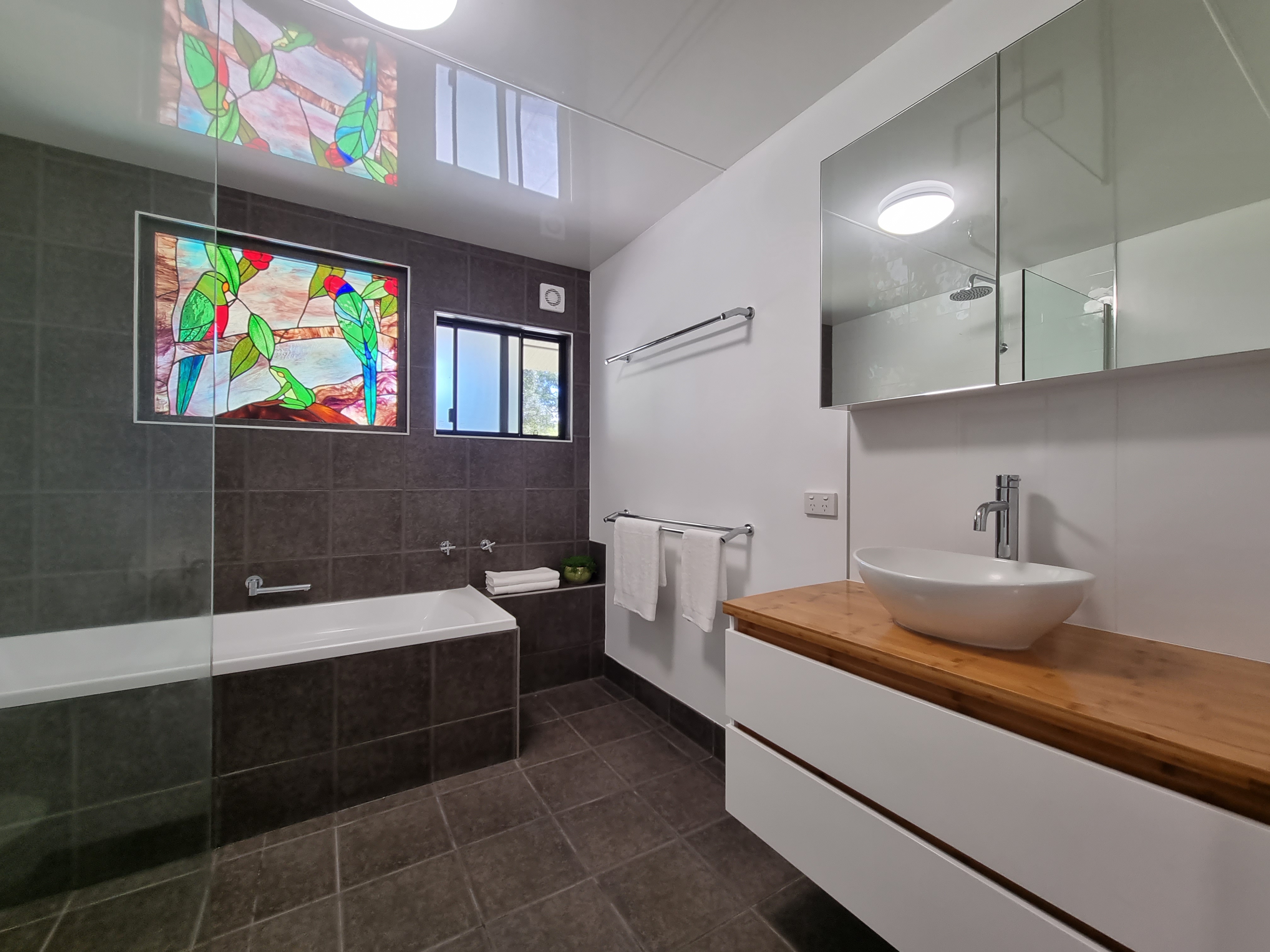 The modern kitchen offers blue gum bench tops cut from timber on the land, a dishwasher, pantry, a 5 burner gas stove and a server window opening to the 50m² tiled patio with lantern lighting where you can relax and entertain overlooking the fenced paddocks and forest surrounds.