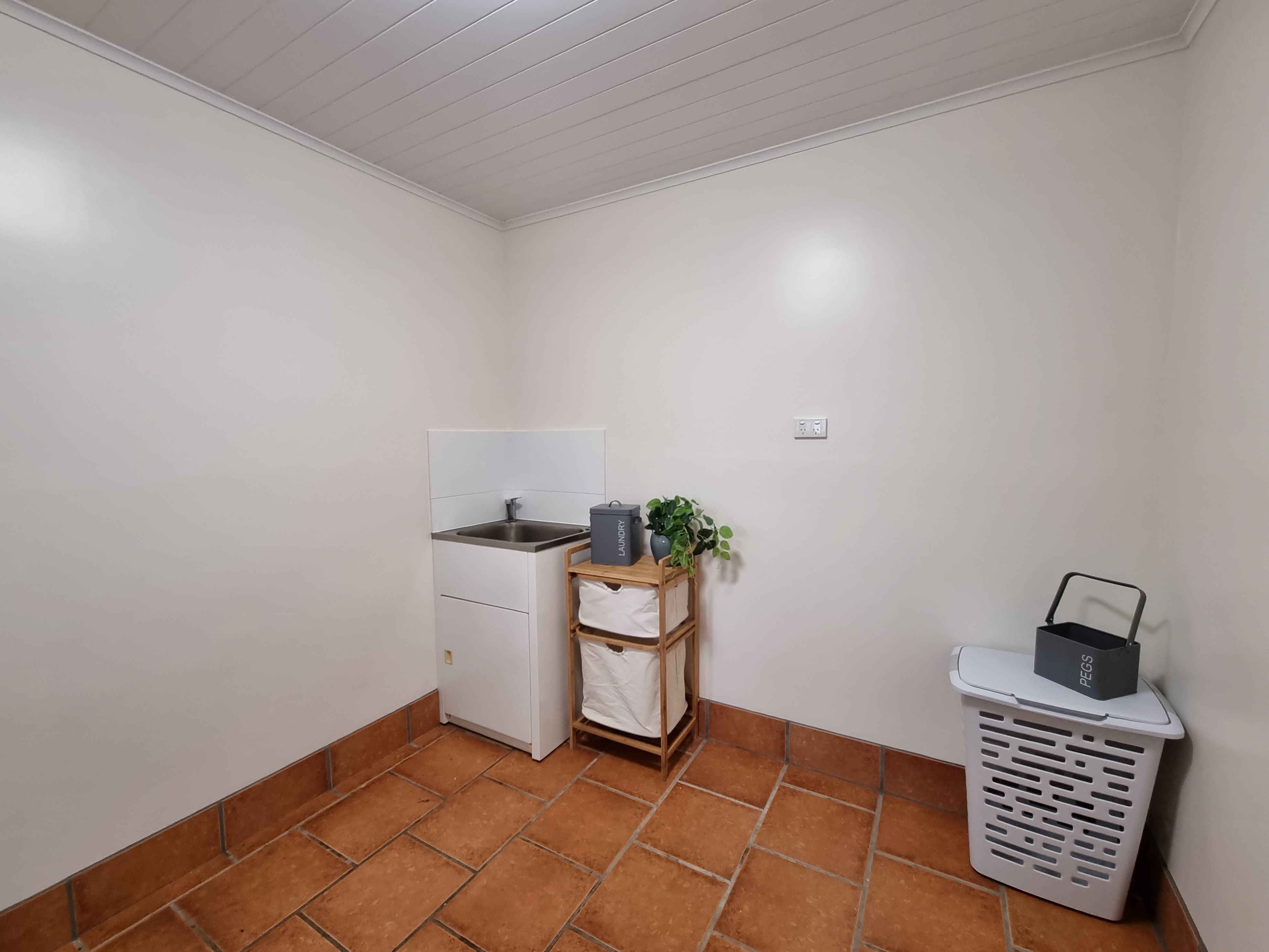 Further in there is a tiled laundry across the hall from a new bathroom which includes a full length bath, separate shower, toilet and vanity.