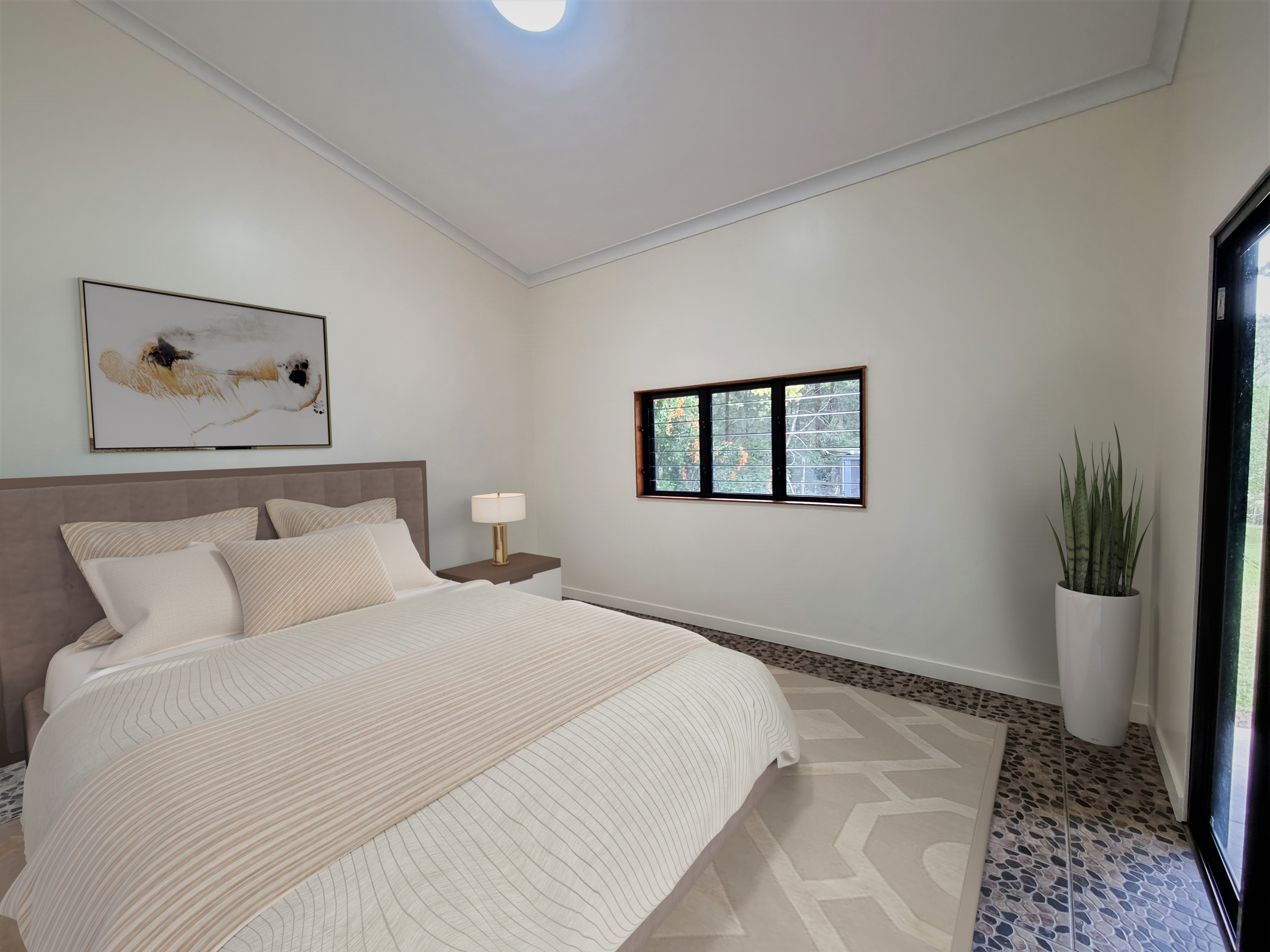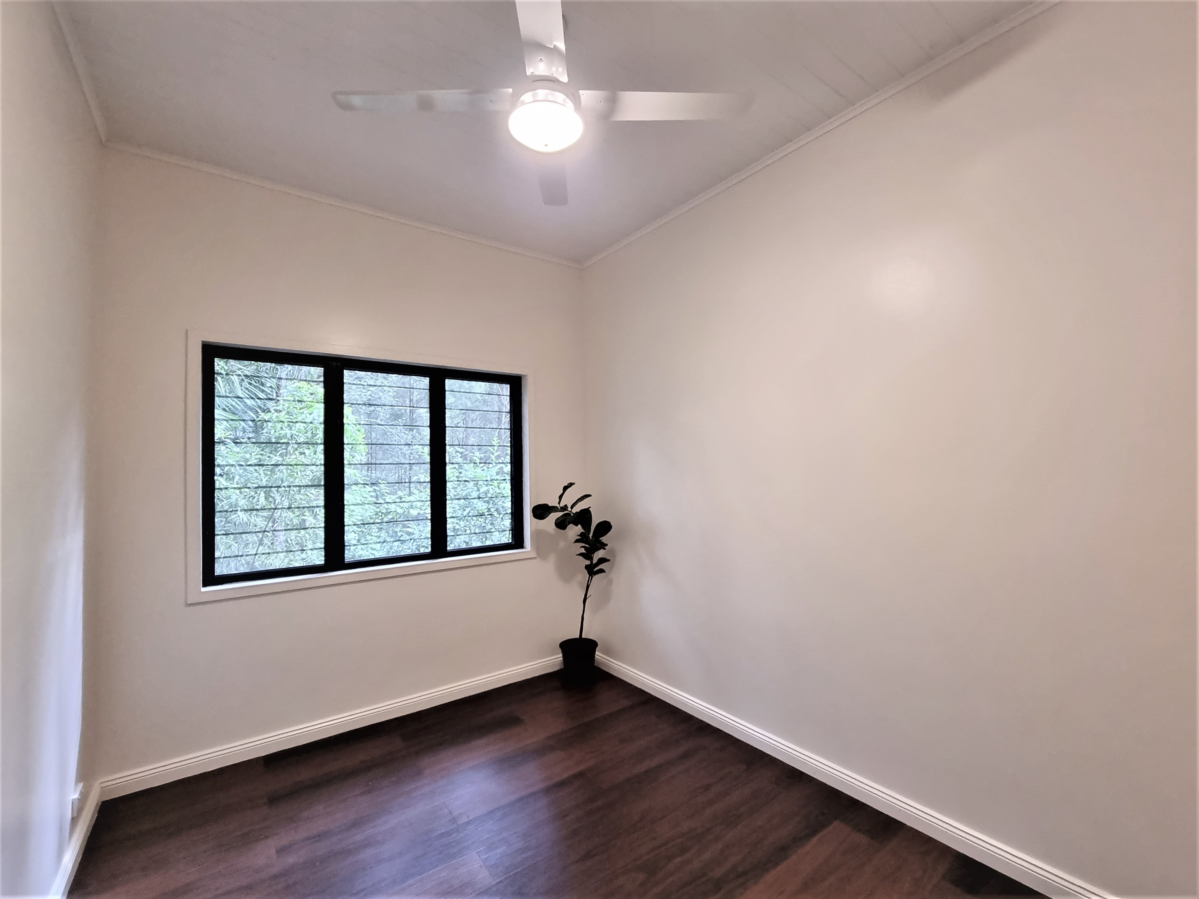 There is a second toilet and vanity adjacent to the two minor bedrooms that feature fans and louvered windows facing the established gardens.