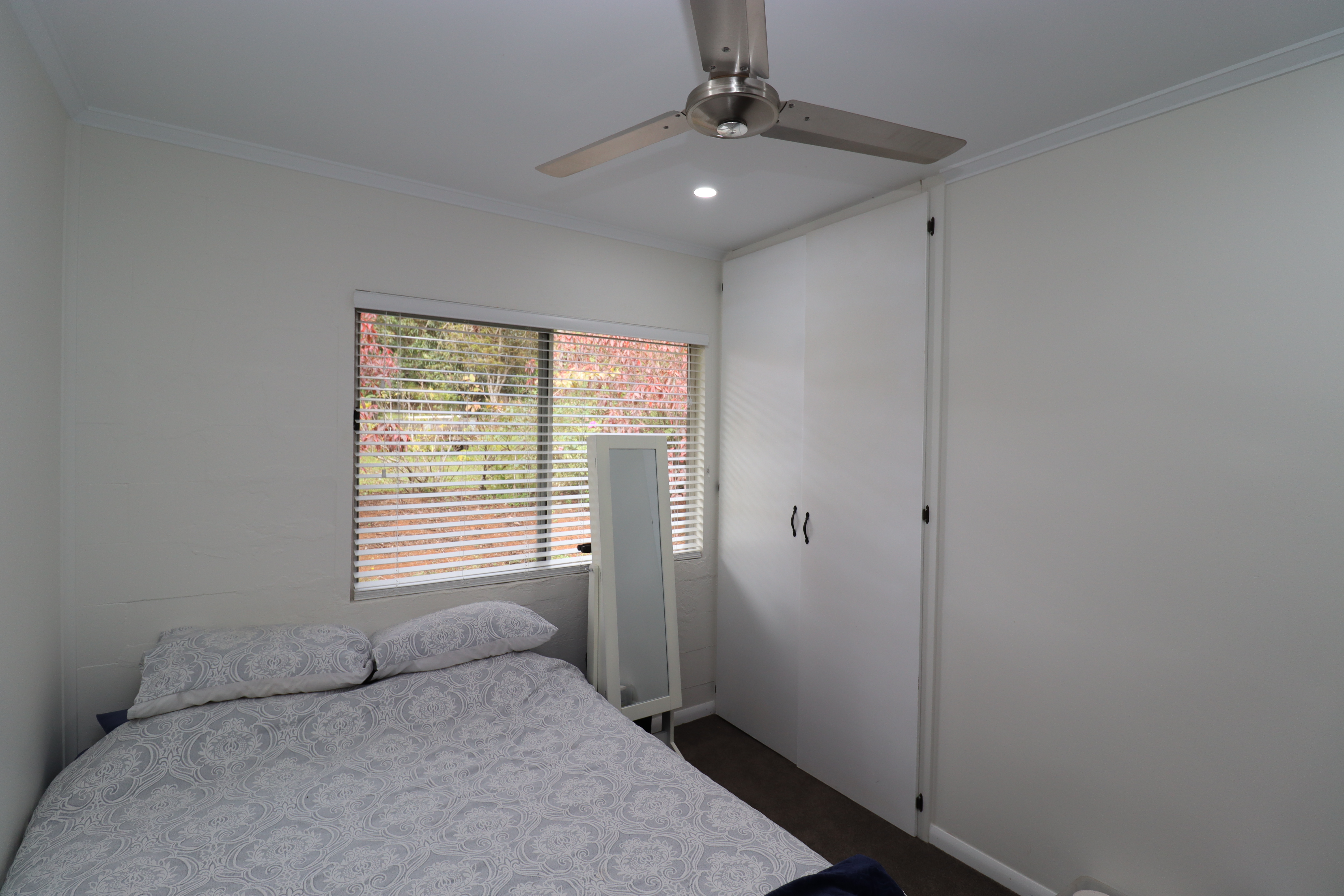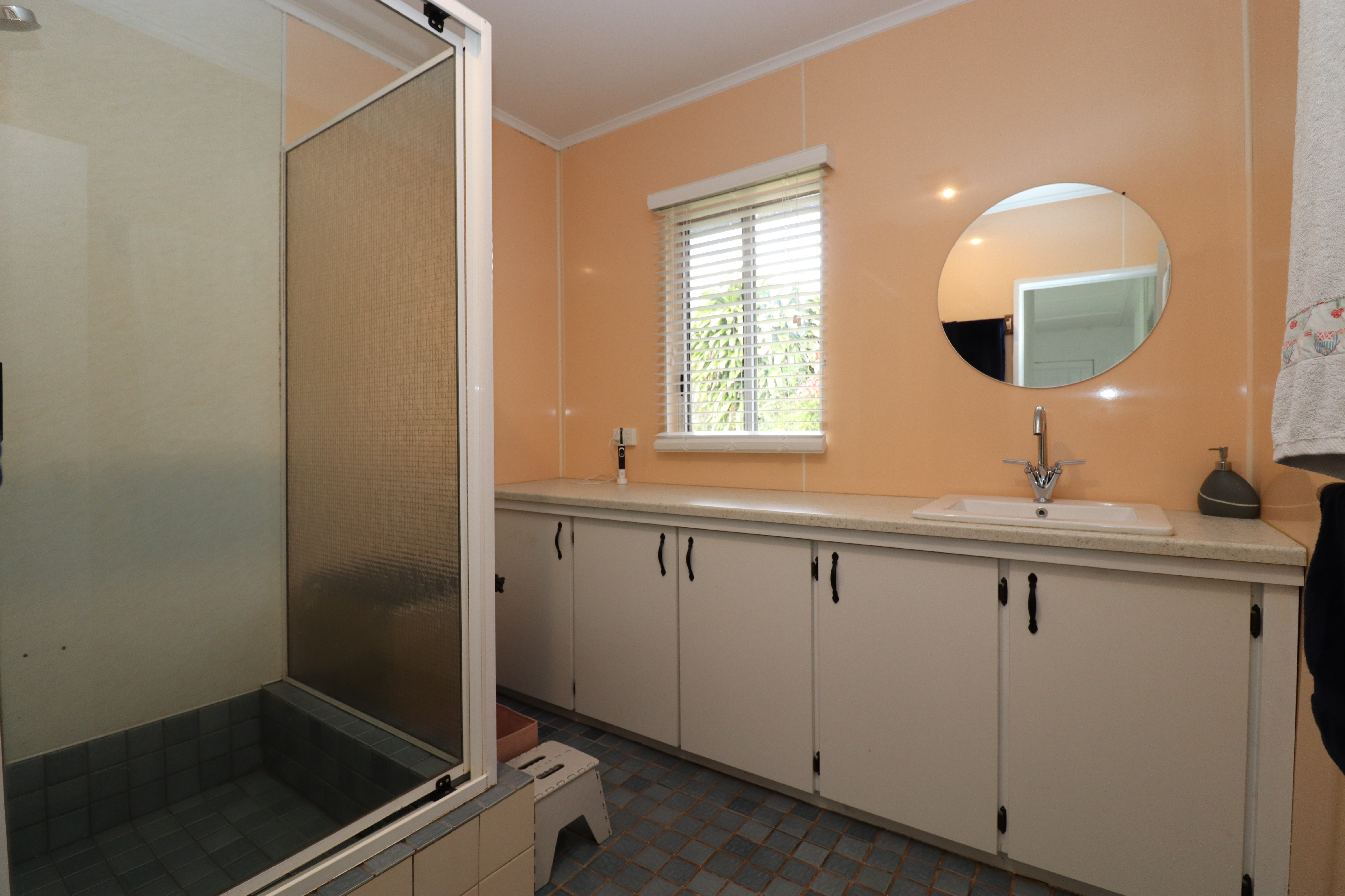 - Bathroom: Tiled with shower recess, large vanity and separate toilet.