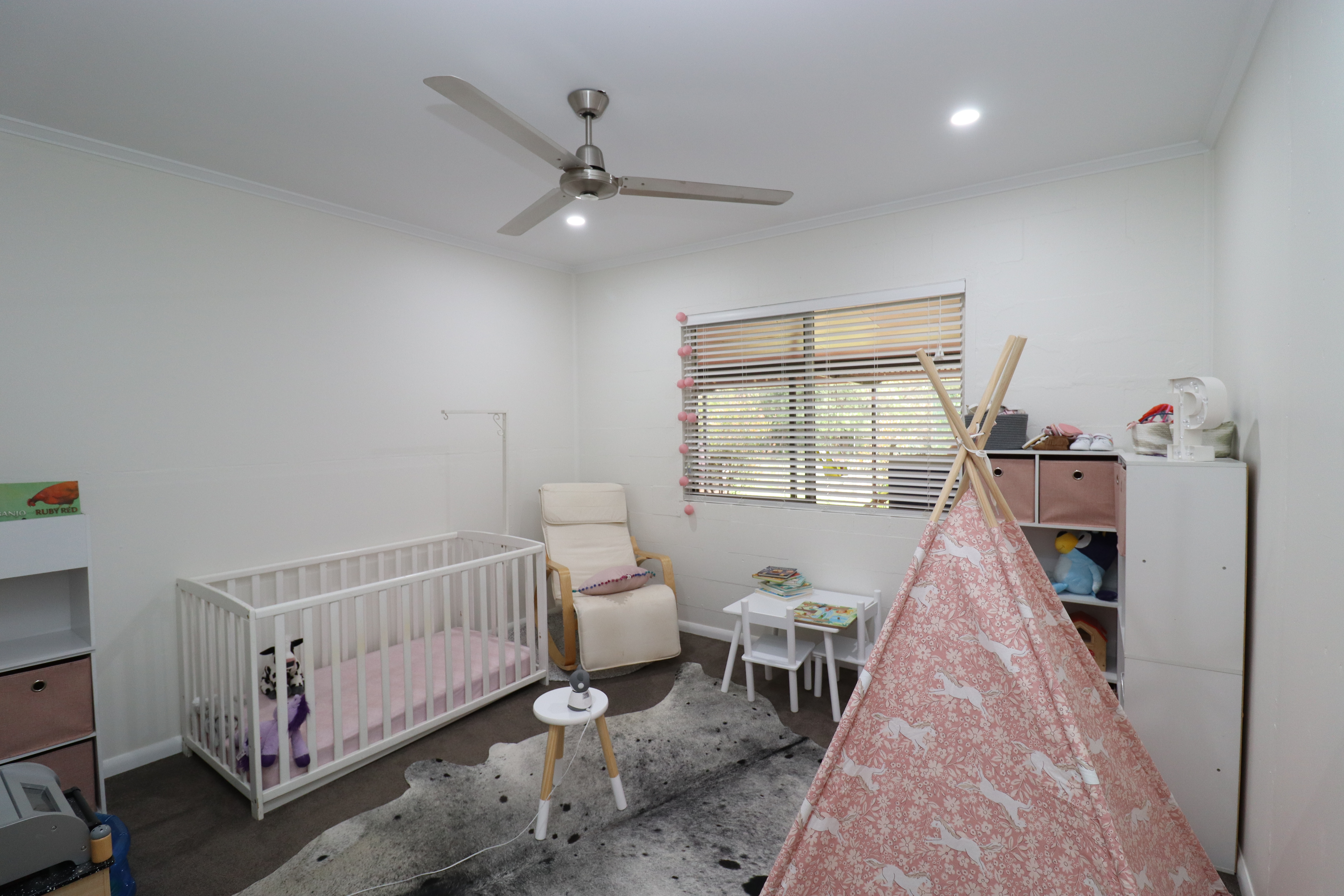 - Bedrooms: 4 spacious bedrooms with built-ins, ceiling fans, new carpet, freshly painted plus split system a/c to main.