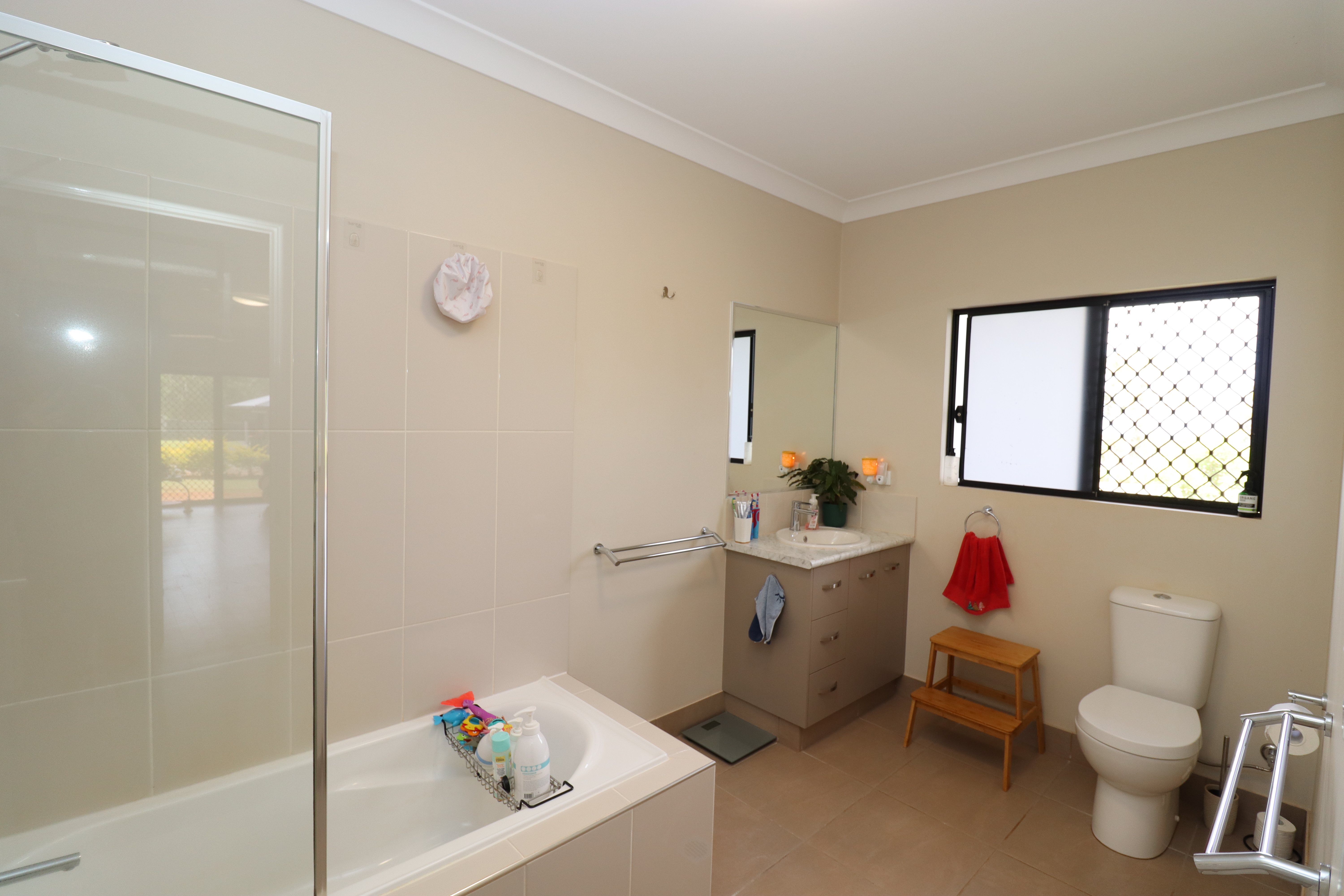 - Spacious tiled bathroom with shower over bath.