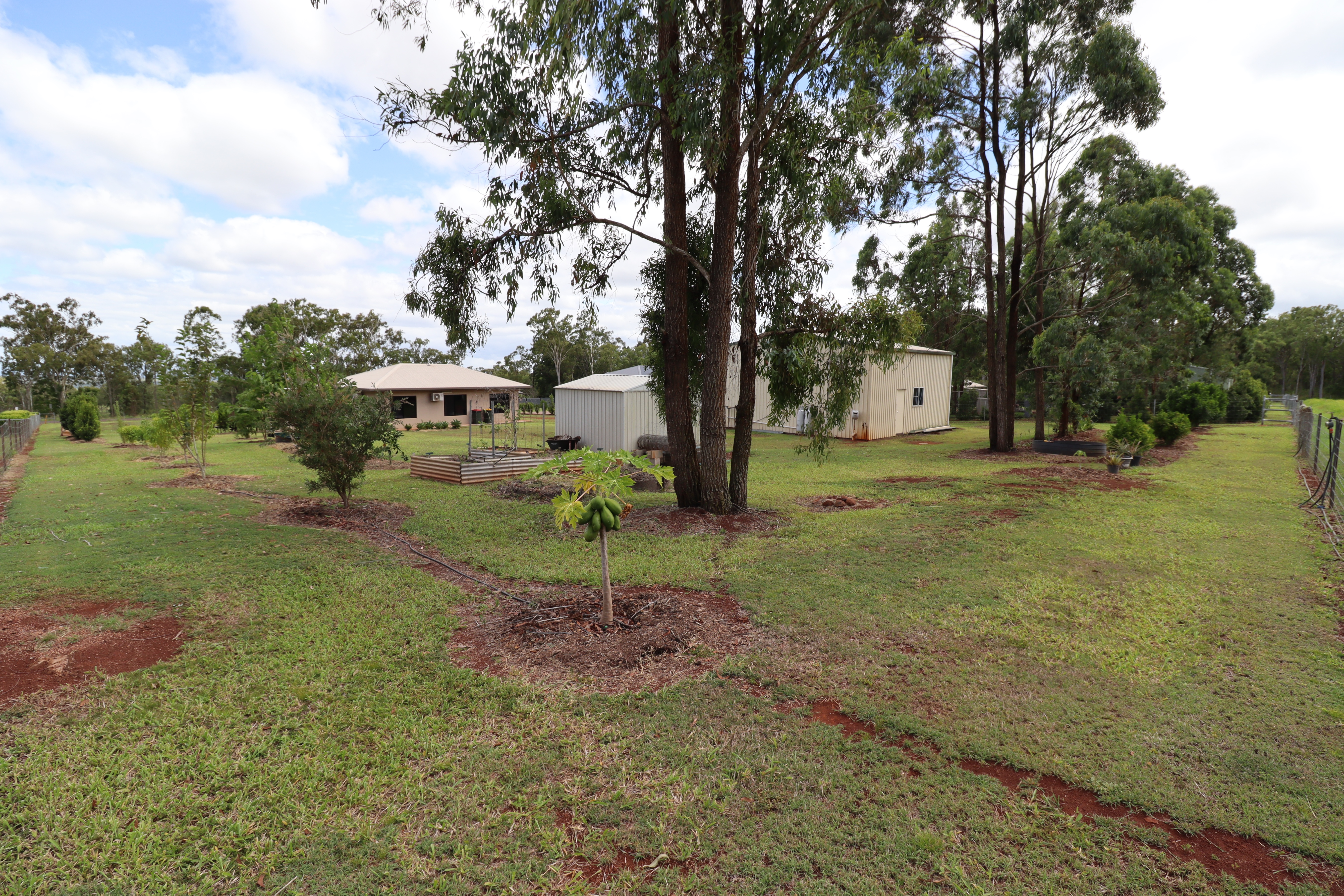 - Established fruit trees and raised garden beds.